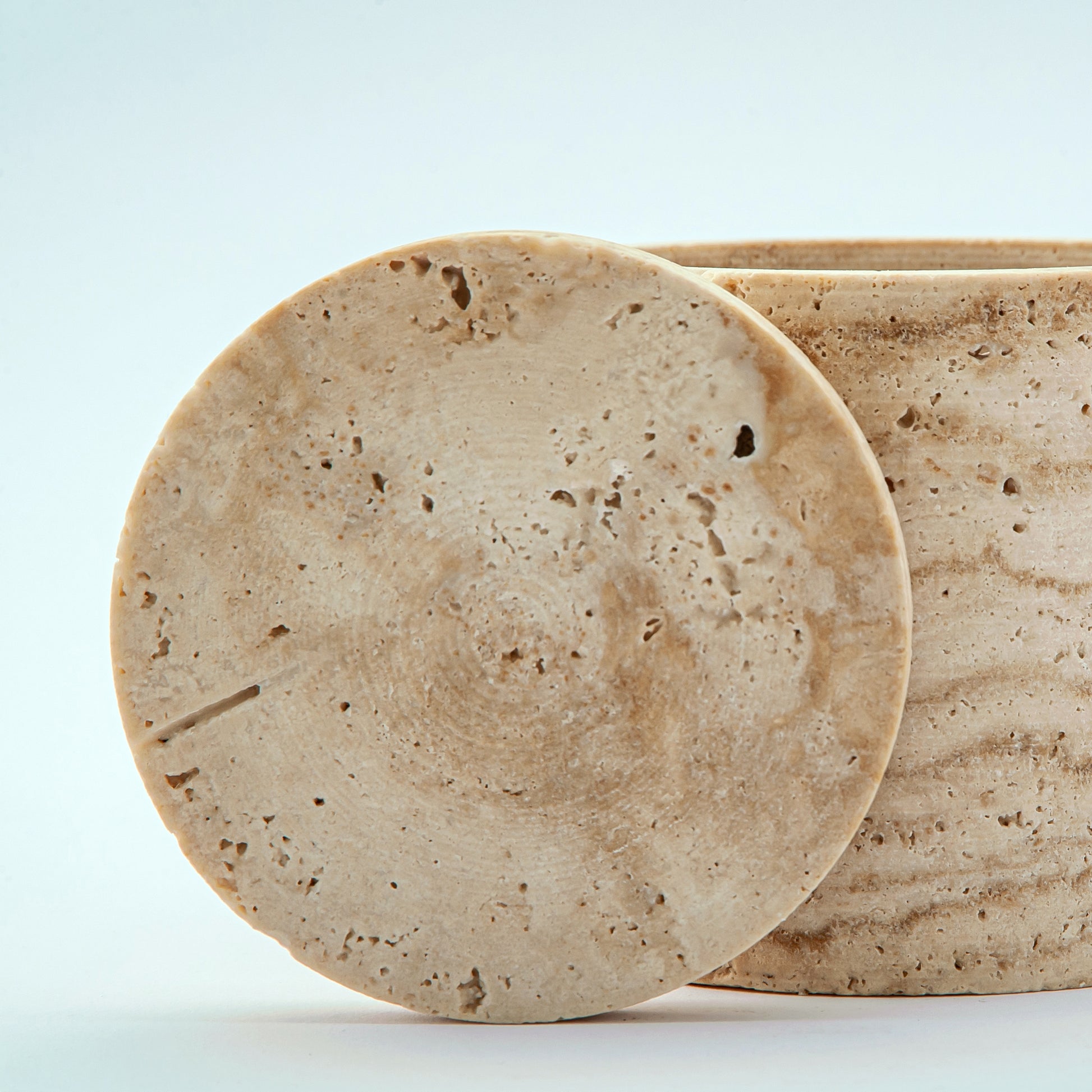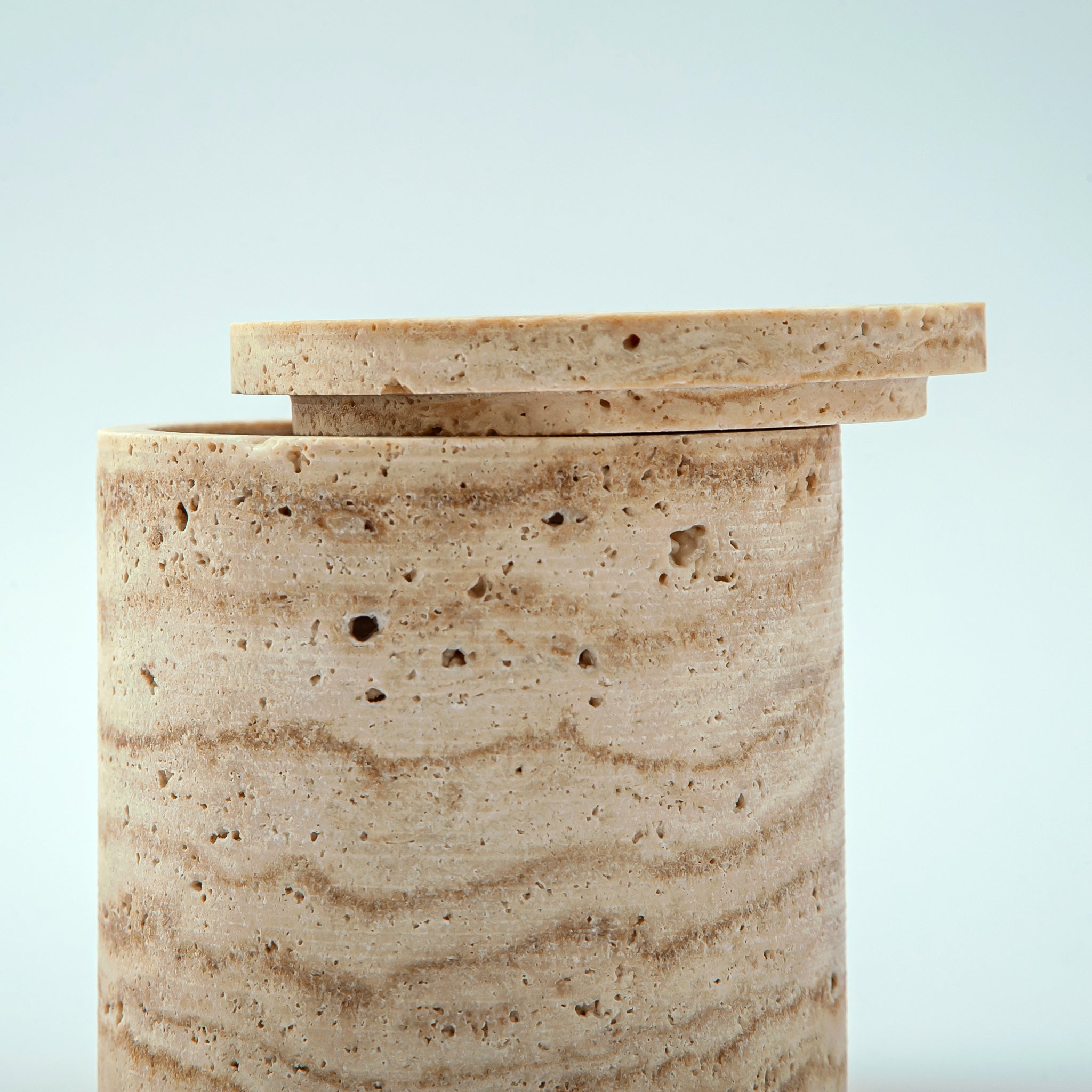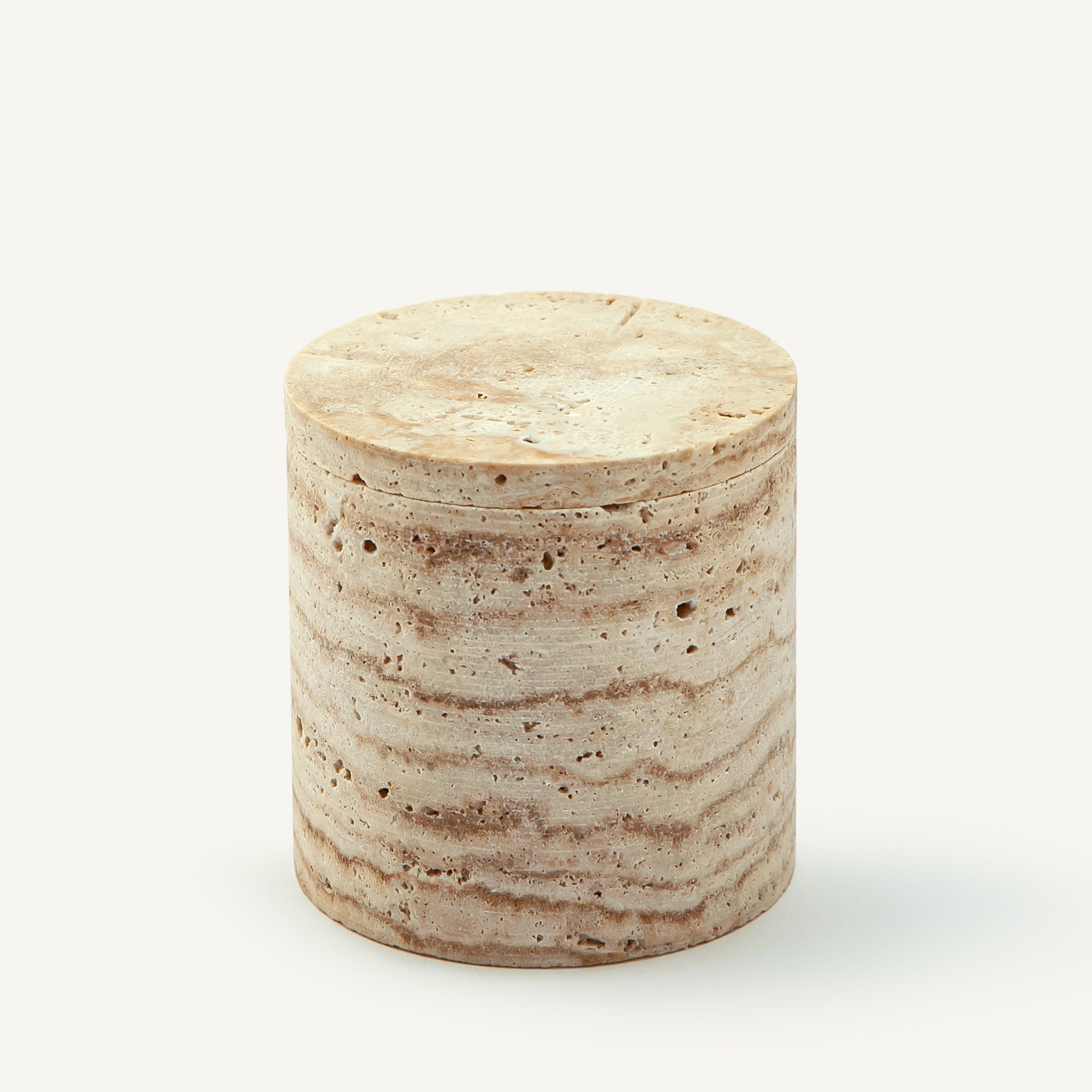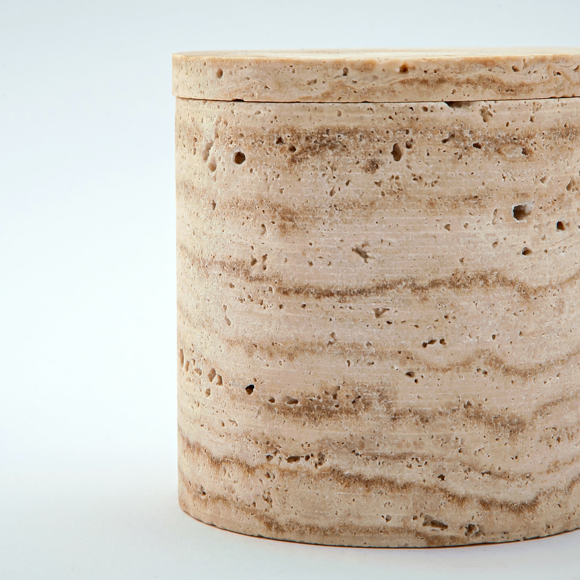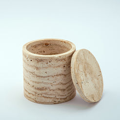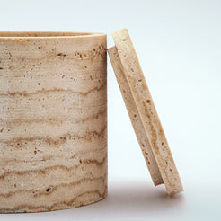 Das Scaltra Gefäß ist ein einzigartiges skulpturales Objekt, das in unserem Atelier aus einem seltenen Naturstein von Hand gefertigt wird. Seine warmen, erdigen Farbtöne und die feinen mineralischen Texturen unterstreichen die Authentizität des Materials. Definiert durch eine klare zylindrische Form mit passendem Deckel aus Stein ist jedes Stück ein absolutes Unikat – kein Exemplar gleicht dem anderen, und genau dieses Stück gehört ausschließlich Ihnen.