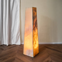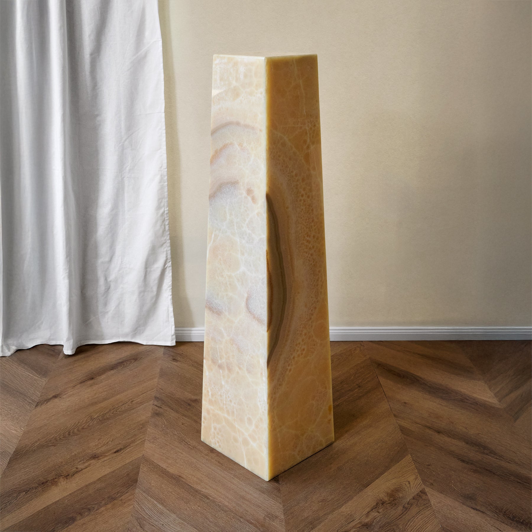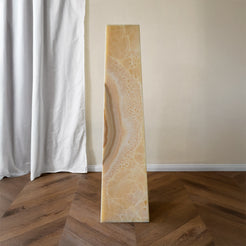 Alba ist ein skulpturales Podest, gefertigt aus handverlesenen Onyxplatten, ausgewählt für ihre leuchtende Transluzenz und ihre reiche, organische Maserung. Von Natur aus lichtdurchlässig entfaltet der Stein bei Beleuchtung eine warme, sanft glühende Tiefe und verwandelt das Objekt in eine stille Quelle von Licht und Atmosphäre. Auch unbeleuchtet verleihen die klaren Proportionen und die vielschichtigen Strukturen Alba eine ruhige, zugleich ausdrucksstarke architektonische Präsenz.