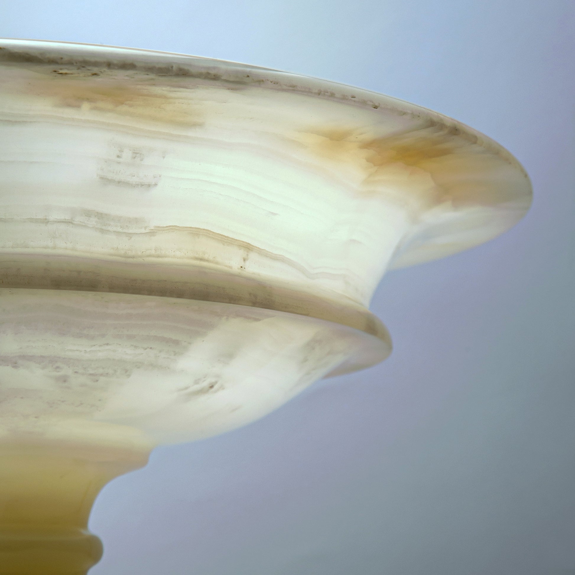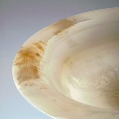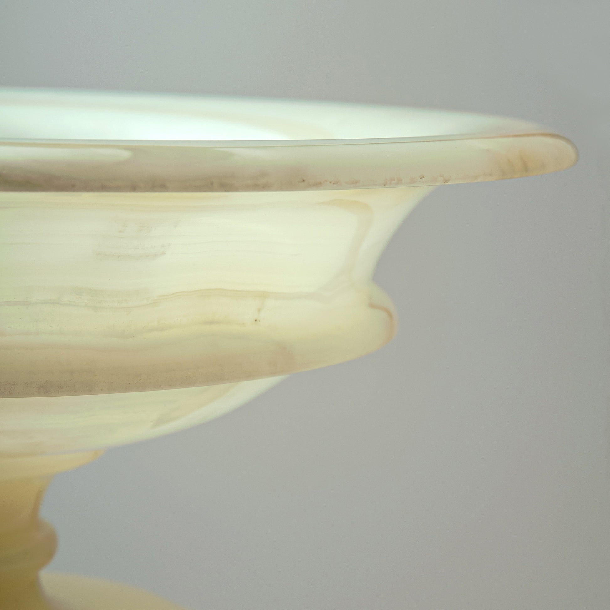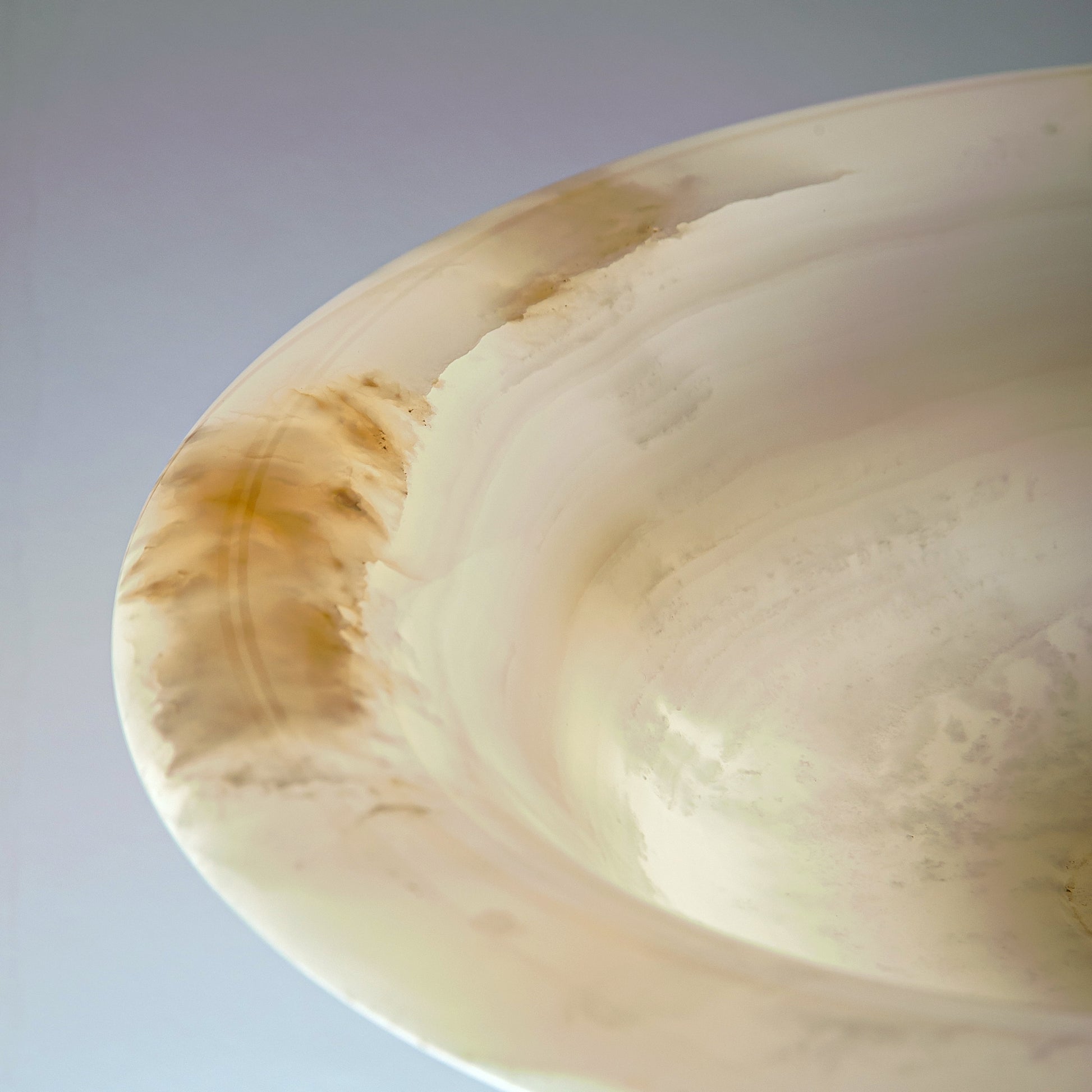 Seine weichen, milchigen Farbtöne und die feine Maserung betonen die organische Schönheit des Materials, geformt zu einer eleganten Schale, die auf einem sanften Sockel ruht.