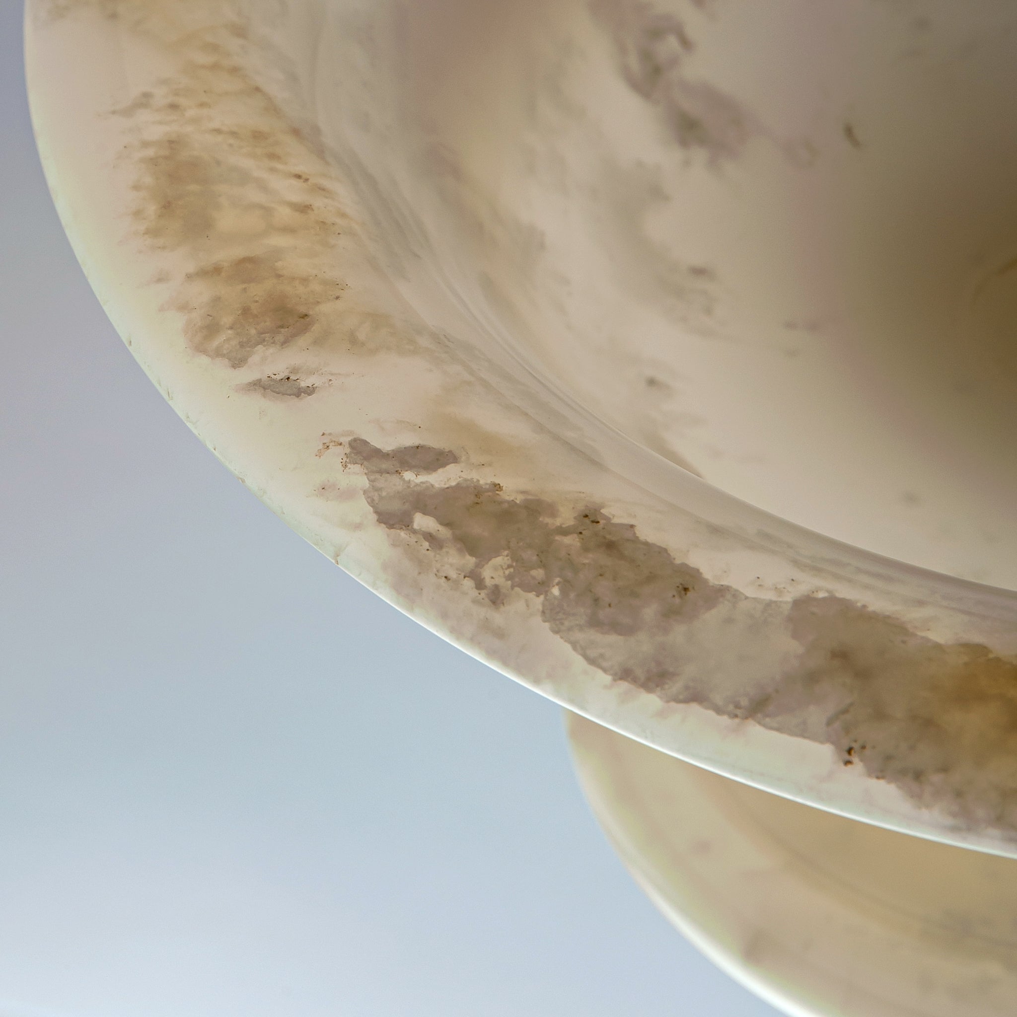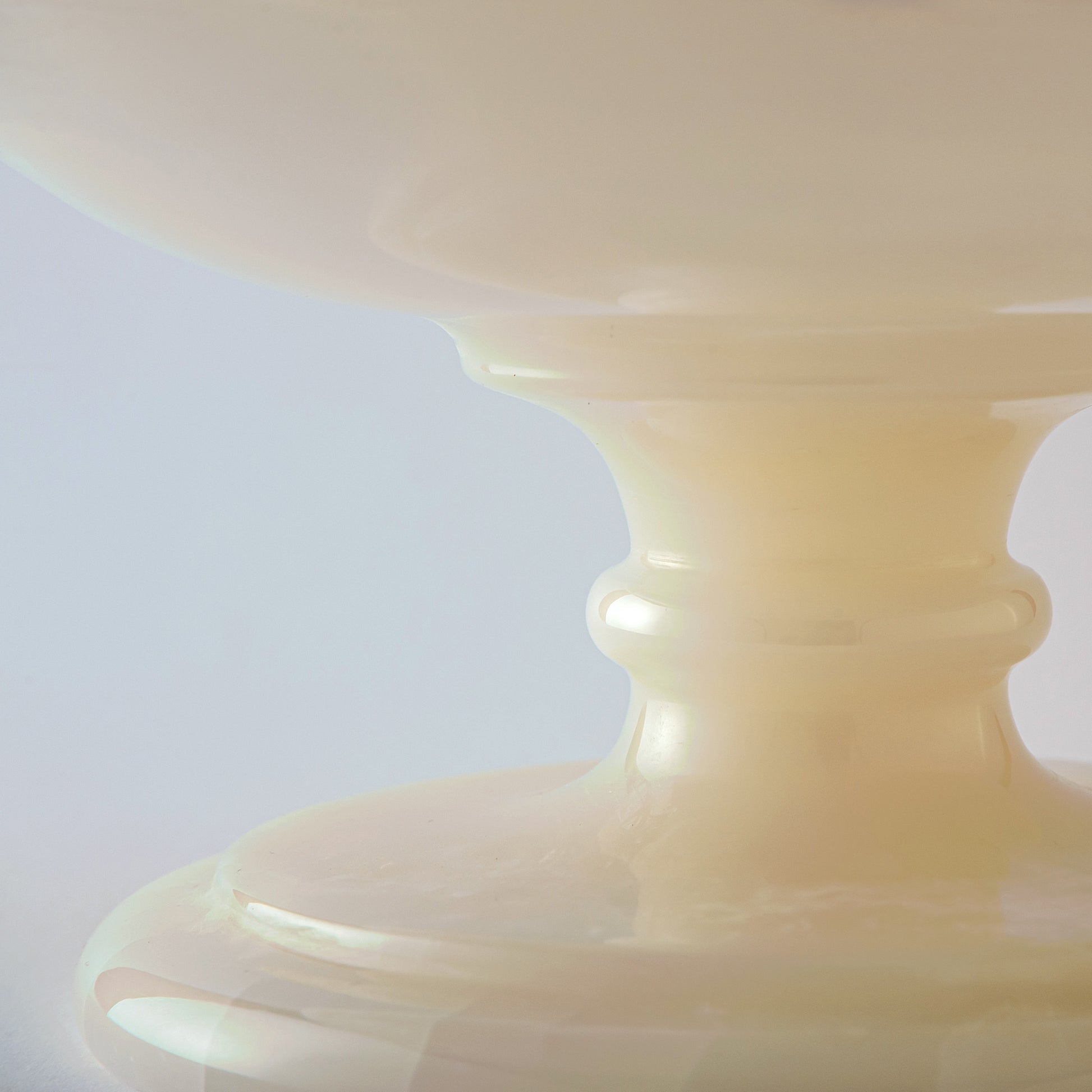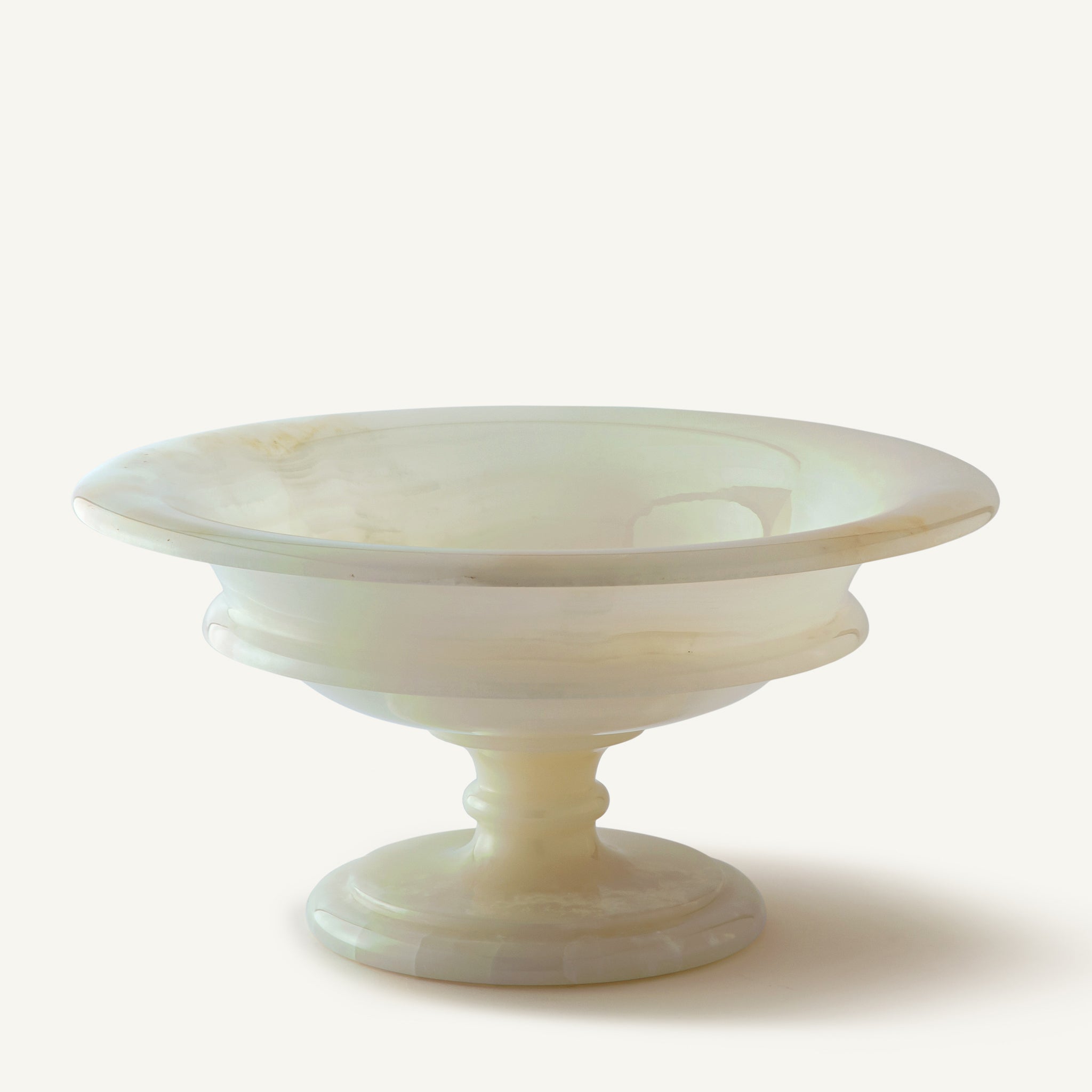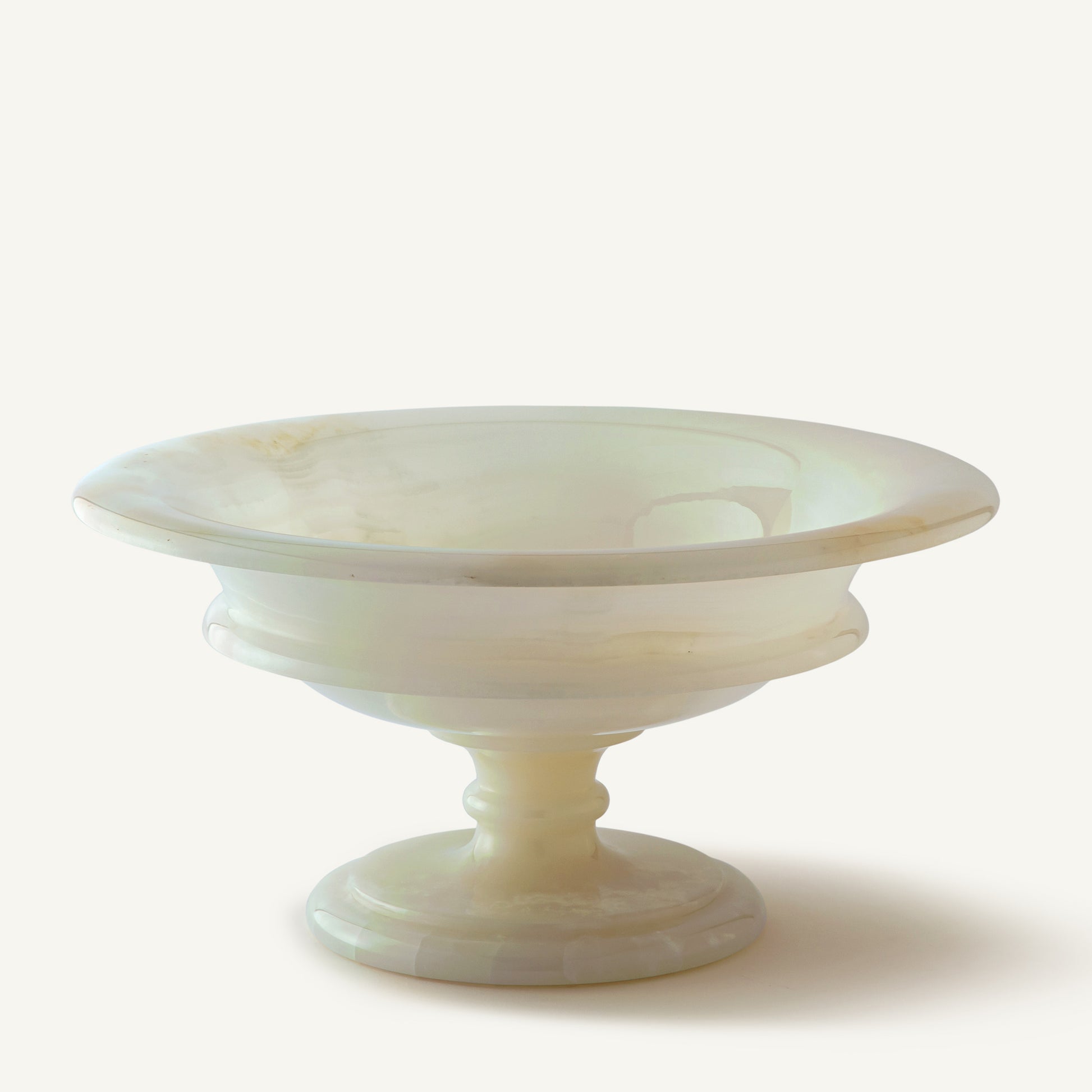 Seine weichen, milchigen Farbtöne und die feine Maserung betonen die organische Schönheit des Materials, geformt zu einer eleganten Schale, die auf einem sanften Sockel ruht.