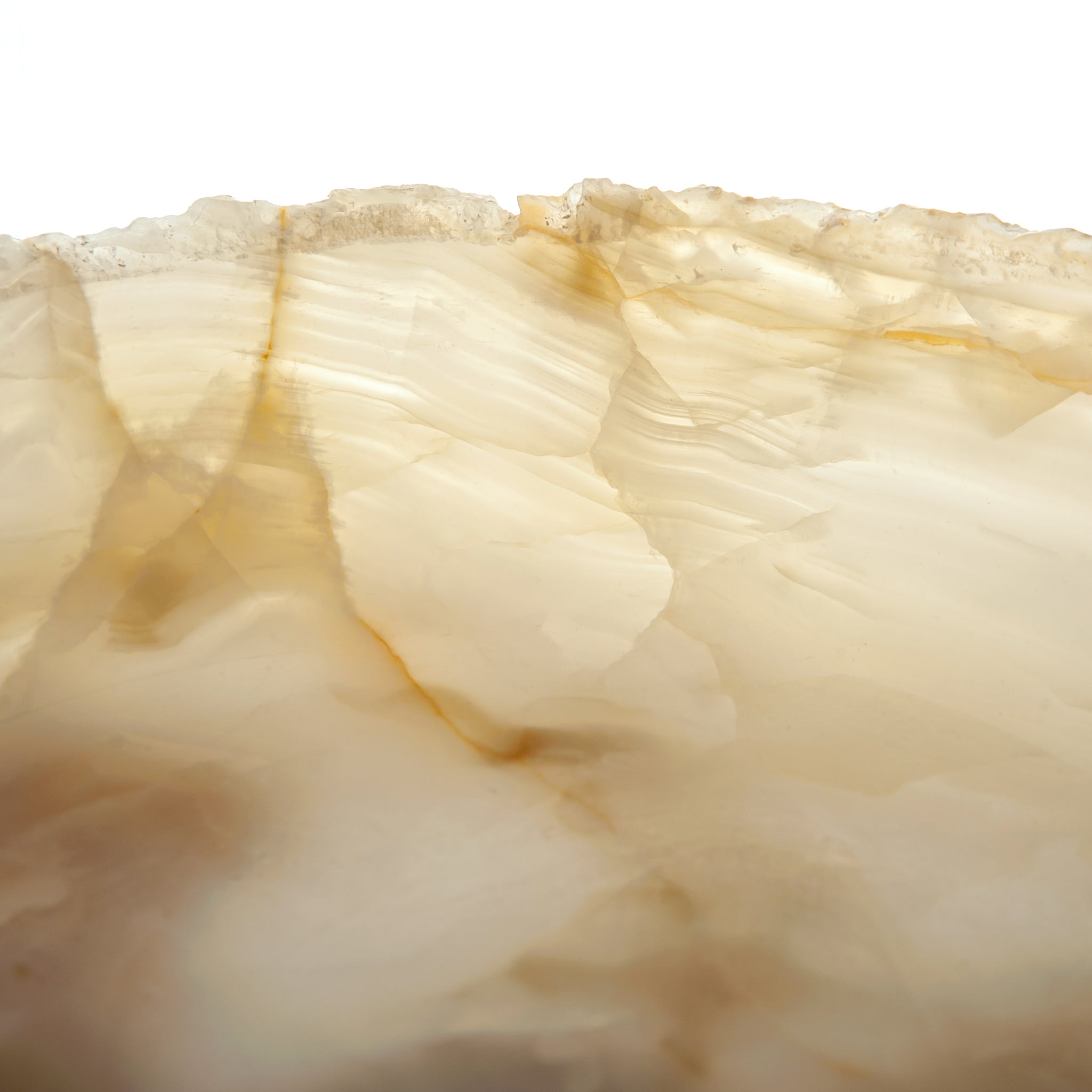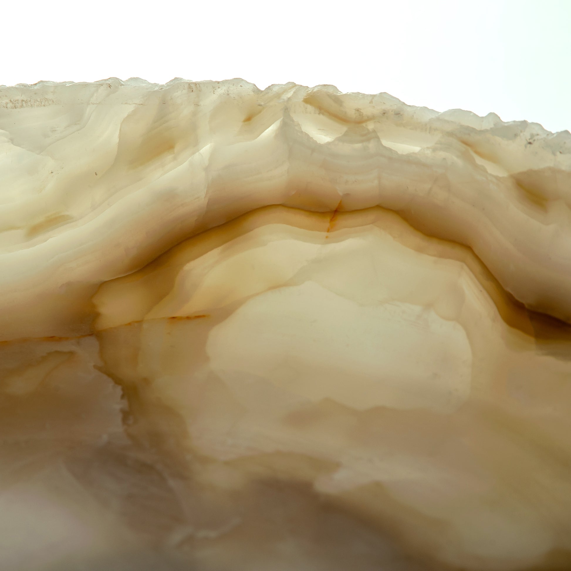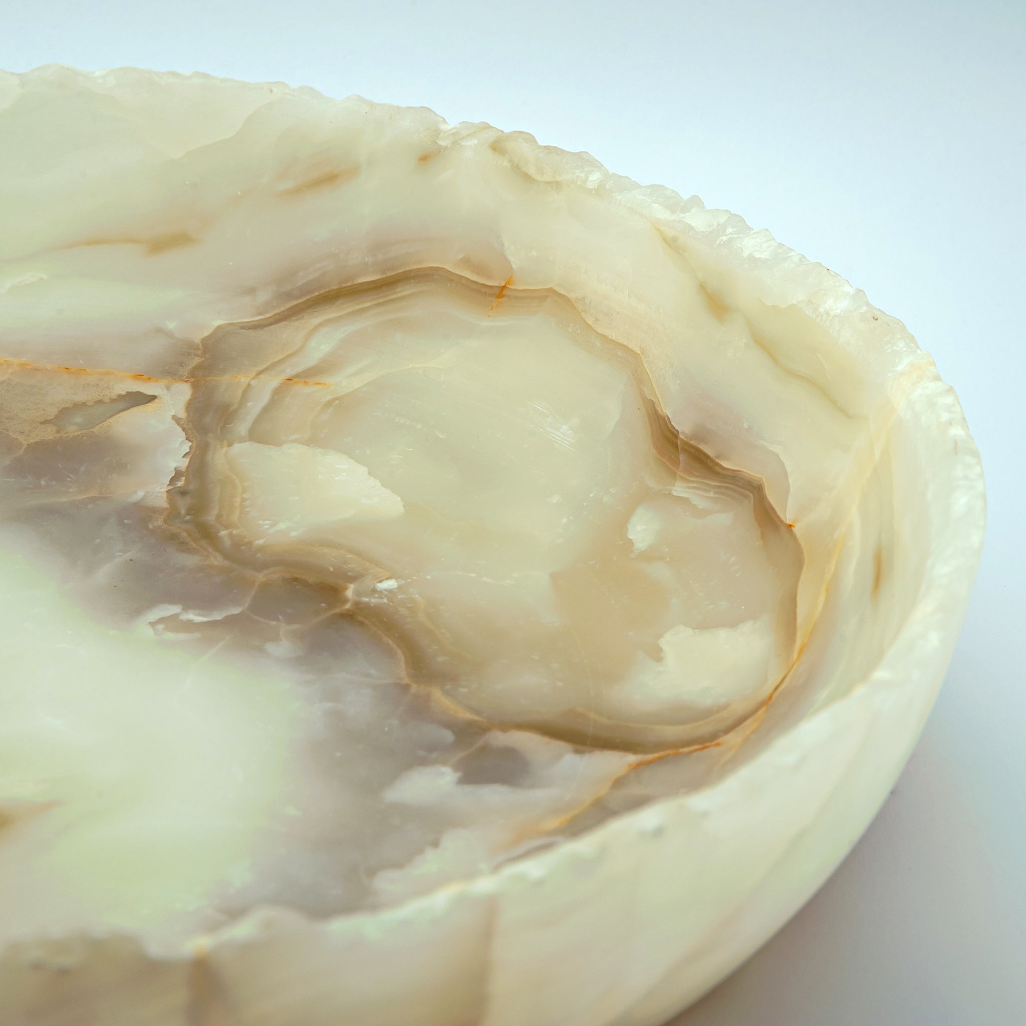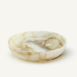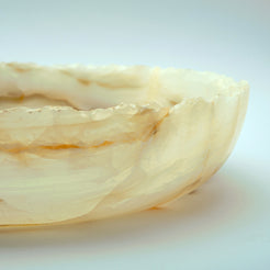 Die Alenor-Schale verkörpert ruhige Ausstrahlung und zeitlose Handwerkskunst. Aus natürlichem Onyx geschnitzt, offenbart sie Schichten von durchscheinender Wärme, die das Licht in sanften, wechselnden Tönen einfangen und streuen. Jede Kurve der Schale unterstreicht den natürlichen Fluss des Steins, eine Begegnung von mineralischer Kunstfertigkeit und raffiniertem Design.