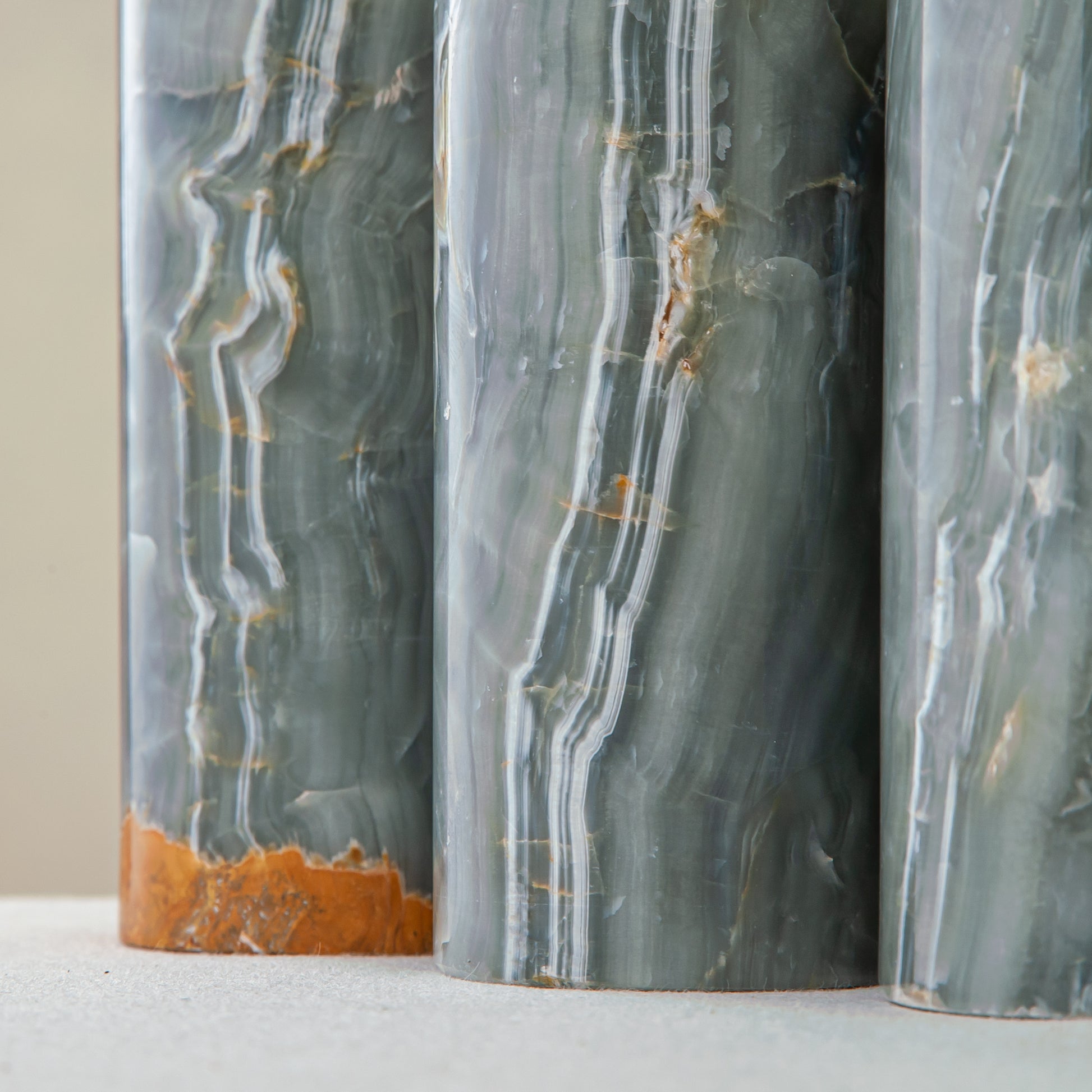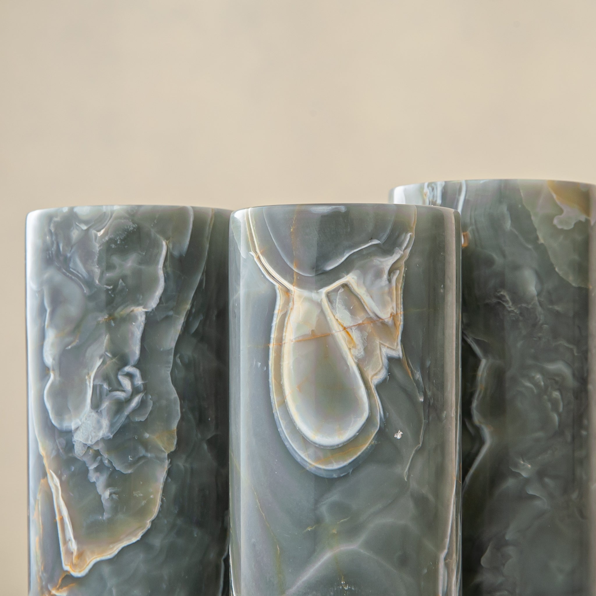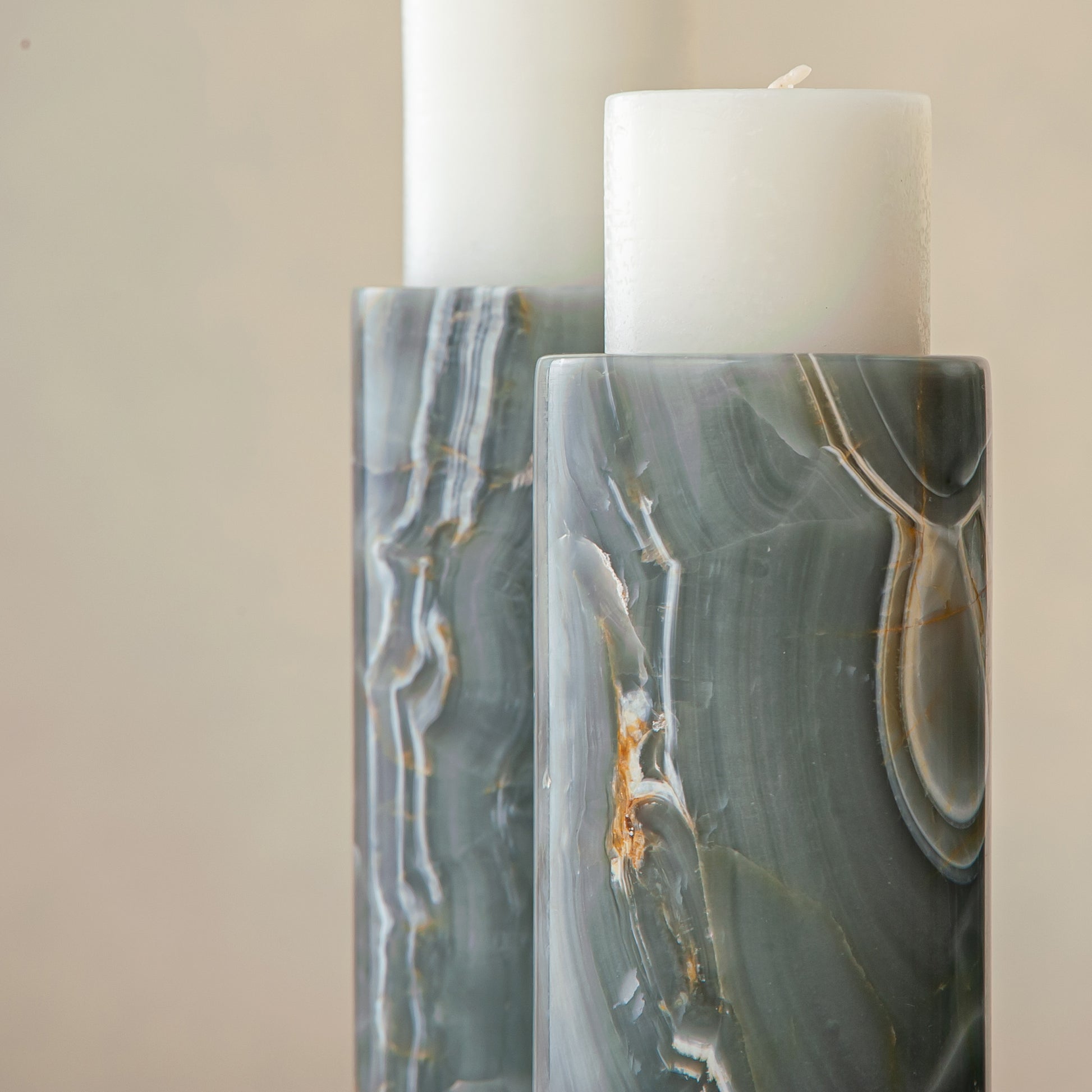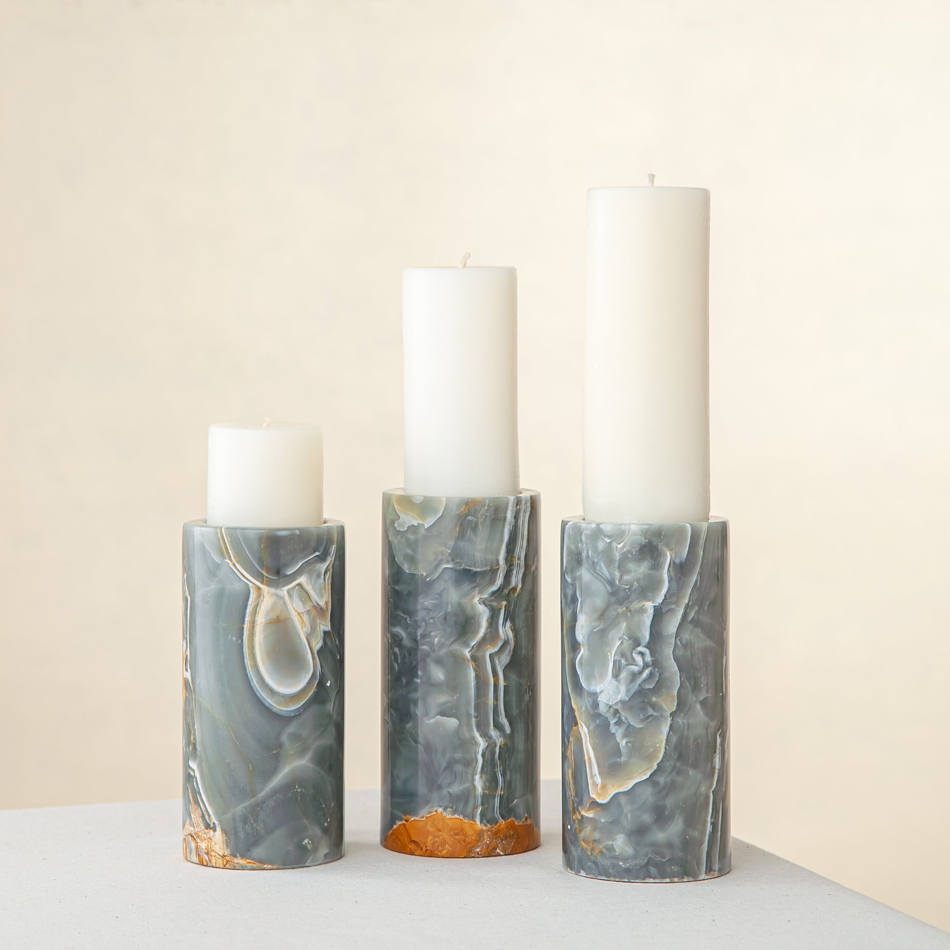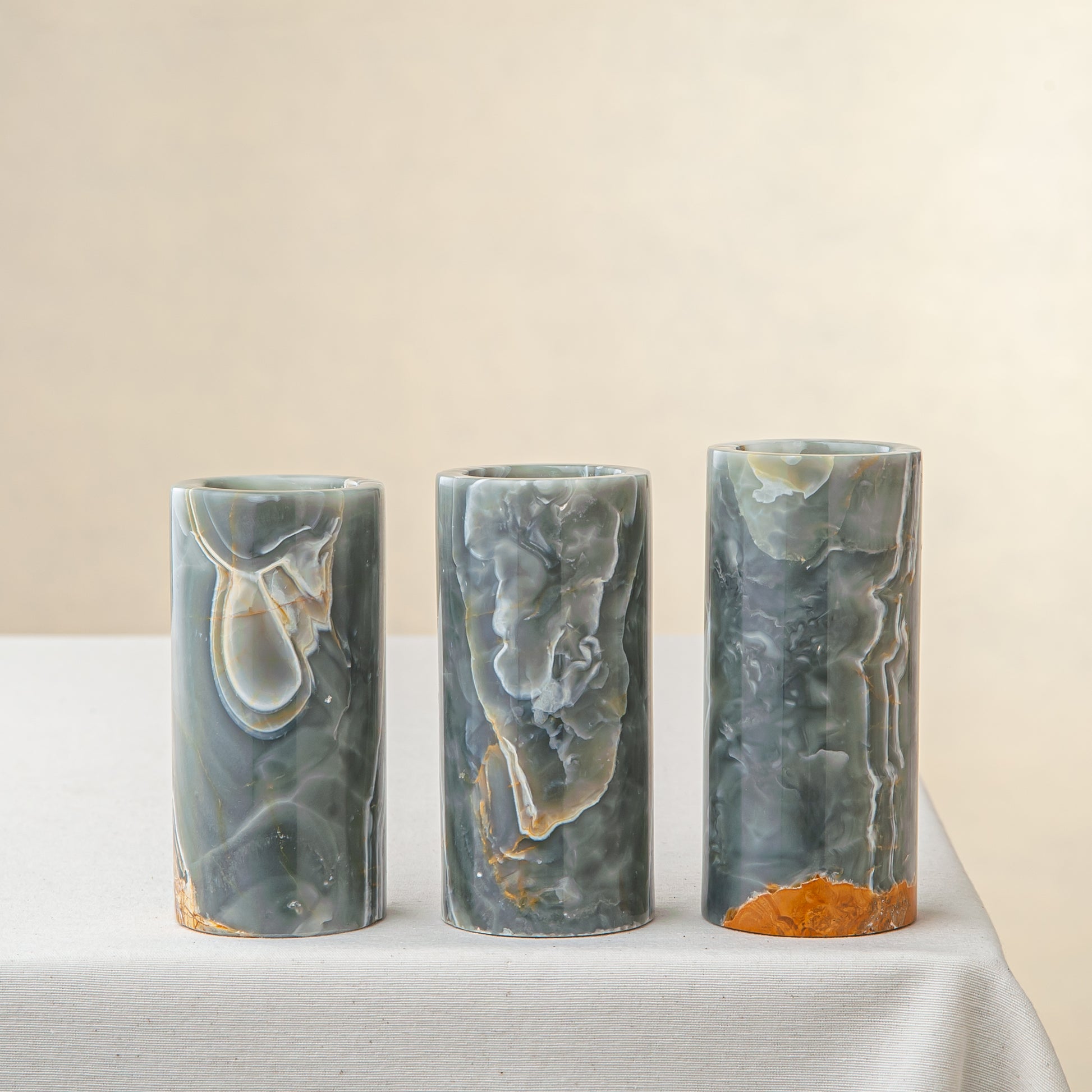 Jeder Halter erhebt sich in vertikaler Form und offenbart Tiefe und Transluzenz, wenn das Kerzenlicht angezündet wird. Natürliche Variationen in Farbe und Muster sorgen dafür, dass jedes Stück des Sets ein Unikat ist.