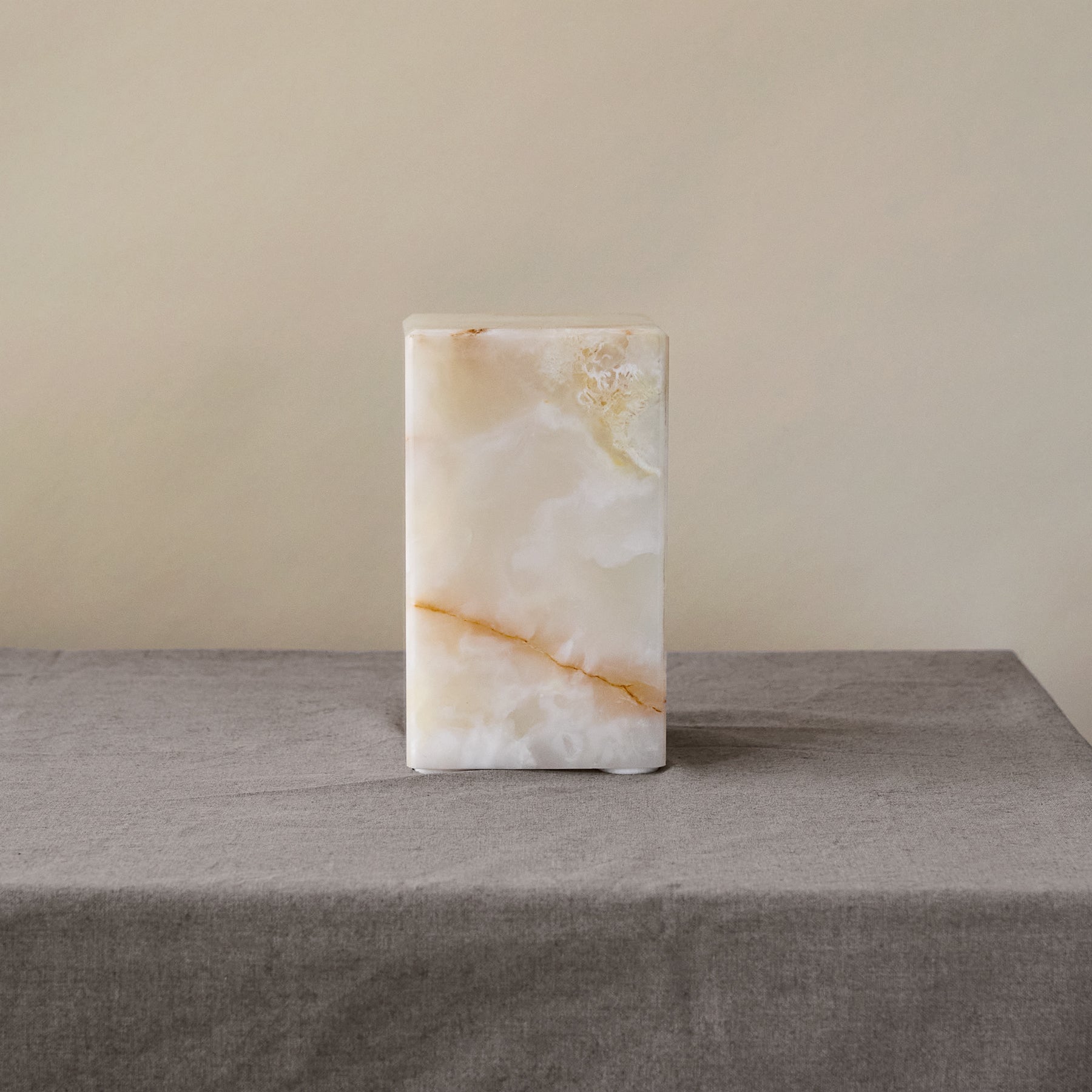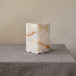 Aura ist eine skulpturale Onyxleuchte, geprägt von ihrer monolithischen Form und einer sanft fließenden, goldenen Mas...