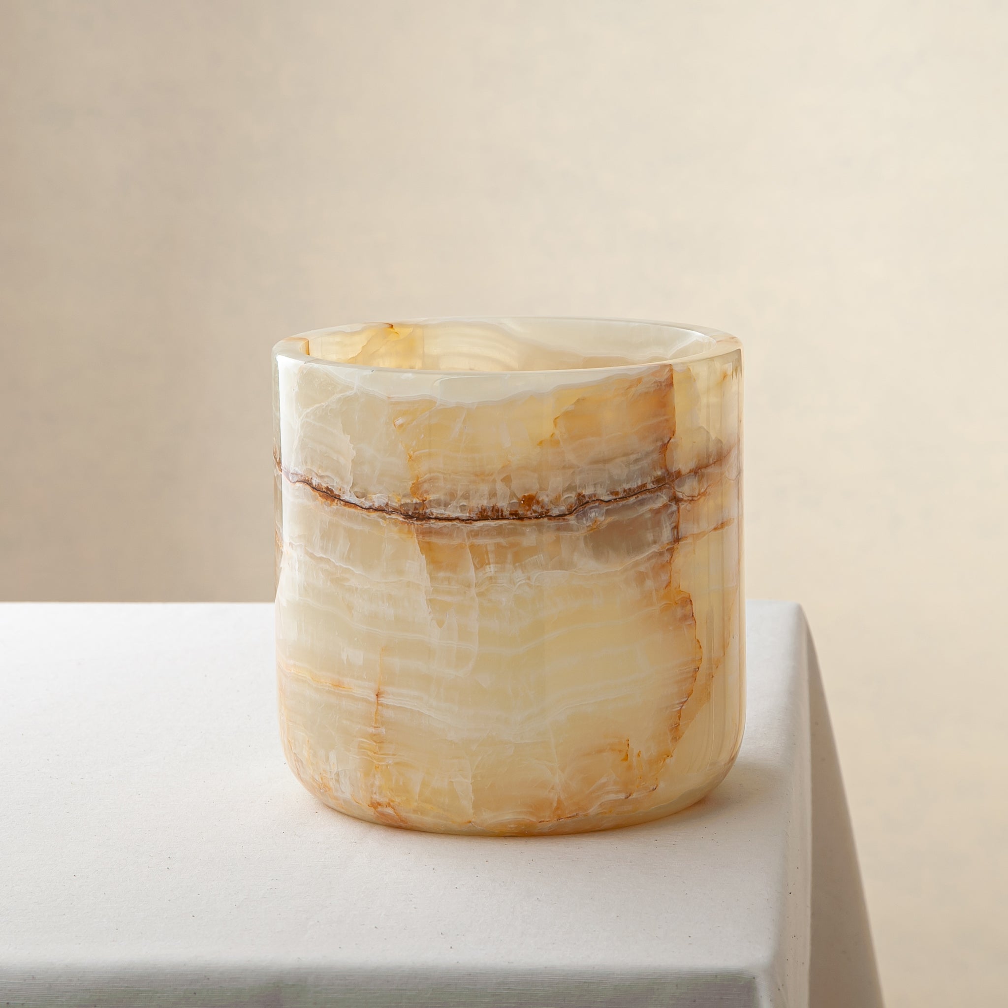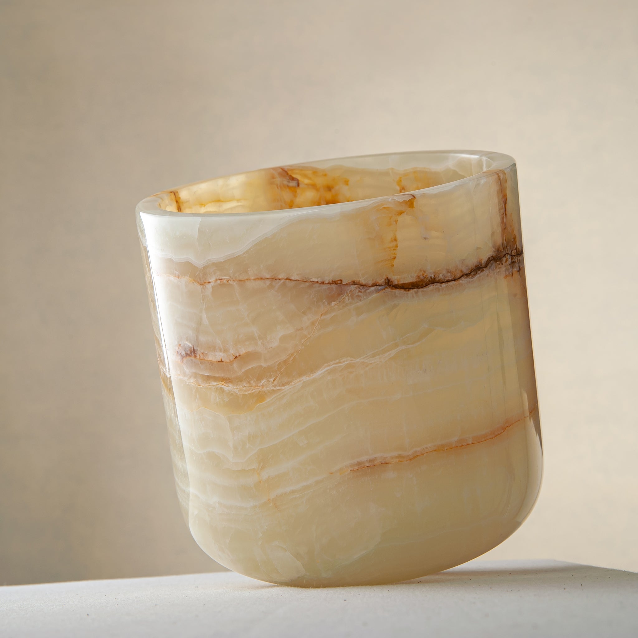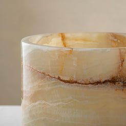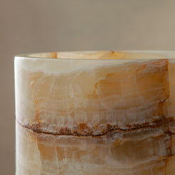 Der von Hand geschnitzte und polierte Aurelan Cooler verleiht jeder Umgebung eine skulpturale Präsenz. Er wurde entwickelt, um Flaschen perfekt gekühlt zu halten, und verbindet Funktionalität mit Kunstfertigkeit, wobei er die organische Wärme und die durchscheinende Tiefe des Steins zur Geltung bringt.