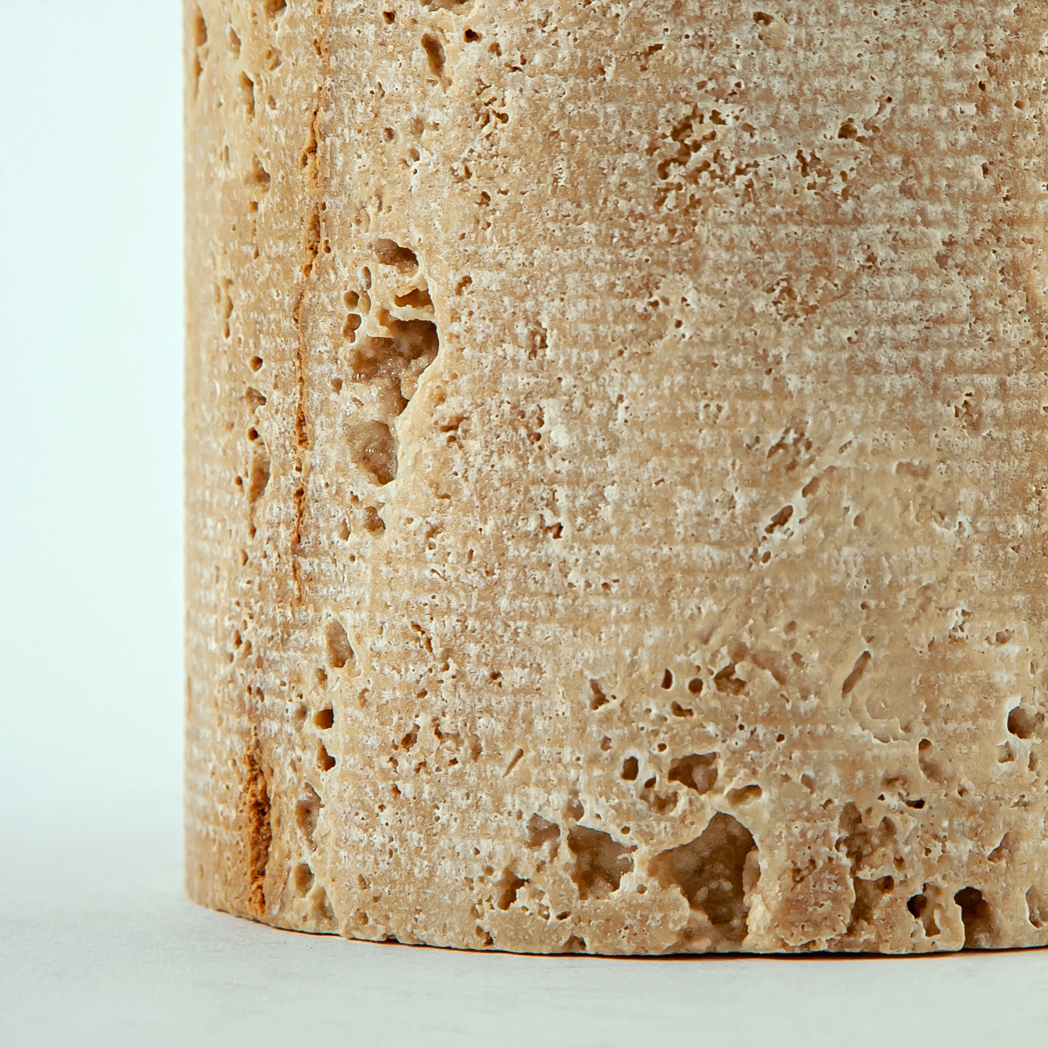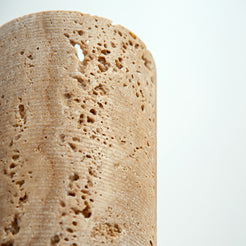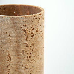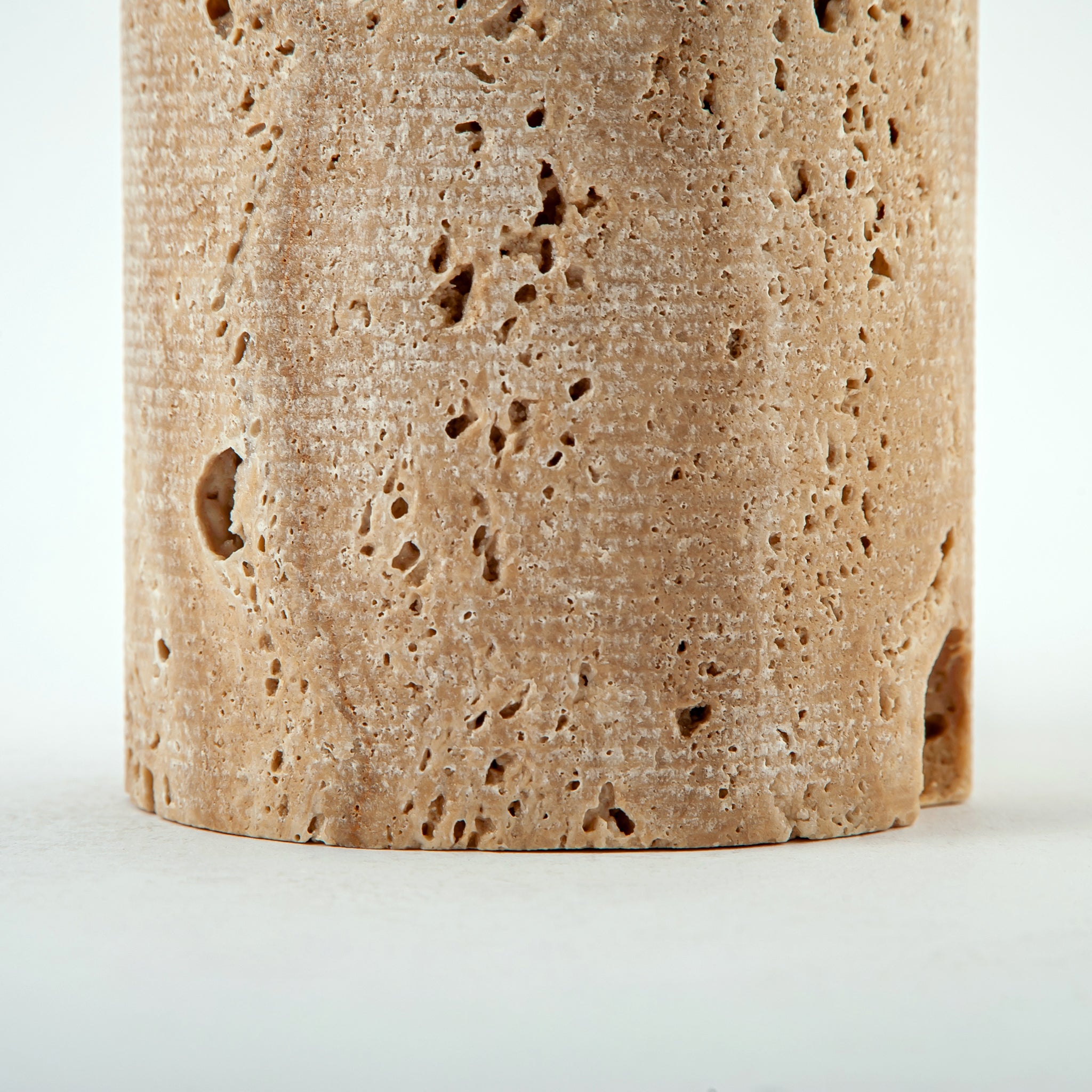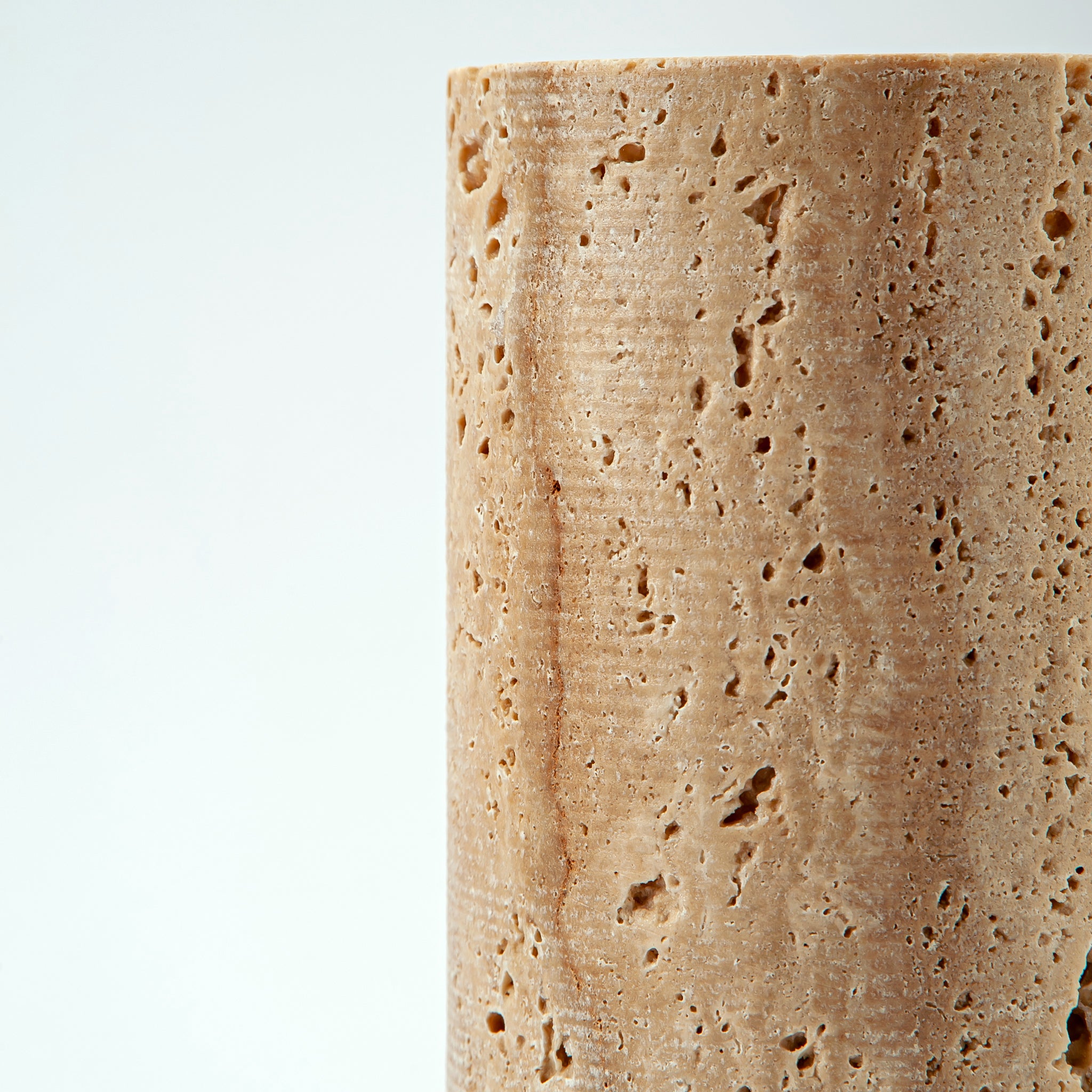 Die Solenna Vase ist eine ausdrucksstarke Komposition aus Schlichtheit und natürlicher Eleganz, handgefertigt aus warmem, porösem Travertin. Ihre hohe, zylindrische Form unterstreicht die rohe Schönheit des Steins – feine Farbverläufe und natürliche Hohlräume erzählen von den Schichten der Erde und ihrer Entstehung über Jahrtausende.