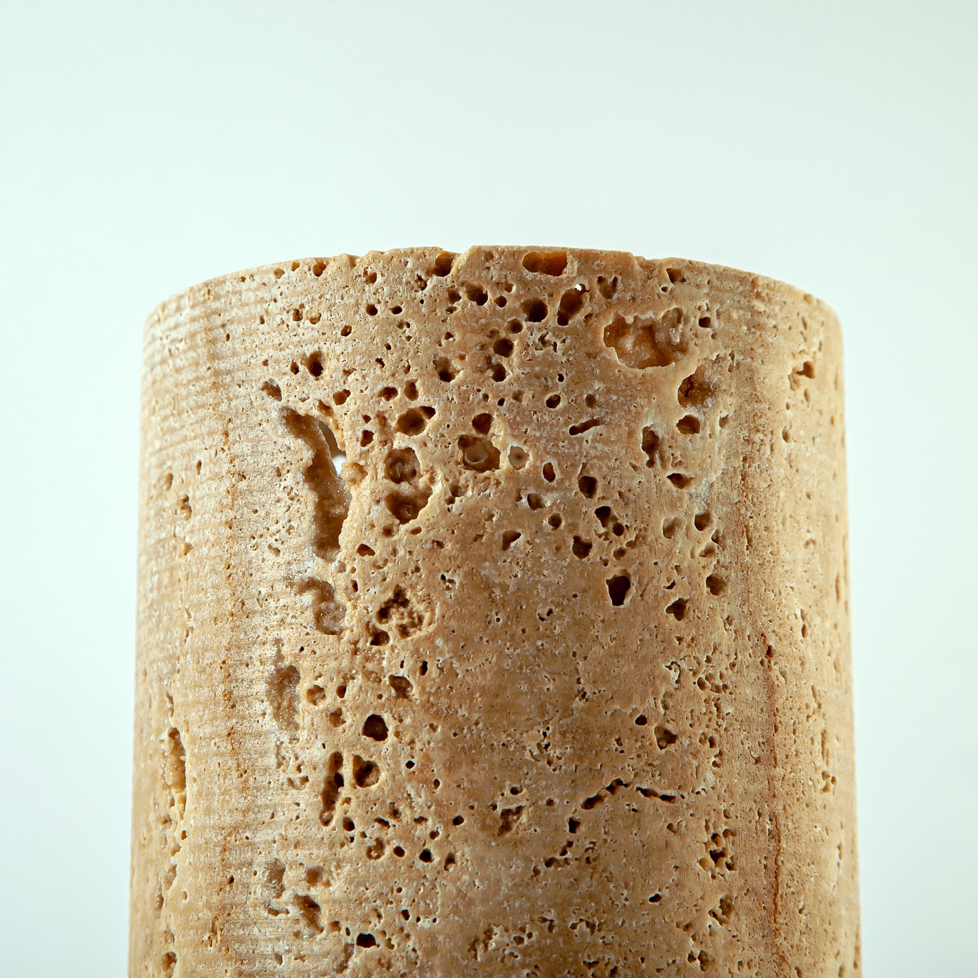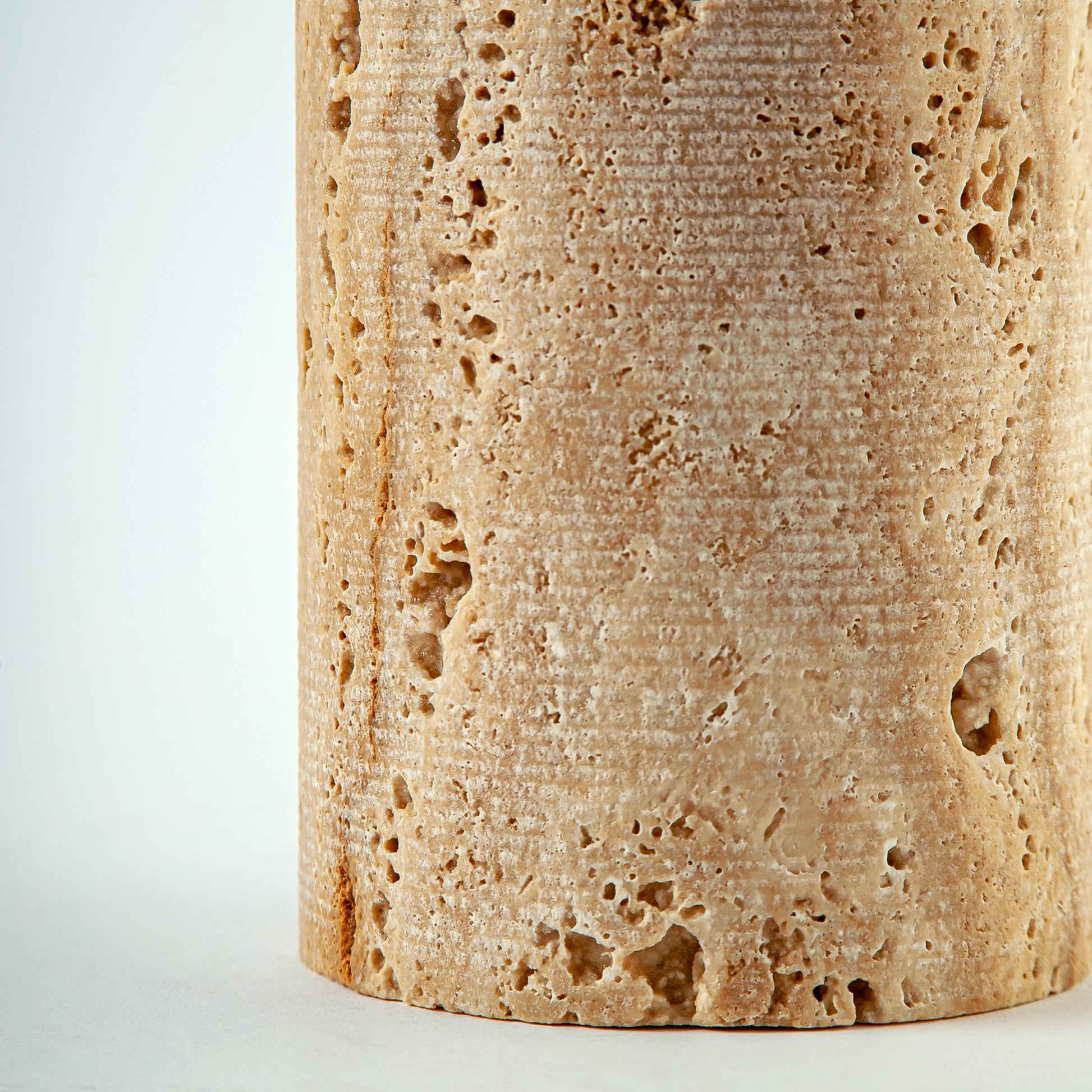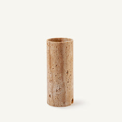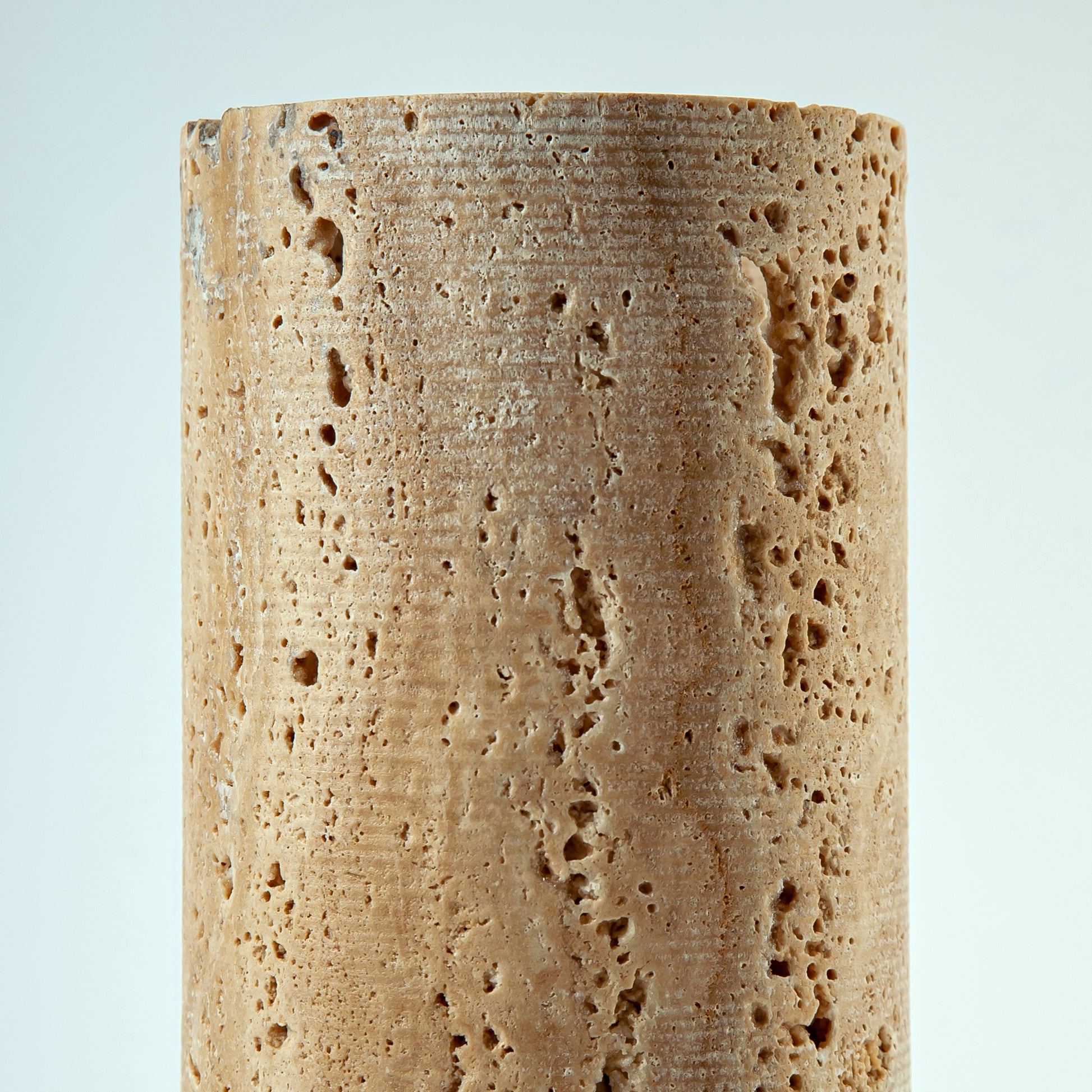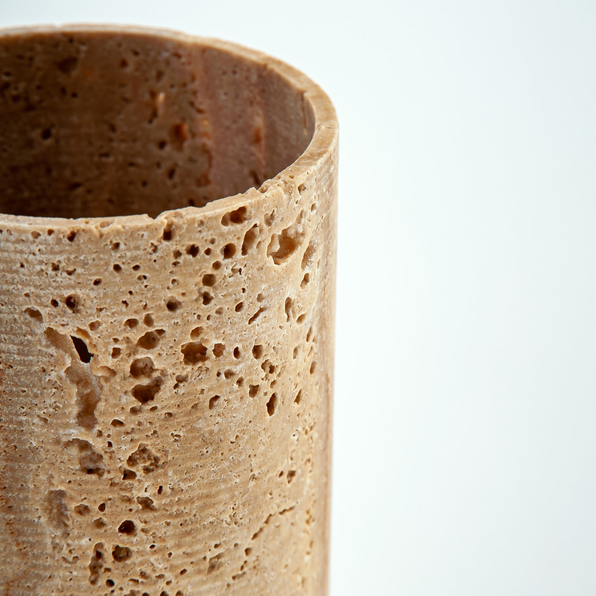 Die Solenna Vase ist eine ausdrucksstarke Komposition aus Schlichtheit und natürlicher Eleganz, handgefertigt aus warmem, porösem Travertin. Ihre hohe, zylindrische Form unterstreicht die rohe Schönheit des Steins – feine Farbverläufe und natürliche Hohlräume erzählen von den Schichten der Erde und ihrer Entstehung über Jahrtausende.