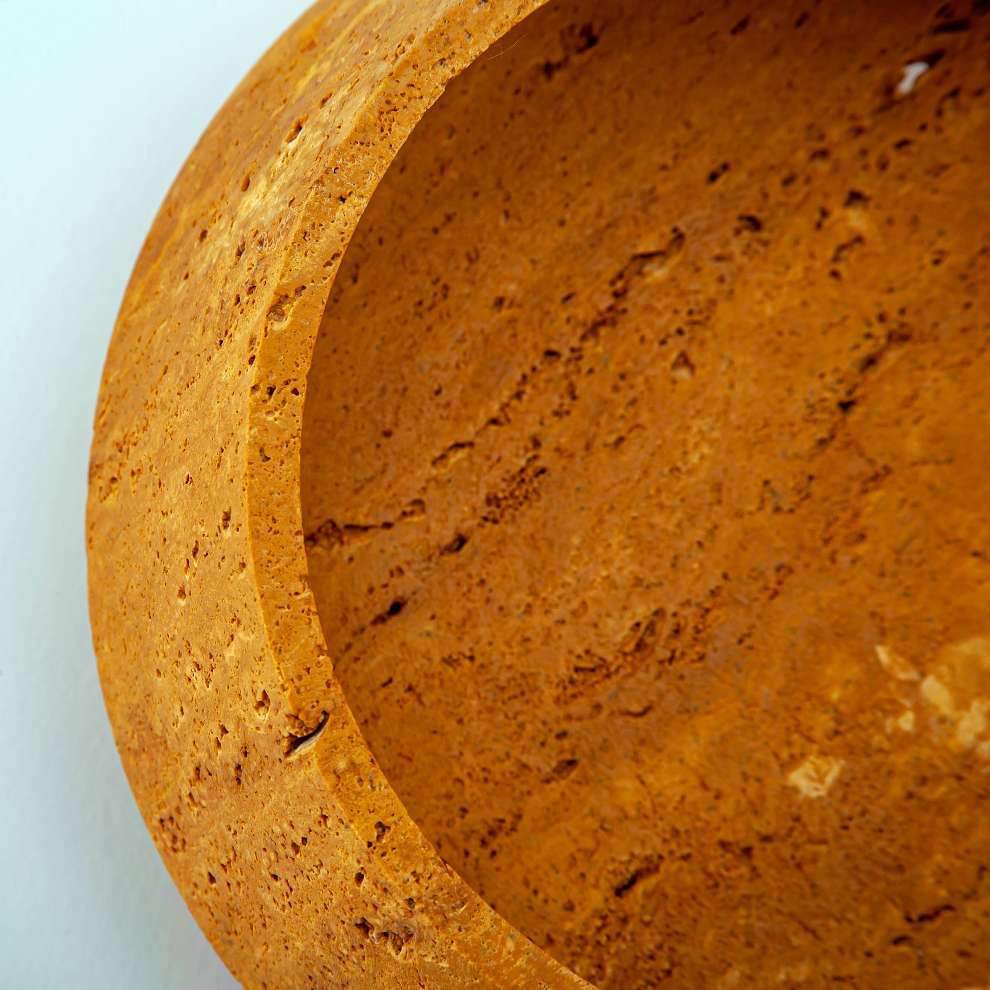 Die Caerun Bowl schöpft ihre Kraft aus der Wärme der Erde und ist aus goldenem Travertin geformt, dessen weiche Texturen und natürliche Poren die stille Geschichte der Zeit erzählen. Ihre ausgewogene Silhouette ruht auf einem soliden Sockel und schafft so ein Wechselspiel zwischen geerdeter Form und offener Leichtigkeit.