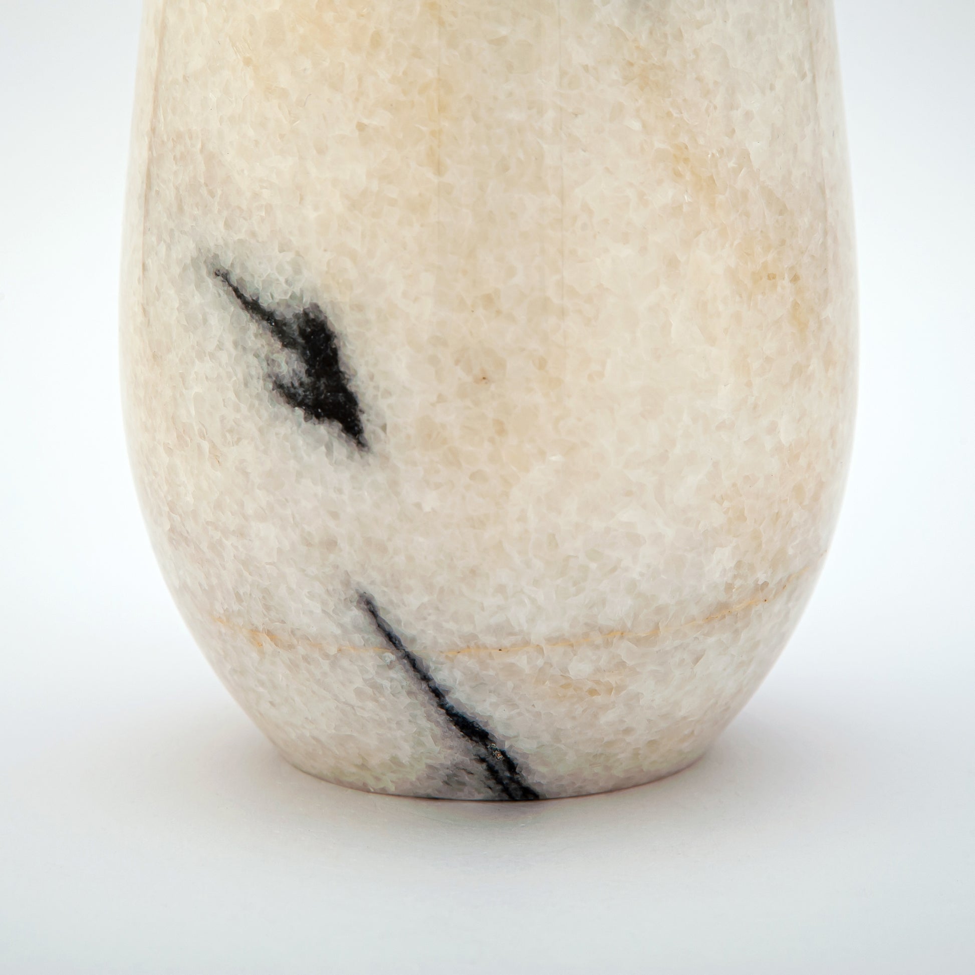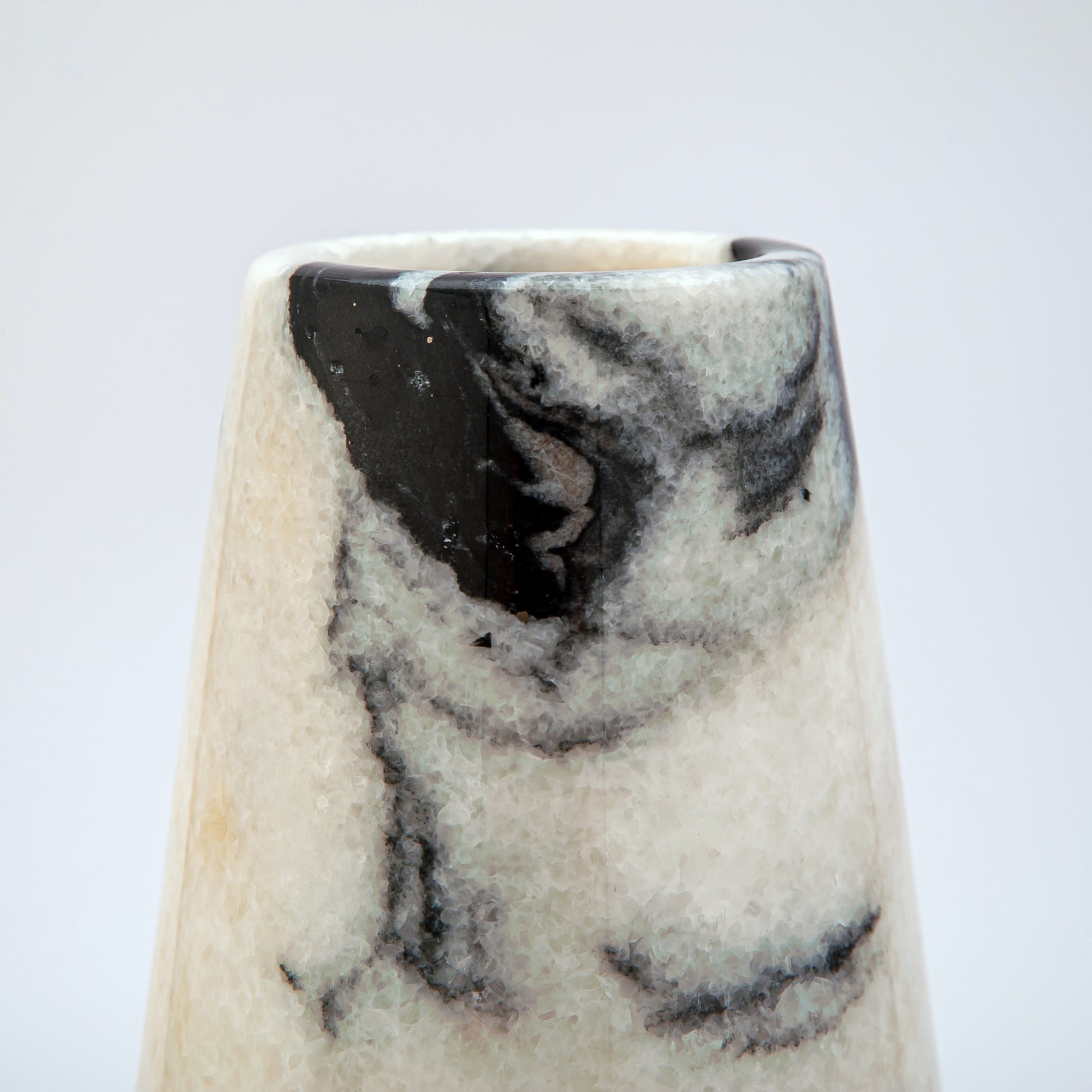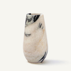 Die Dalmaris-Vase zelebriert die auffällige Schönheit des Kontrasts, bei dem Eleganz auf Verspieltheit trifft. Der Sockel aus natürlichem Marmor in sanftem Elfenbein ist mit tiefschwarzen Adern und gesprenkelten Mustern verziert, die an die charakteristischen Markierungen eines Dalmatinersteins erinnern. Mit ihrer sanft zulaufenden Silhouette und ihrer polierten Oberfläche verleiht diese Vase jedem Raum einen Hauch von moderner Raffinesse und würdigt gleichzeitig die organische Kunstfertigkeit der Natur.