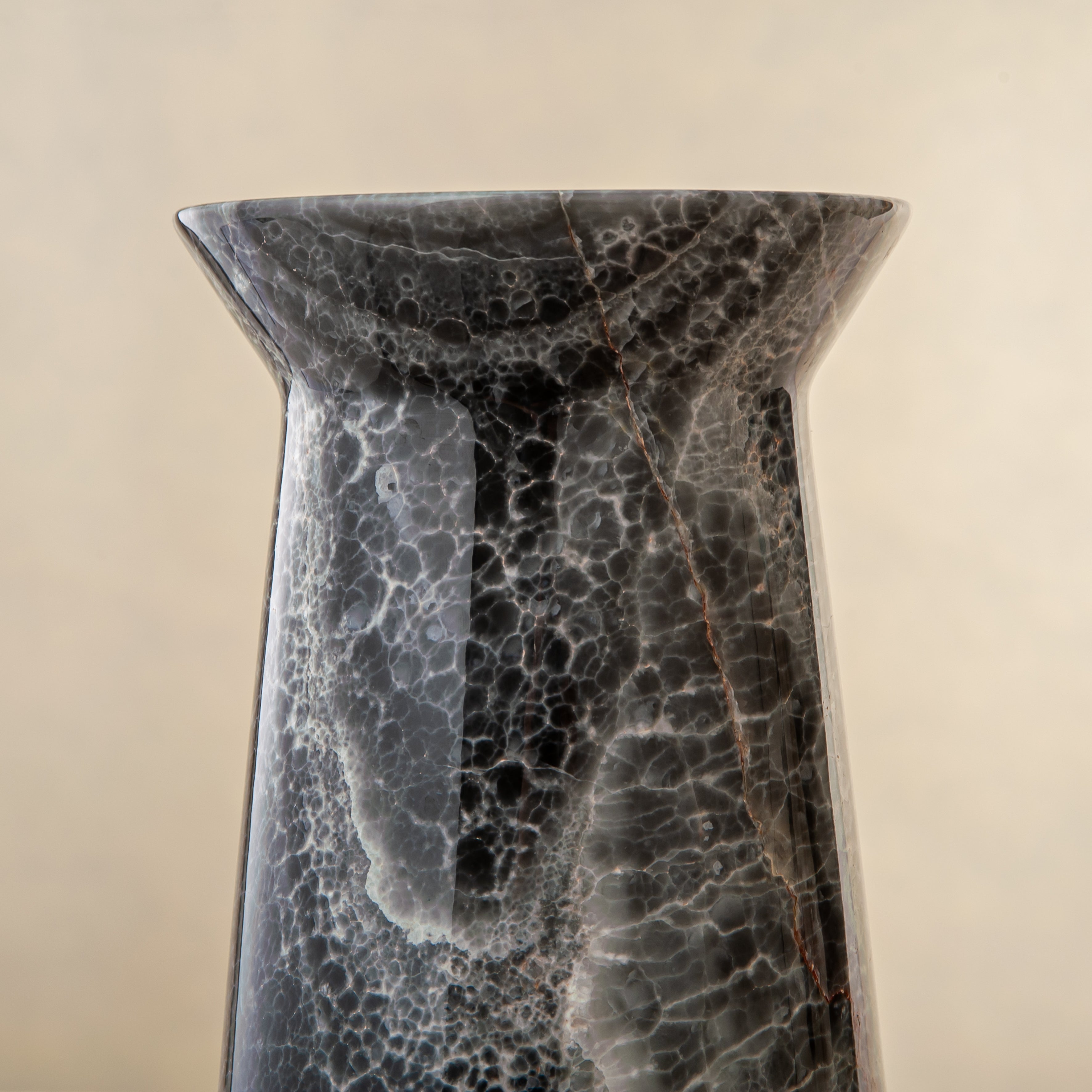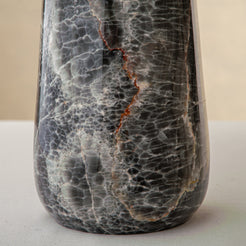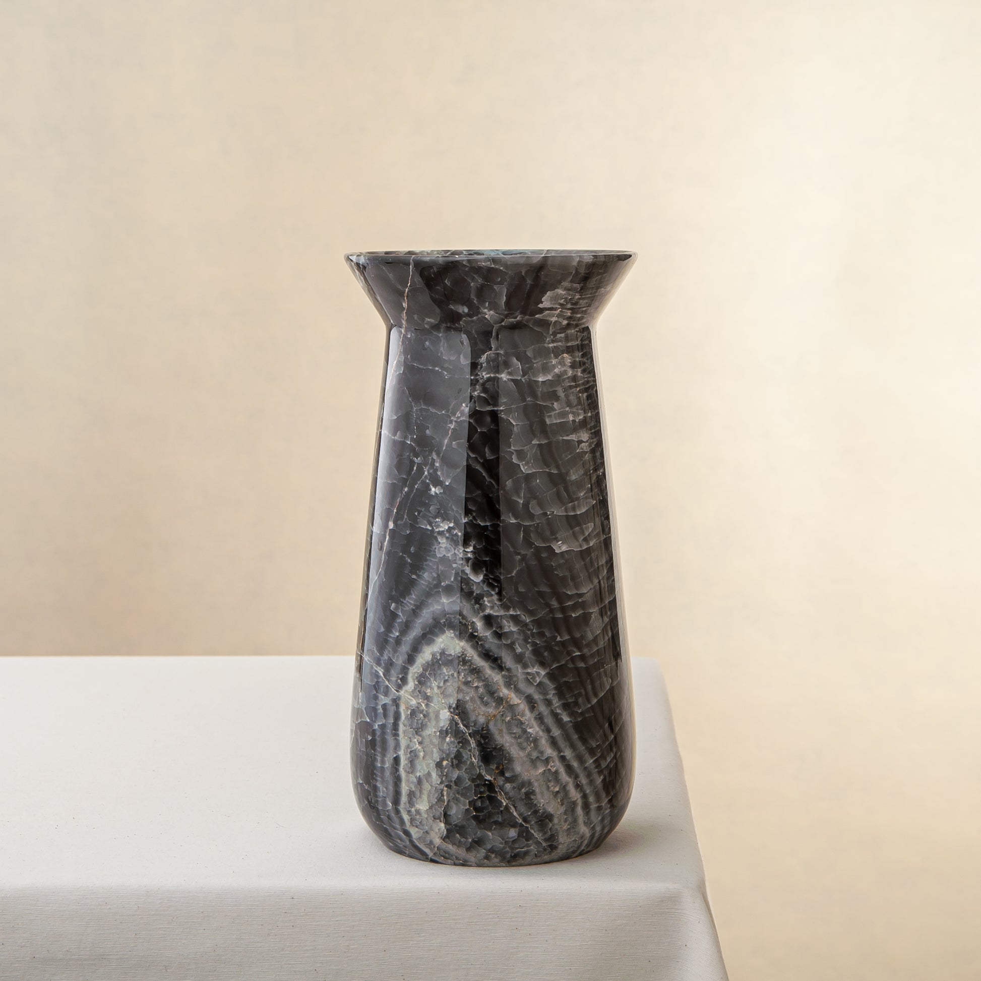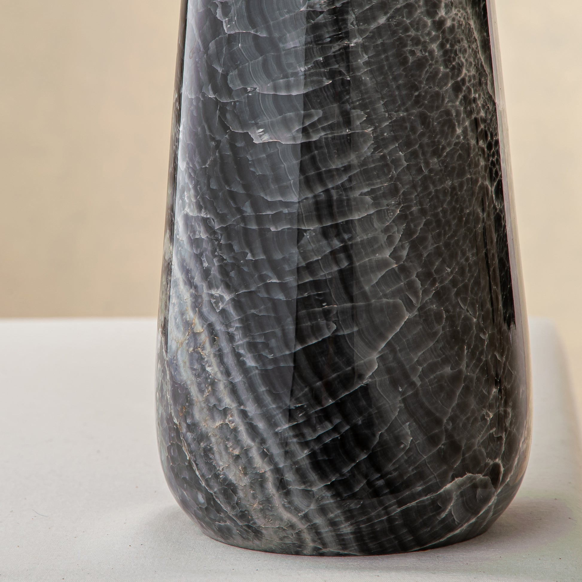 Aus einem einzigen Block seltenen grauen Onyx gefertigt, verkörpert die Elarion Vase stille Stärke, Tiefe und zurückhaltende Eleganz. Ihre hohe, konisch zulaufende Silhouette lenkt den Blick nach oben und betont die feine Transluzenz des Steins sowie die edlen silbergrauen Aderungen, die sich organisch durch jede Schicht ziehen und eine Atmosphäre ruhiger Raffinesse schaffen.