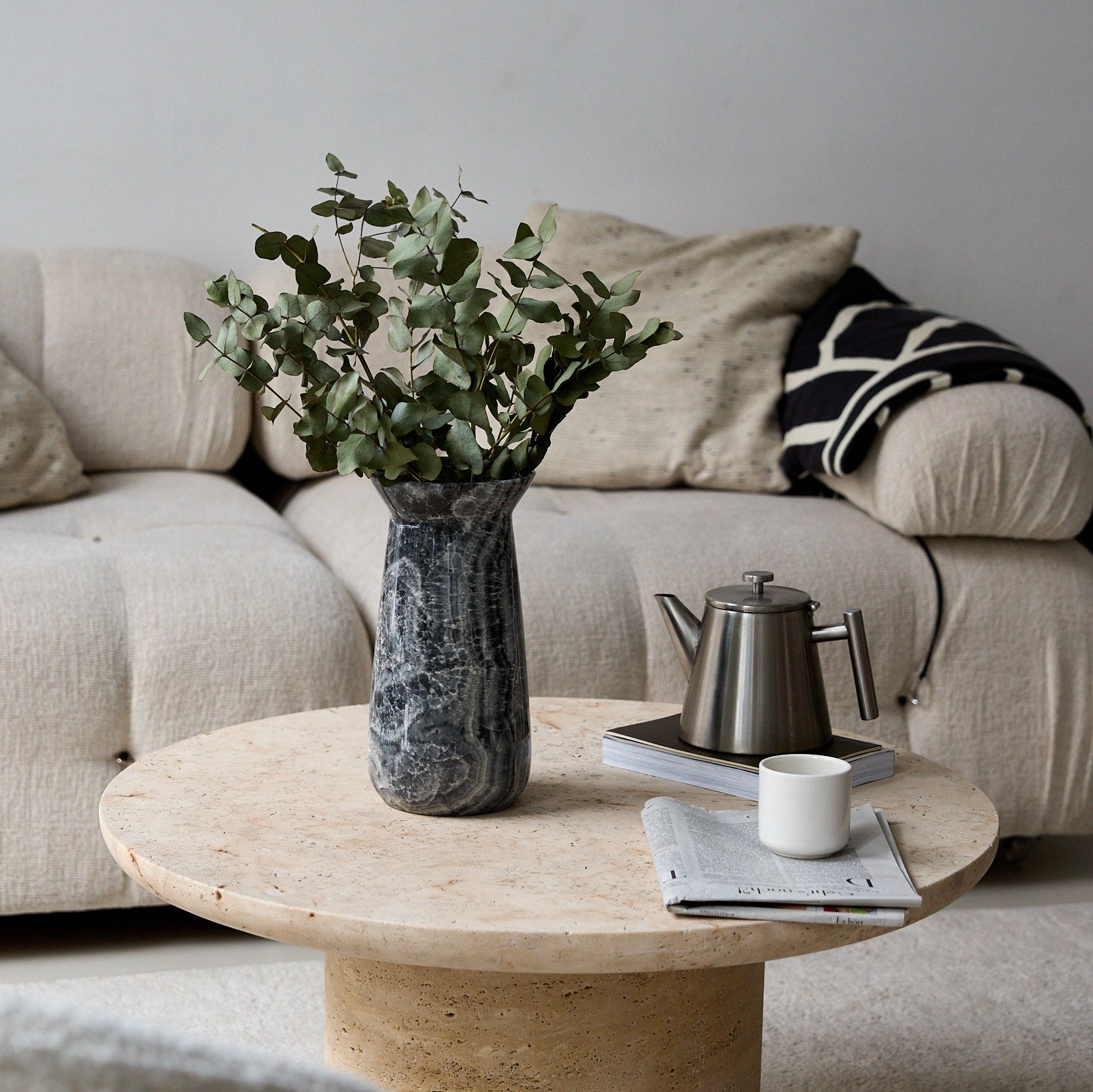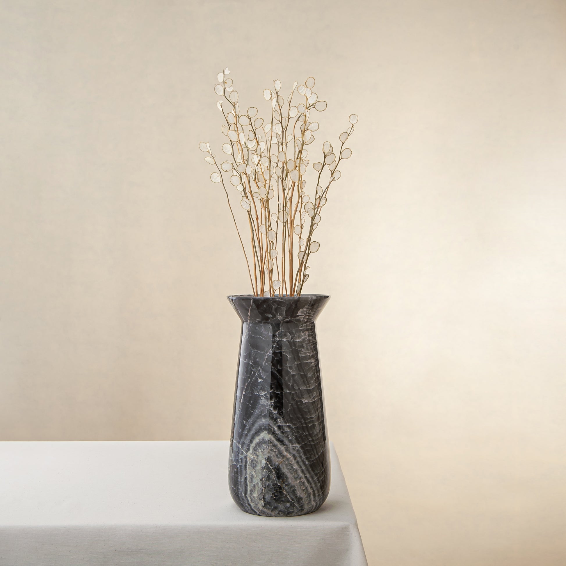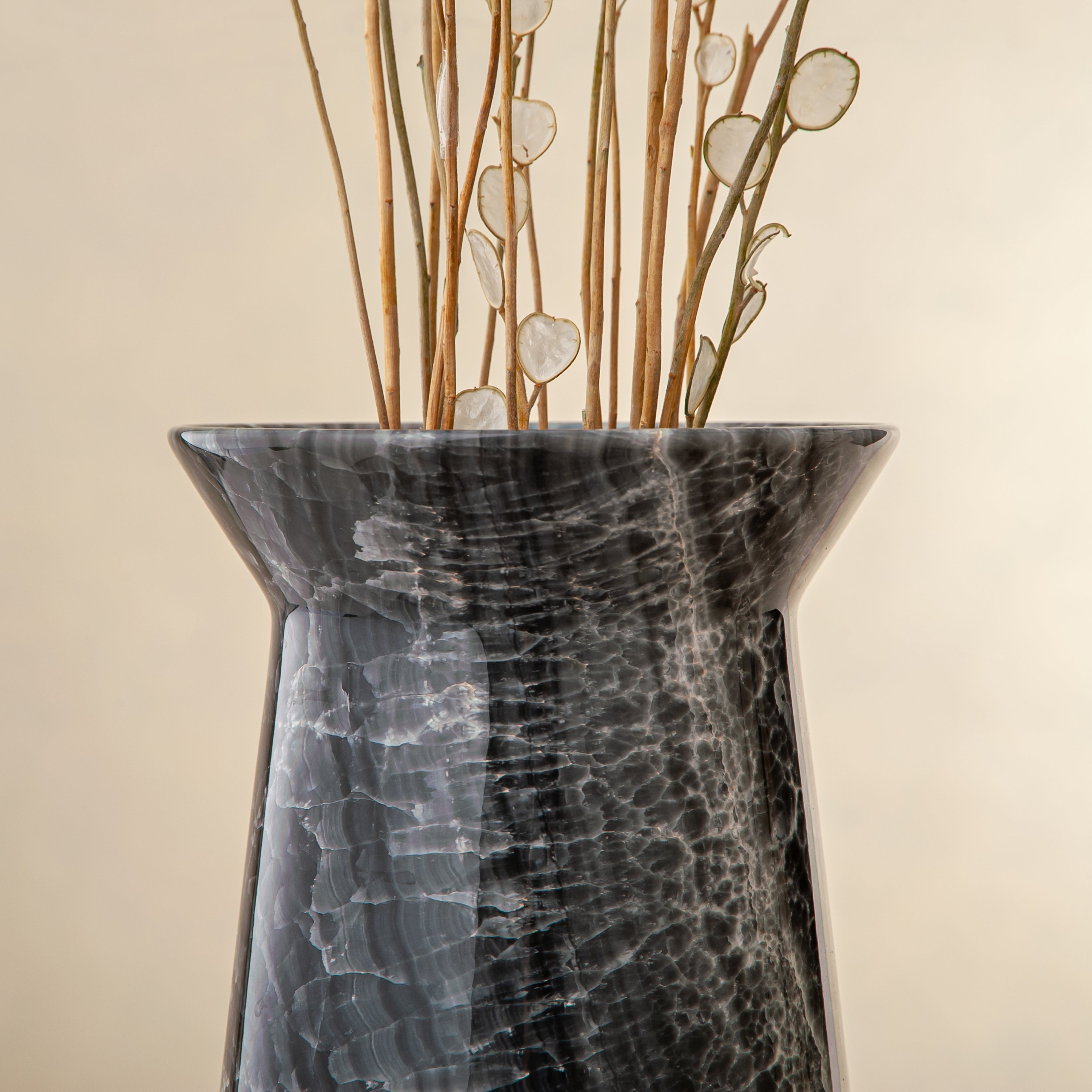 Aus einem einzigen Block seltenen grauen Onyx gefertigt, verkörpert die Elarion Vase stille Stärke, Tiefe und zurückhaltende Eleganz. Ihre hohe, konisch zulaufende Silhouette lenkt den Blick nach oben und betont die feine Transluzenz des Steins sowie die edlen silbergrauen Aderungen, die sich organisch durch jede Schicht ziehen und eine Atmosphäre ruhiger Raffinesse schaffen.