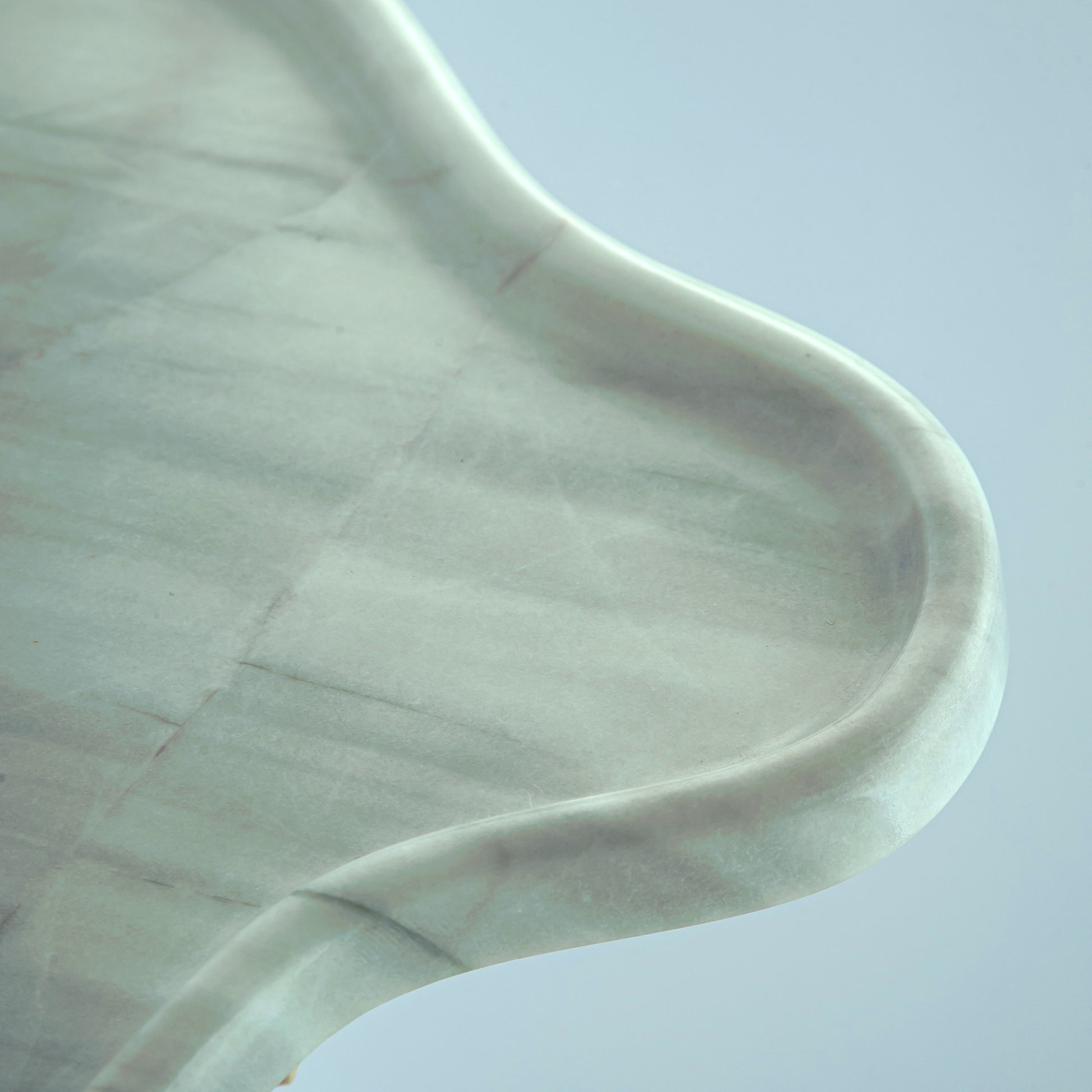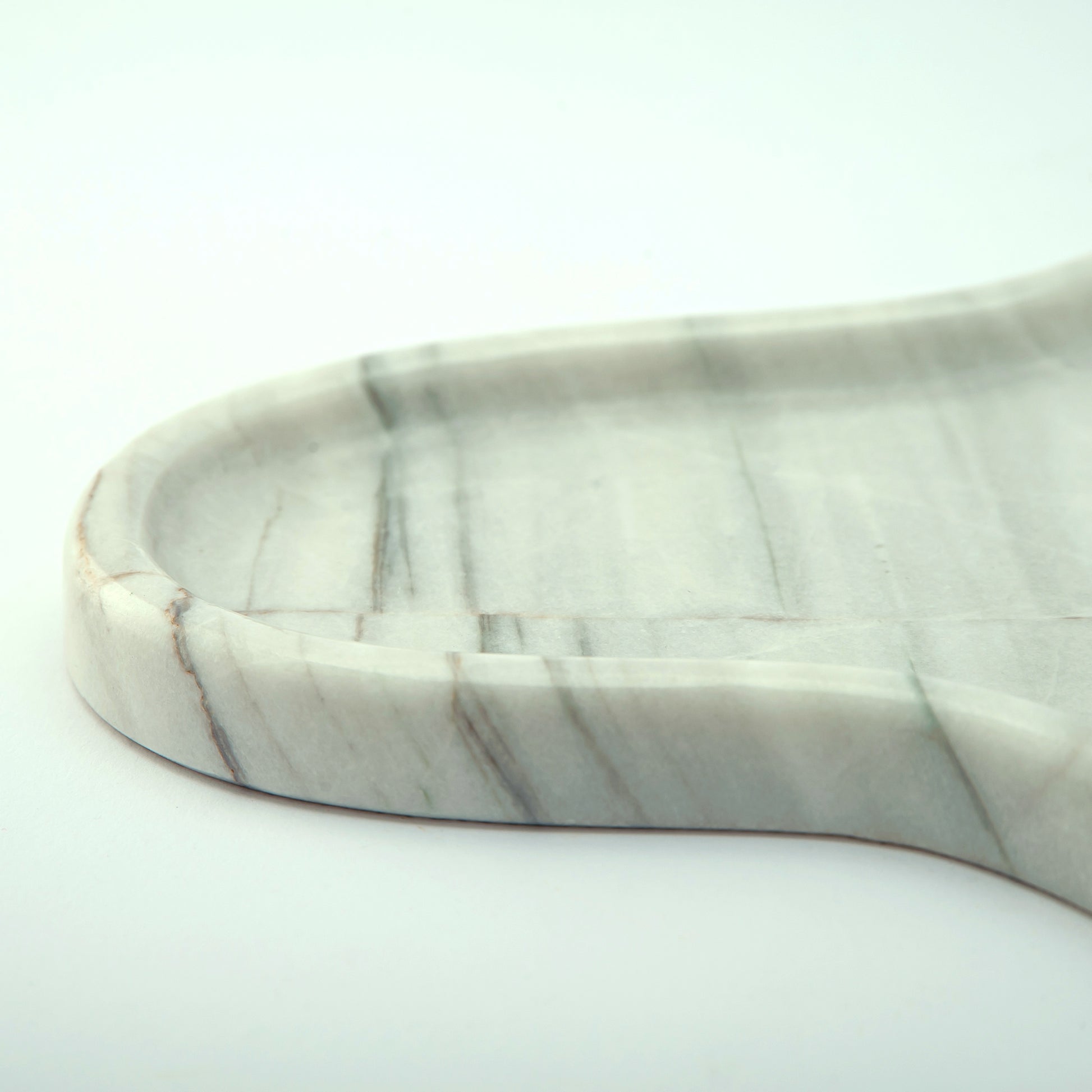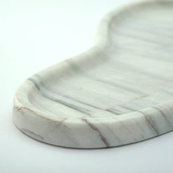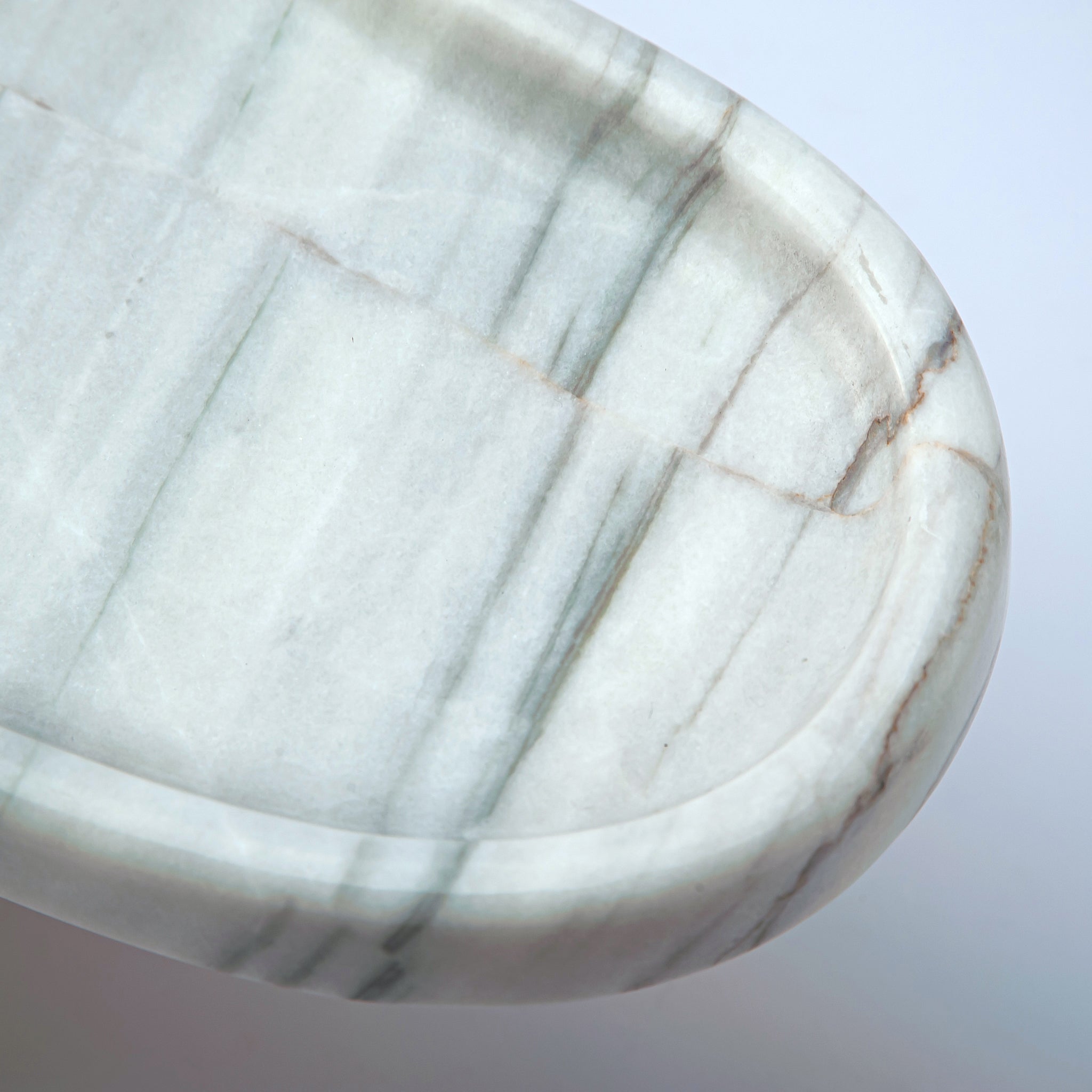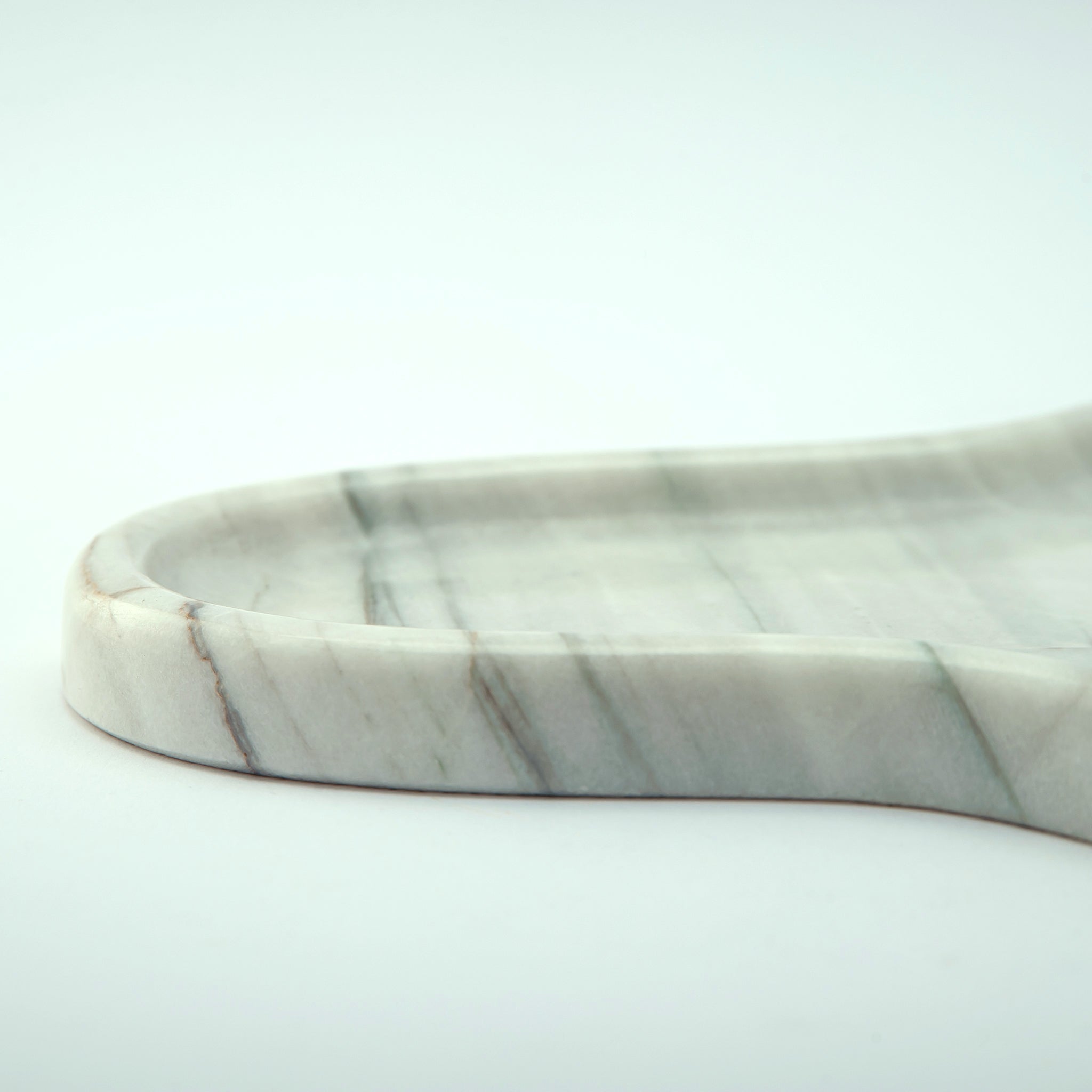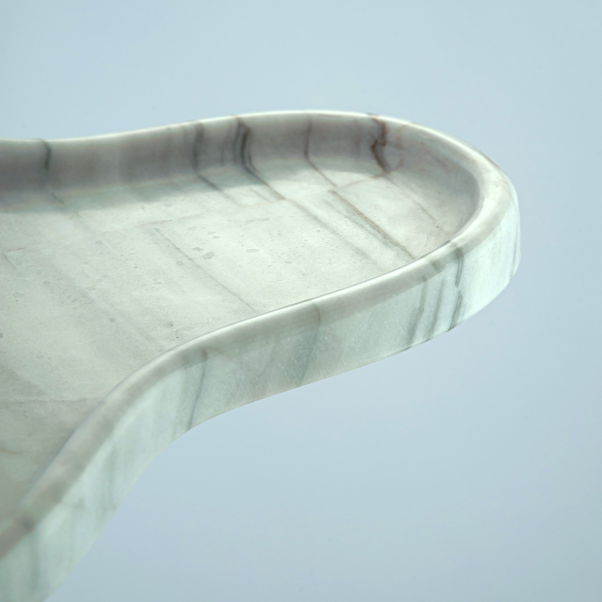 Das Fluva Tablett ist aus natürlichem Marmor geschnitzt und hat eine weiche, fließende Form, die von den Bewegungen in der Natur inspiriert ist. Sanfte Kurven und dezente Maserungen ziehen sich wie fließendes Wasser über den Stein.