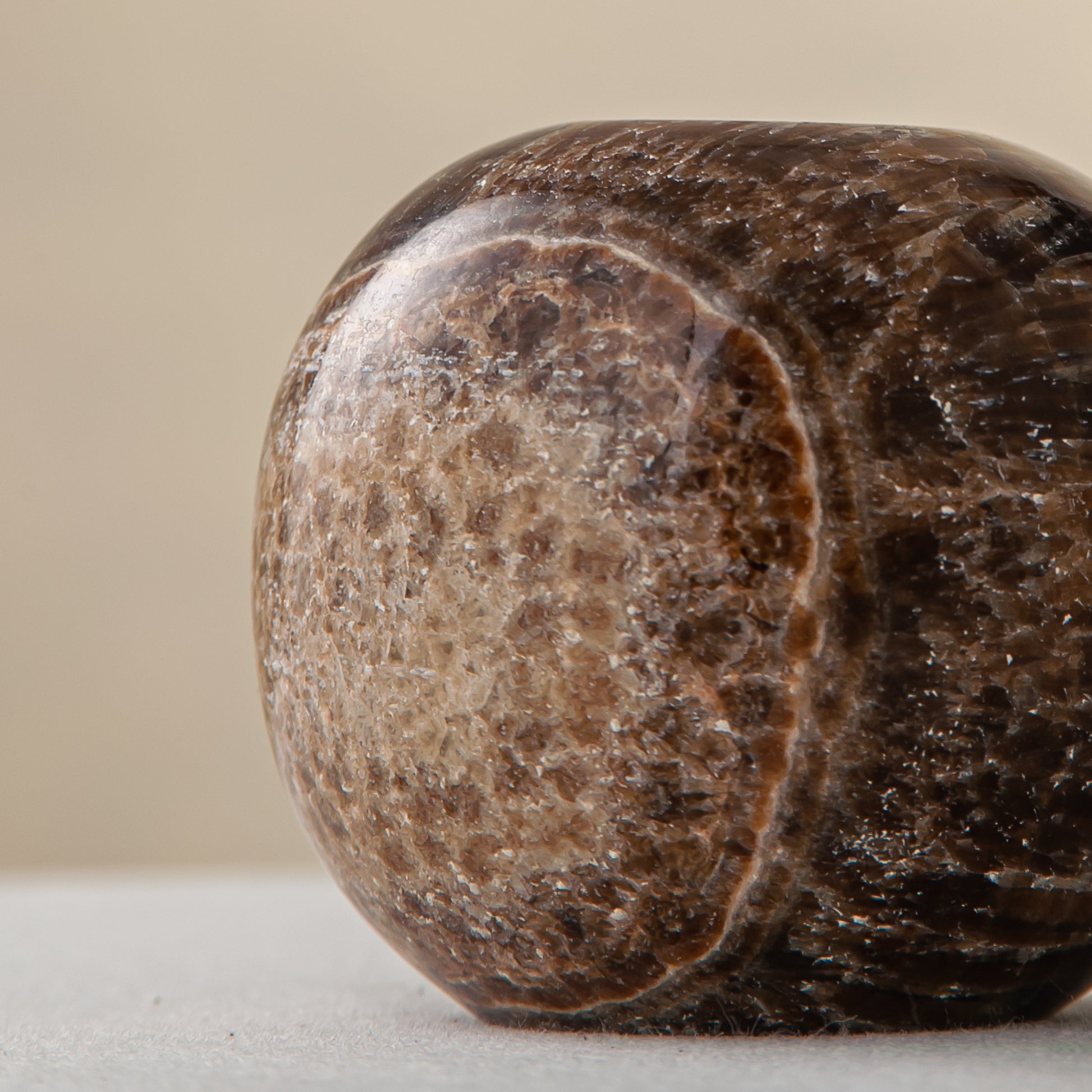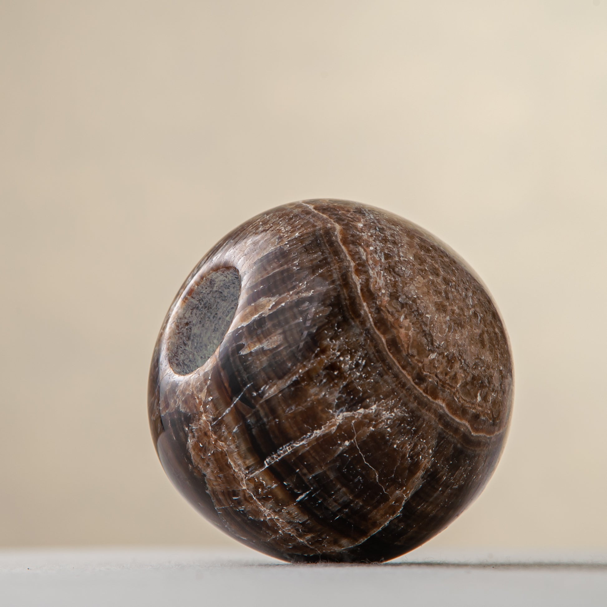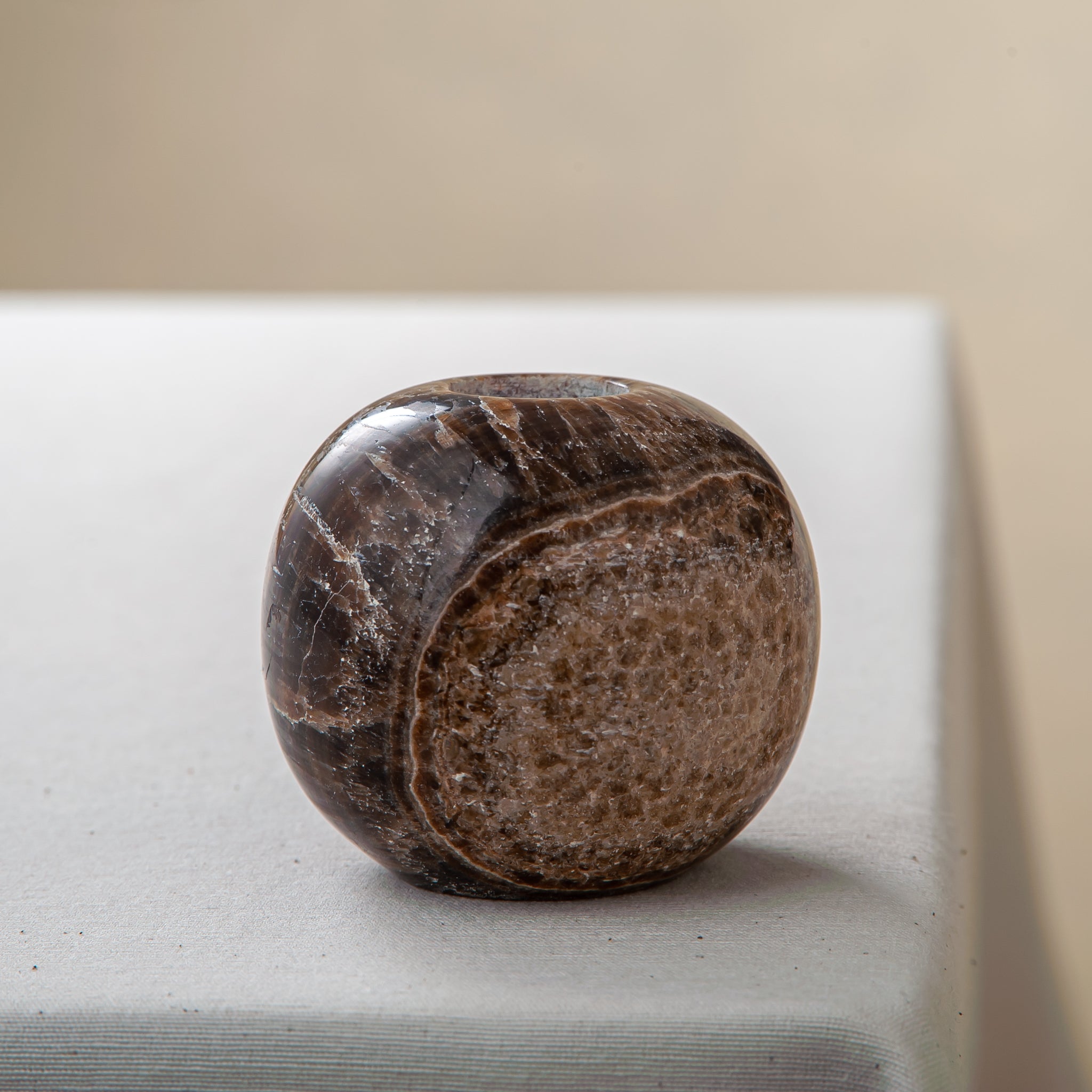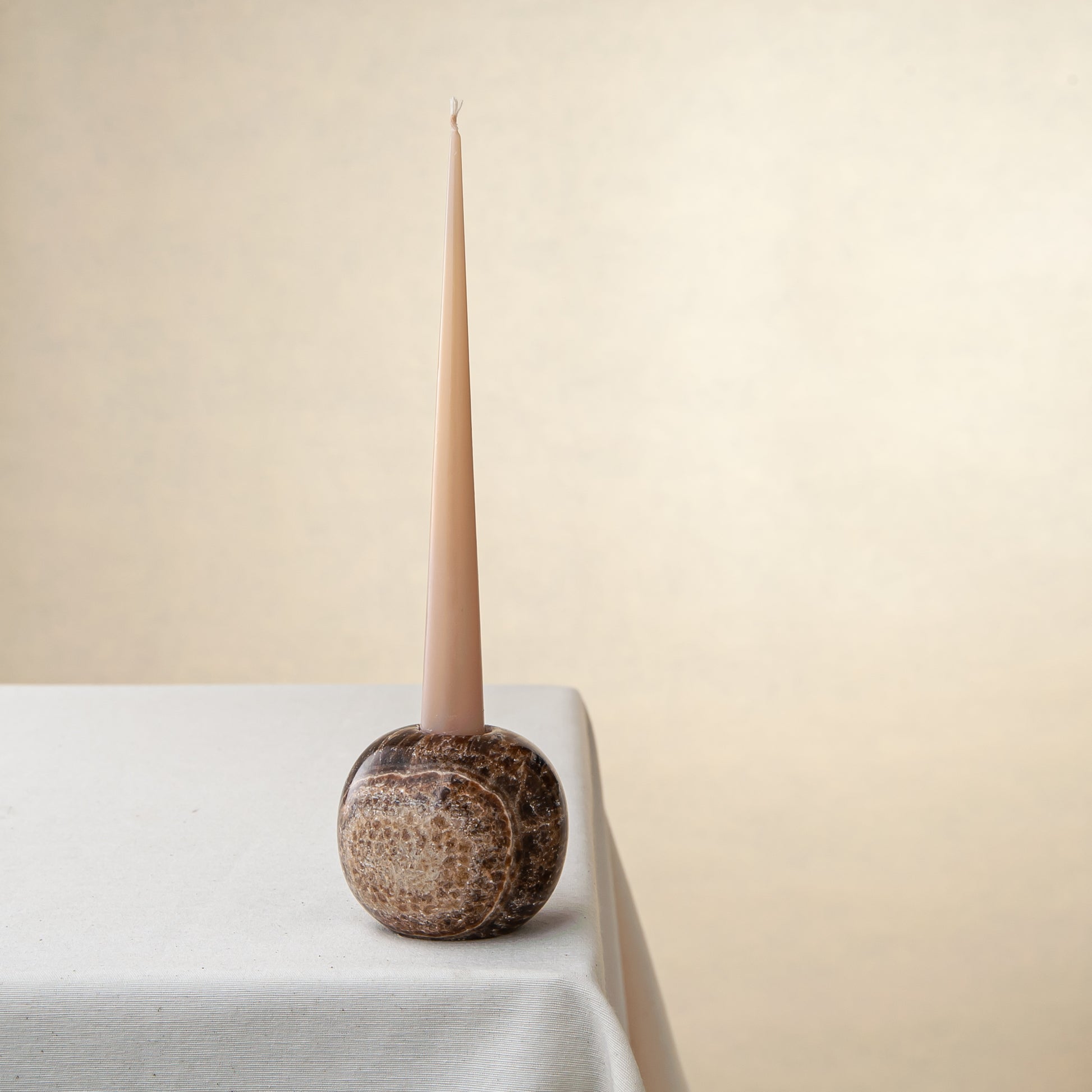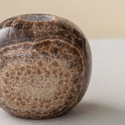 Der Fondale Kerzenhalter ist ein skulpturales Objekt, das in unserem Atelier aus einem seltenen Naturstein von Hand gefertigt wird. Seine tiefbraunen Farbtöne mit mineralischer Maserung bringen den einzigartigen Charakter des Steins zum Vorschein, während die abgerundete, bodenständige Form einen spannenden Kontrast zur schlanken, vertikalen Kerze bildet.