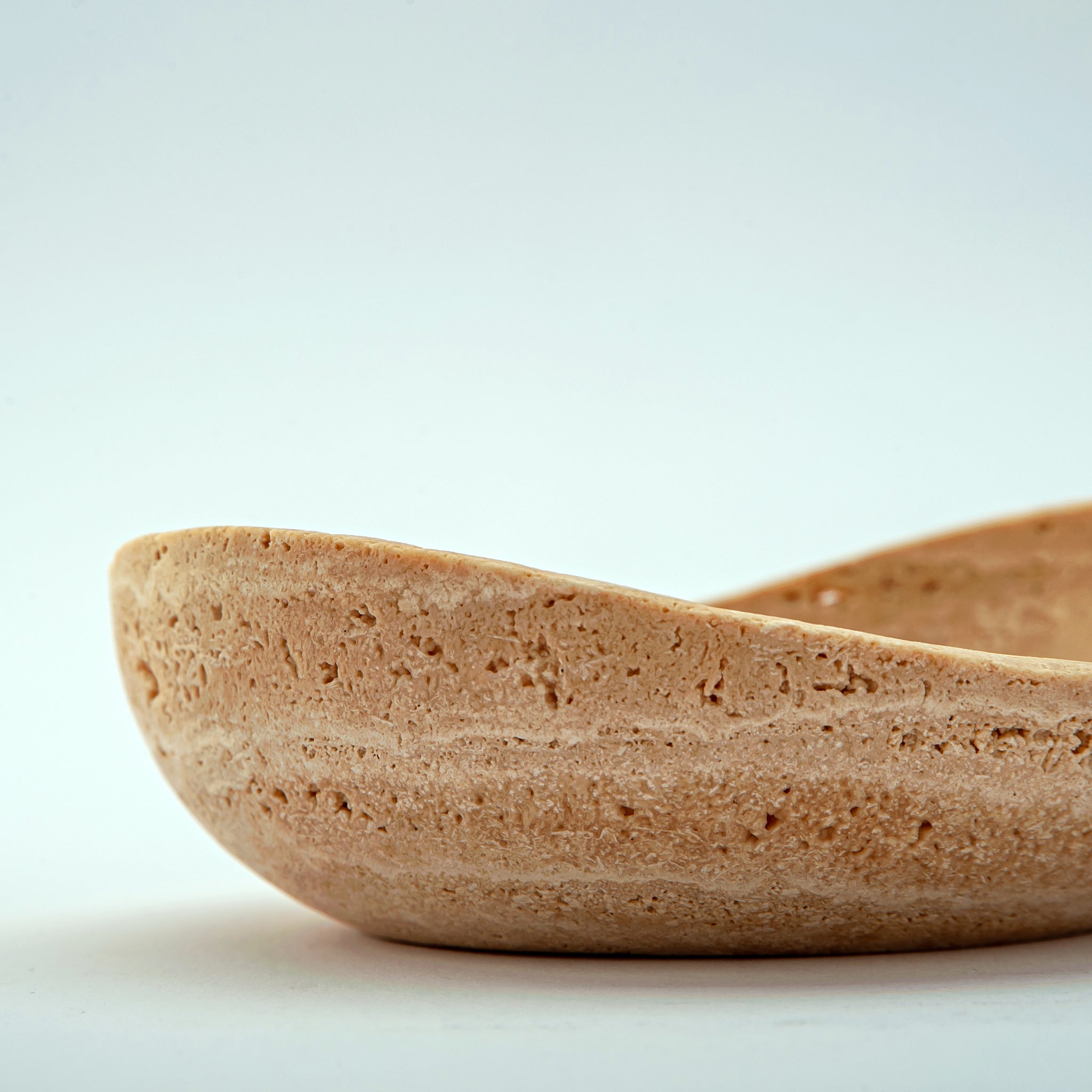 Jede Kurve fließt mit ruhiger Absicht und offenbart die zarten Poren und warmen Beigetöne des Steins, ein Beweis für seinen natürlichen Ursprung. Die subtile Unregelmäßigkeit der Schale verleiht ihr eine skulpturale Präsenz, während ihr minimalistisches Design dafür sorgt, dass sie mühelos raffiniert bleibt.