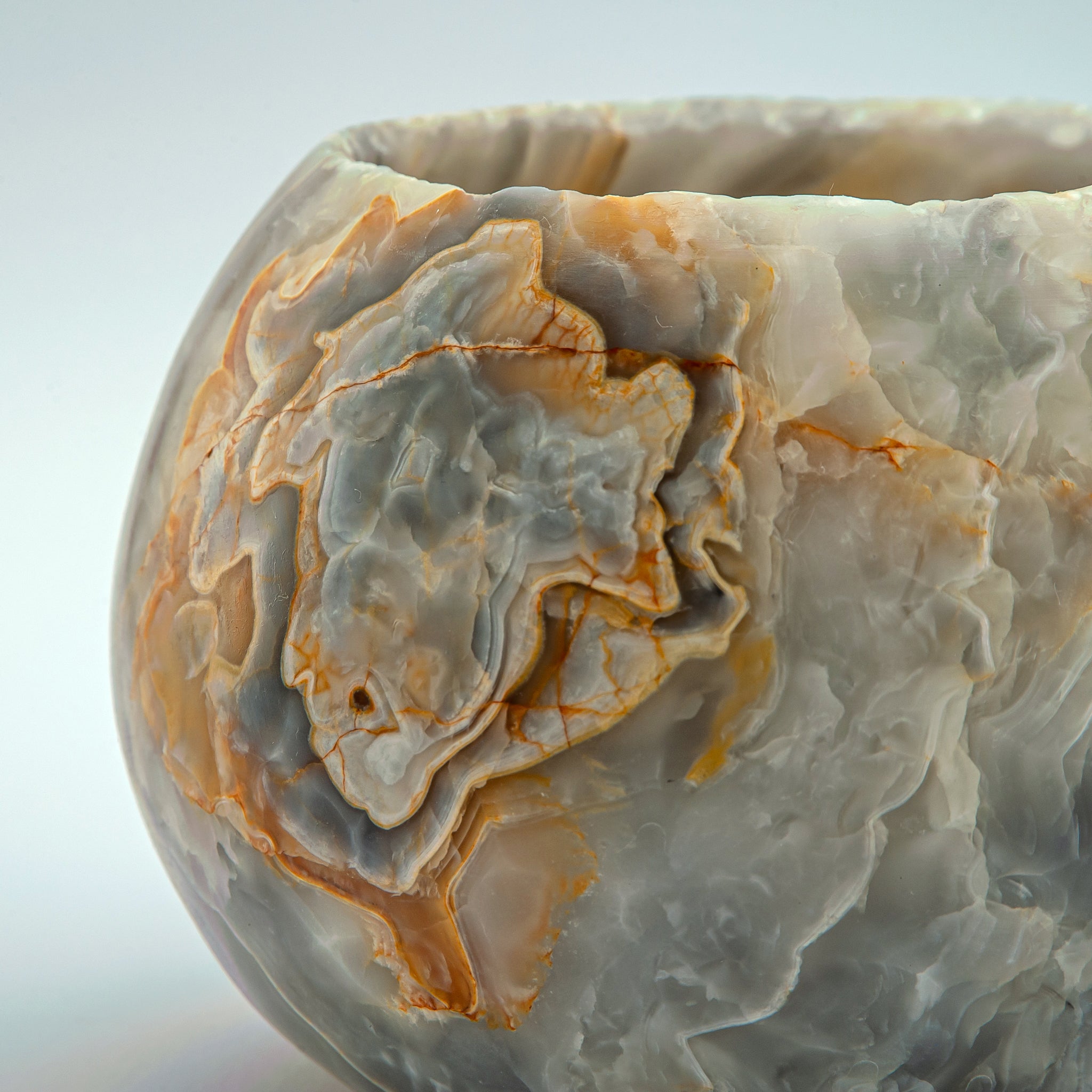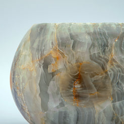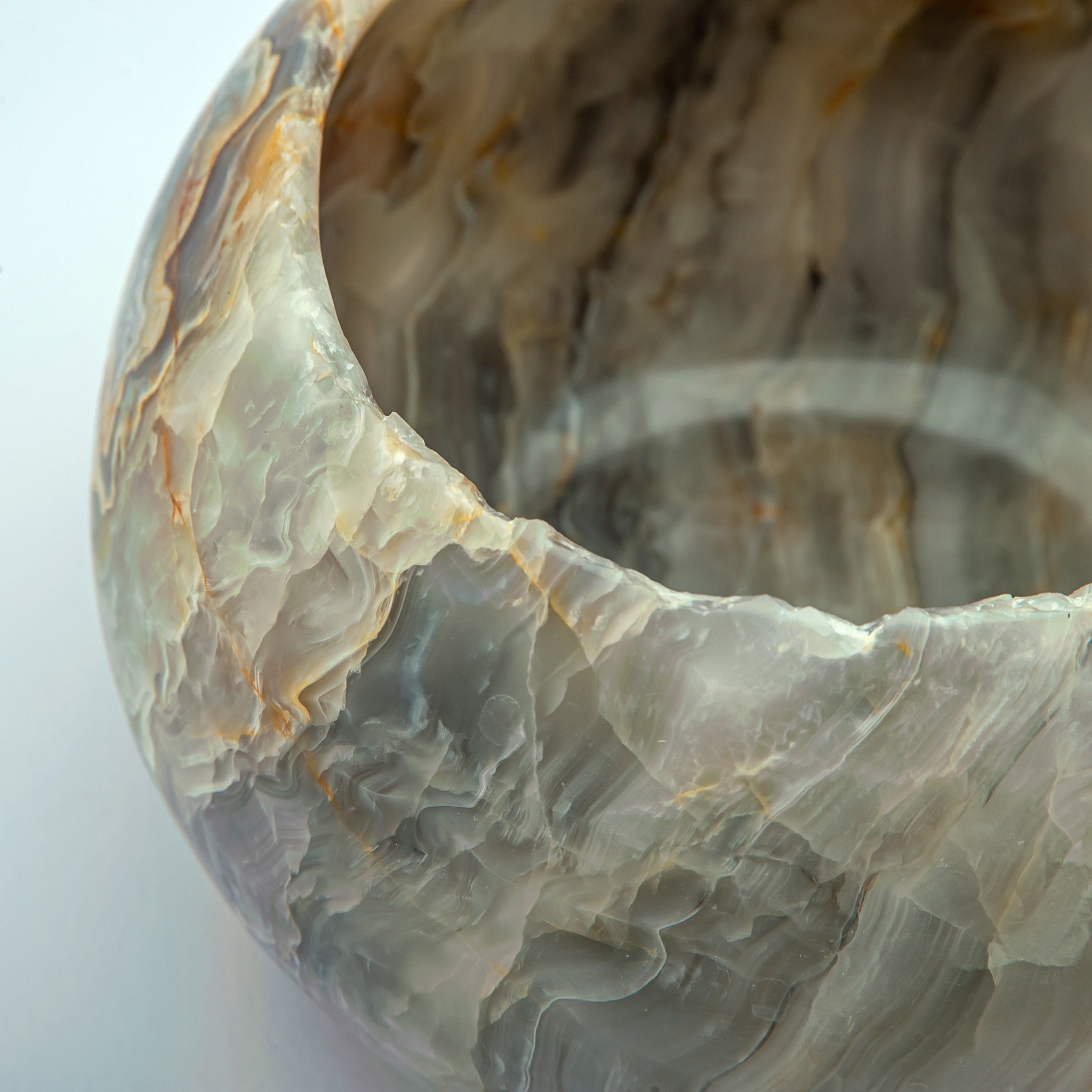 Jede Kurve und jede Welle in der Oberfläche erzählt eine Geschichte der Zeit, von Mineralien, die durch den Rhythmus der Natur geschichtet und geformt wurden. Die abgerundete Silhouette der Vase vermittelt ein Gefühl von Ausgewogenheit und Ruhe, während die leuchtende Qualität des Onyx das Licht mit subtiler Wärme einfängt und reflektiert.