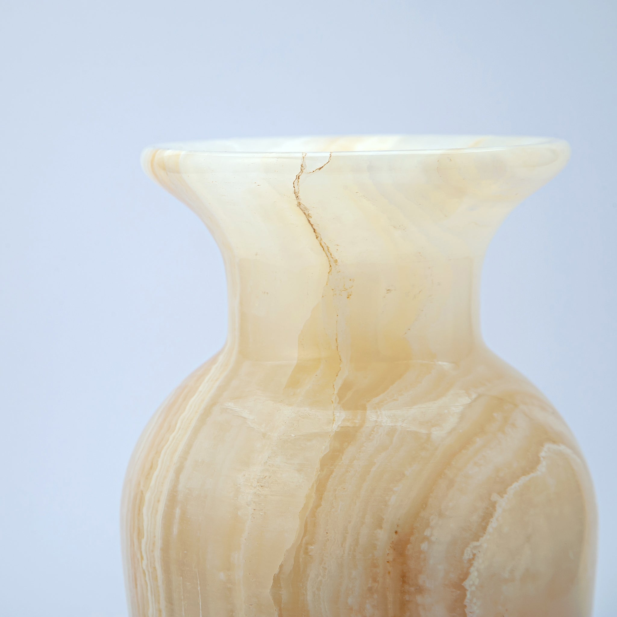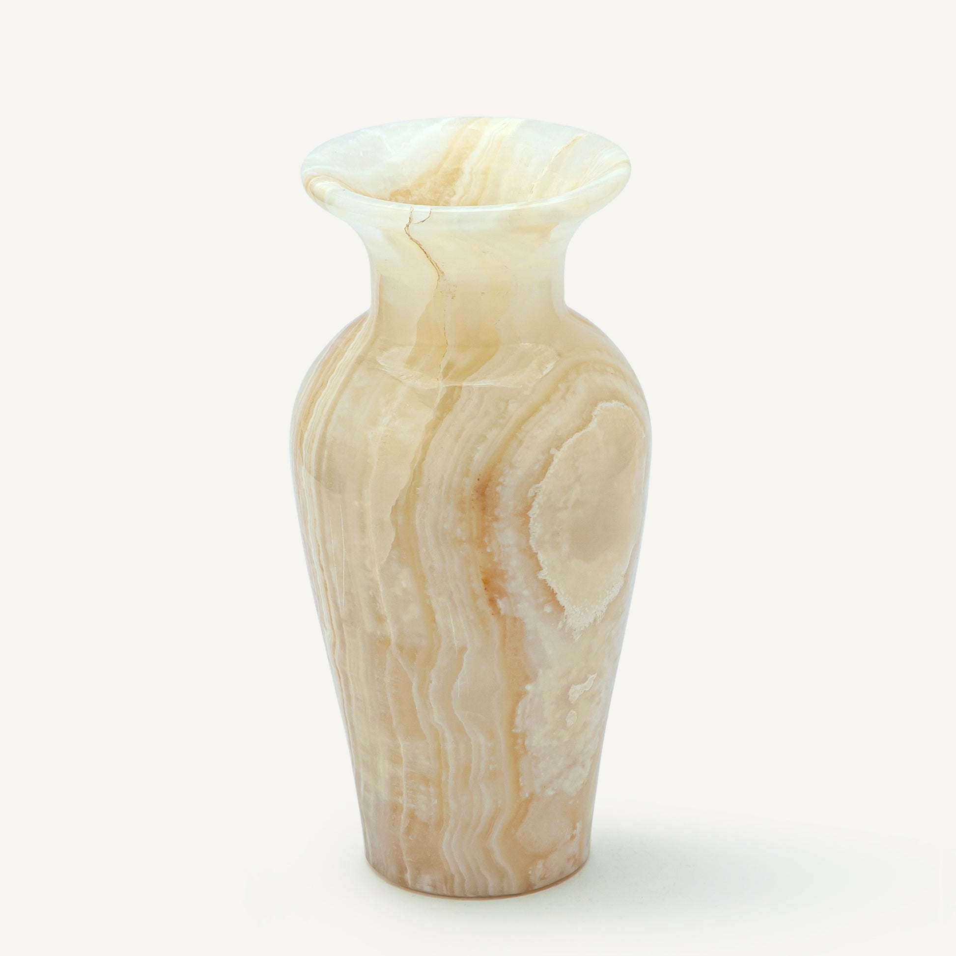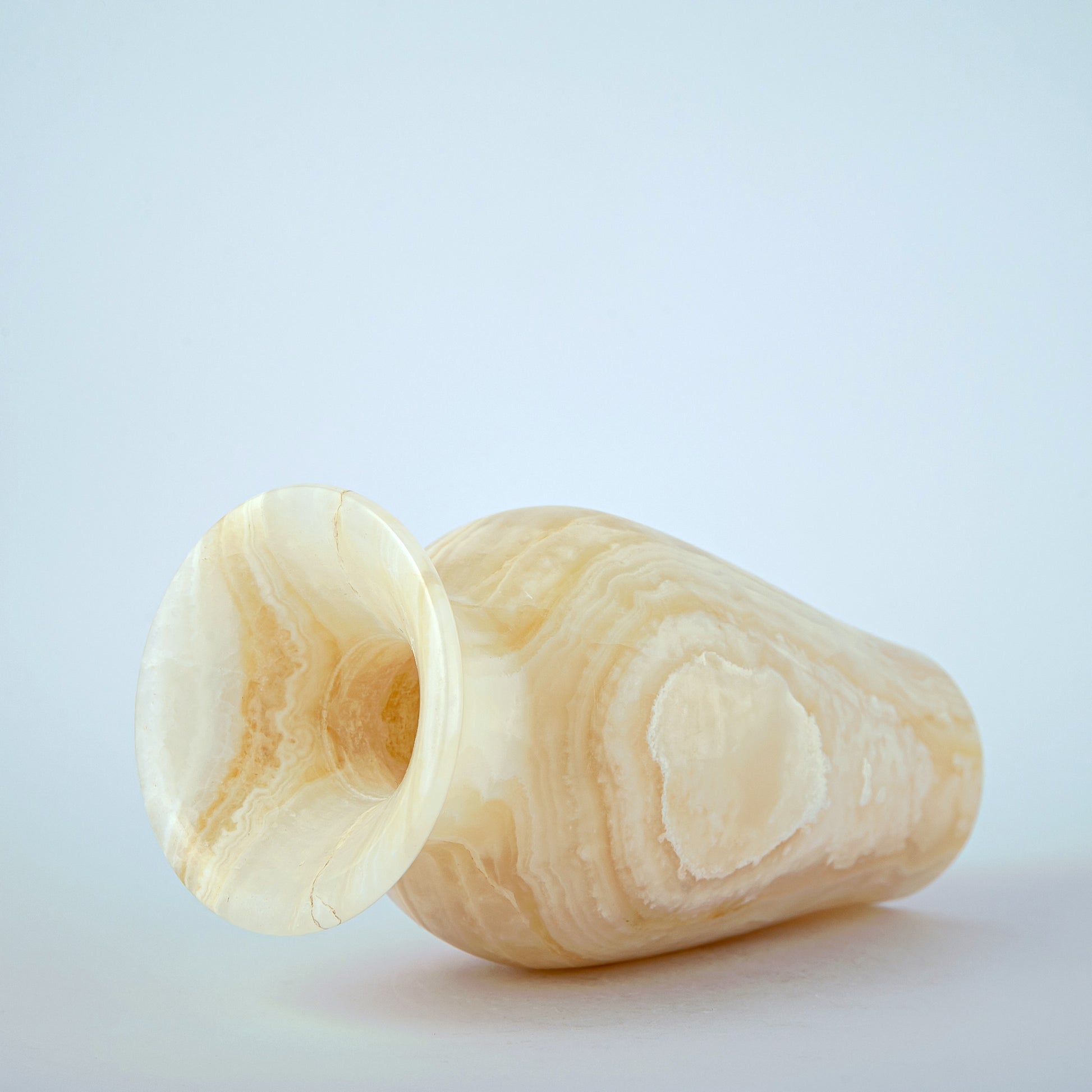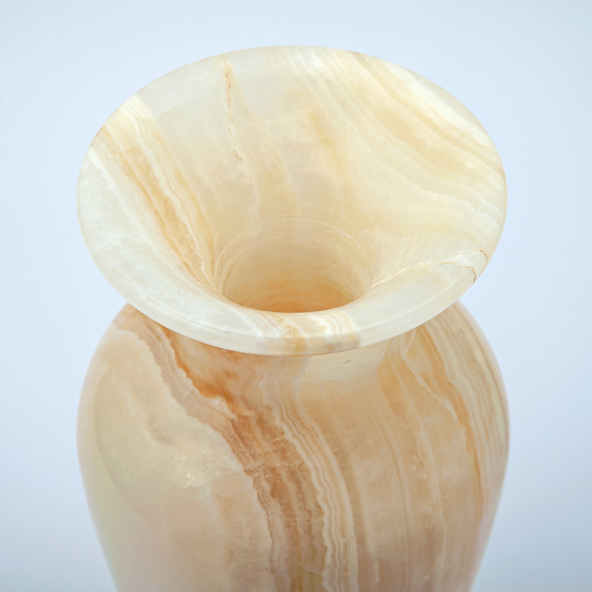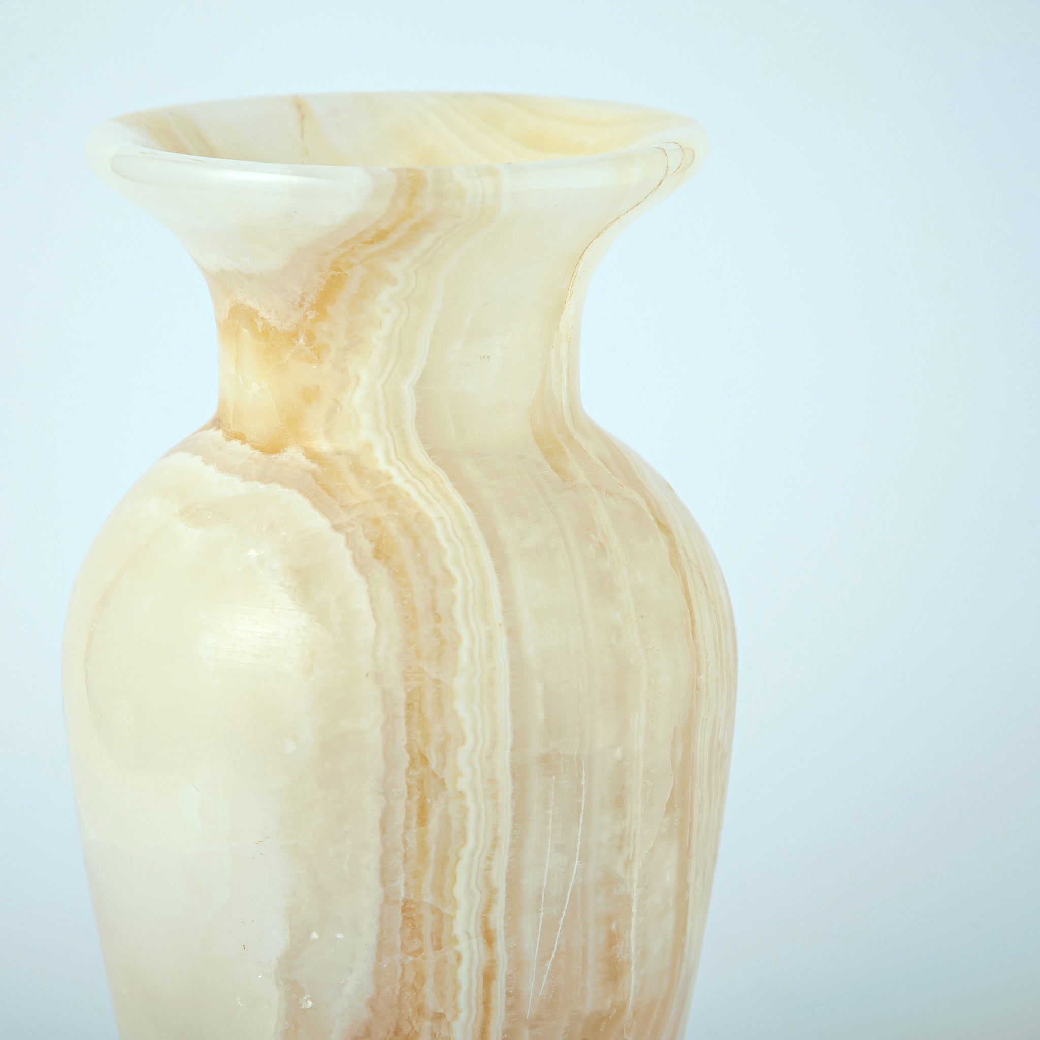 Die subtile Transluzenz lässt Licht durch den Onyx hindurchscheinen und verstärkt so seine Wärme und seinen natürlichen Glanz. Jedes Stück weist einzigartige Markierungen und Variationen auf, wodurch jede Vase zu einem Unikat wird.
