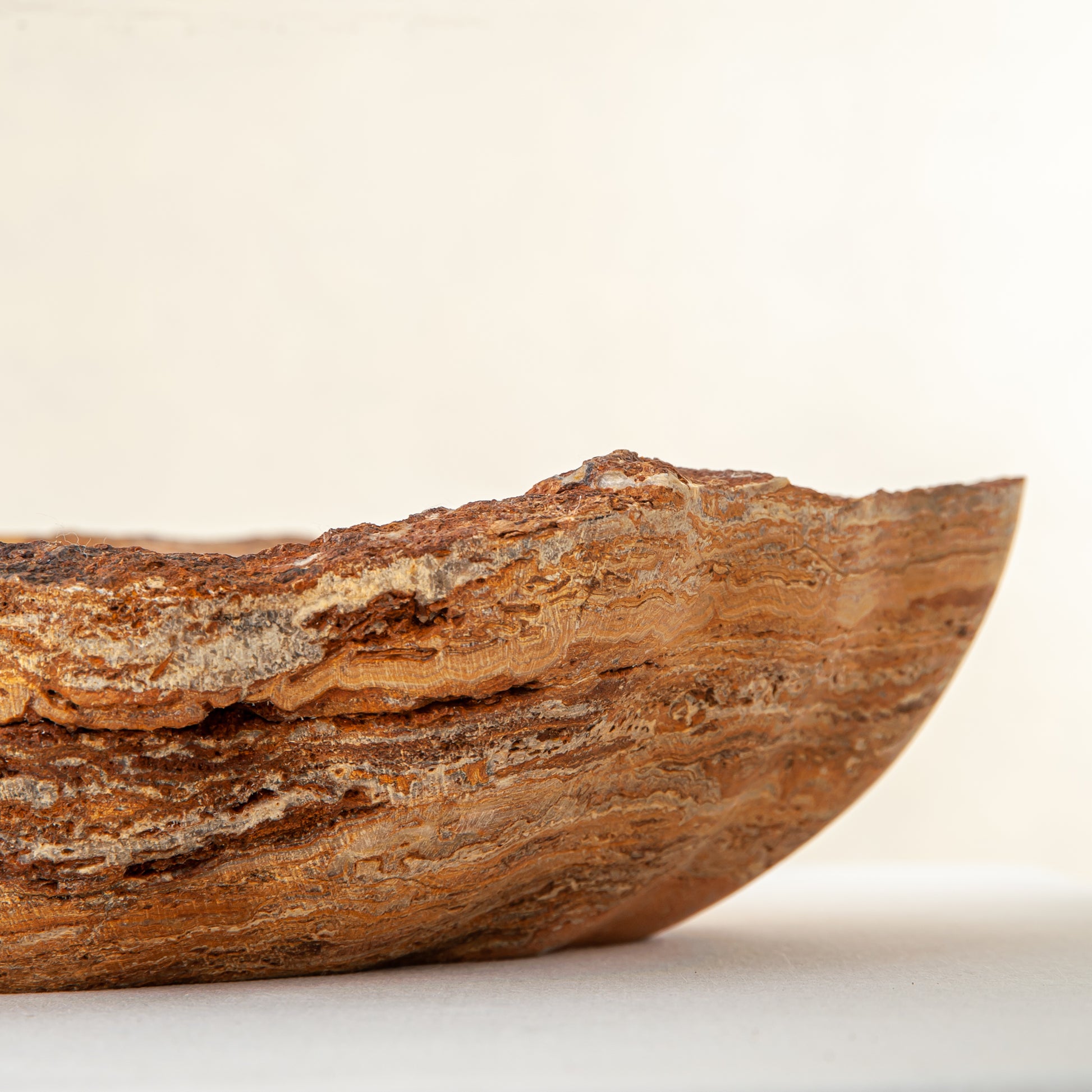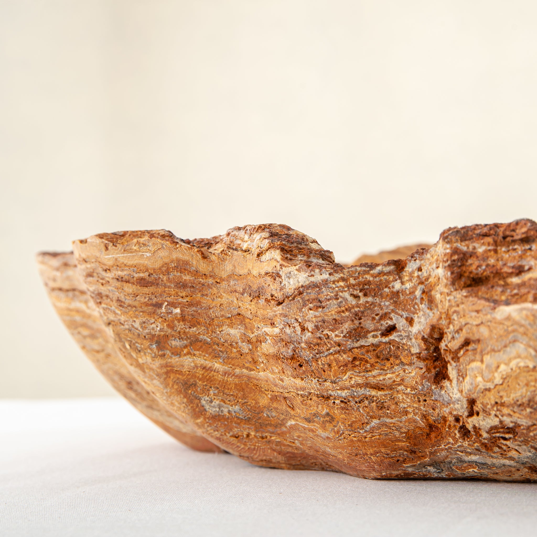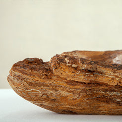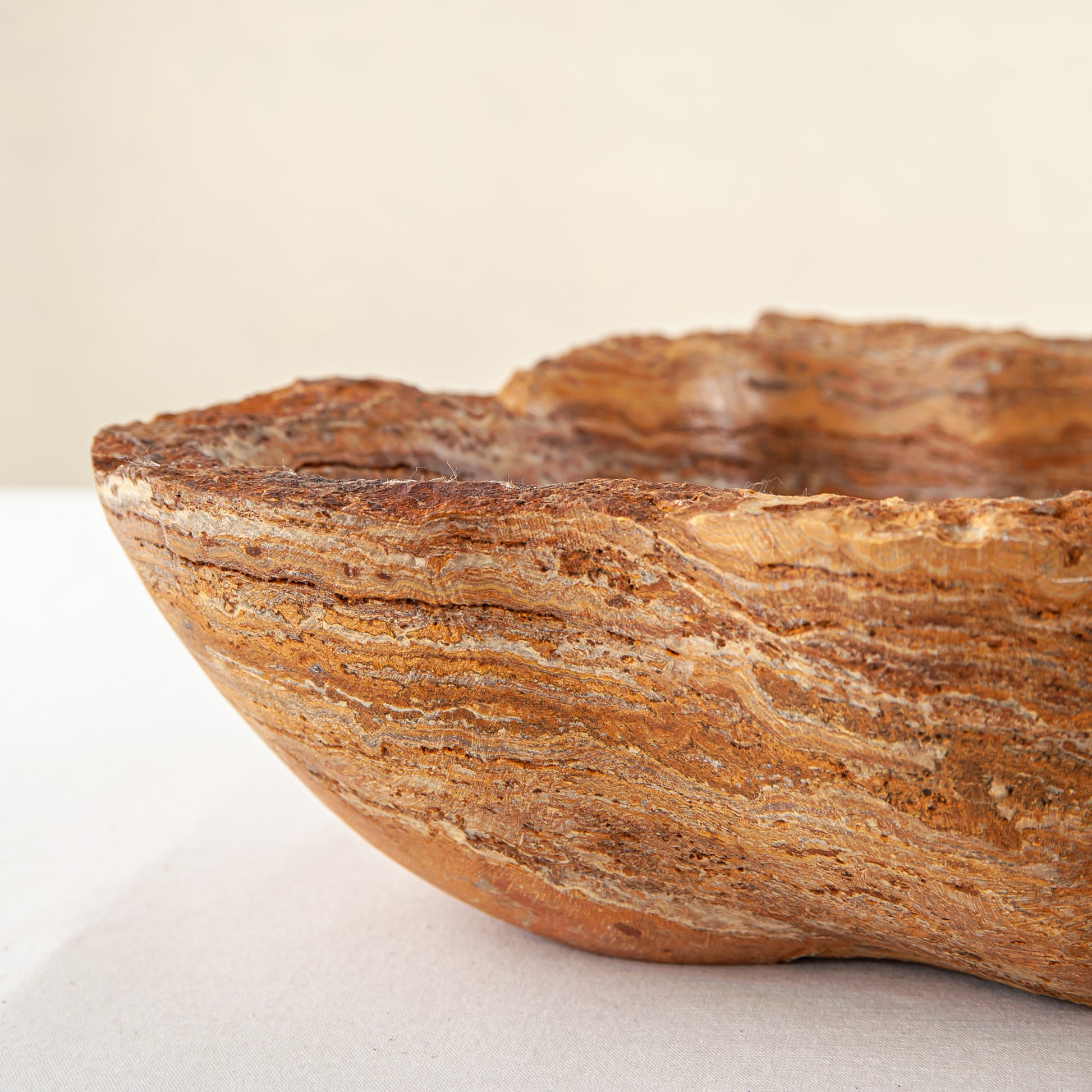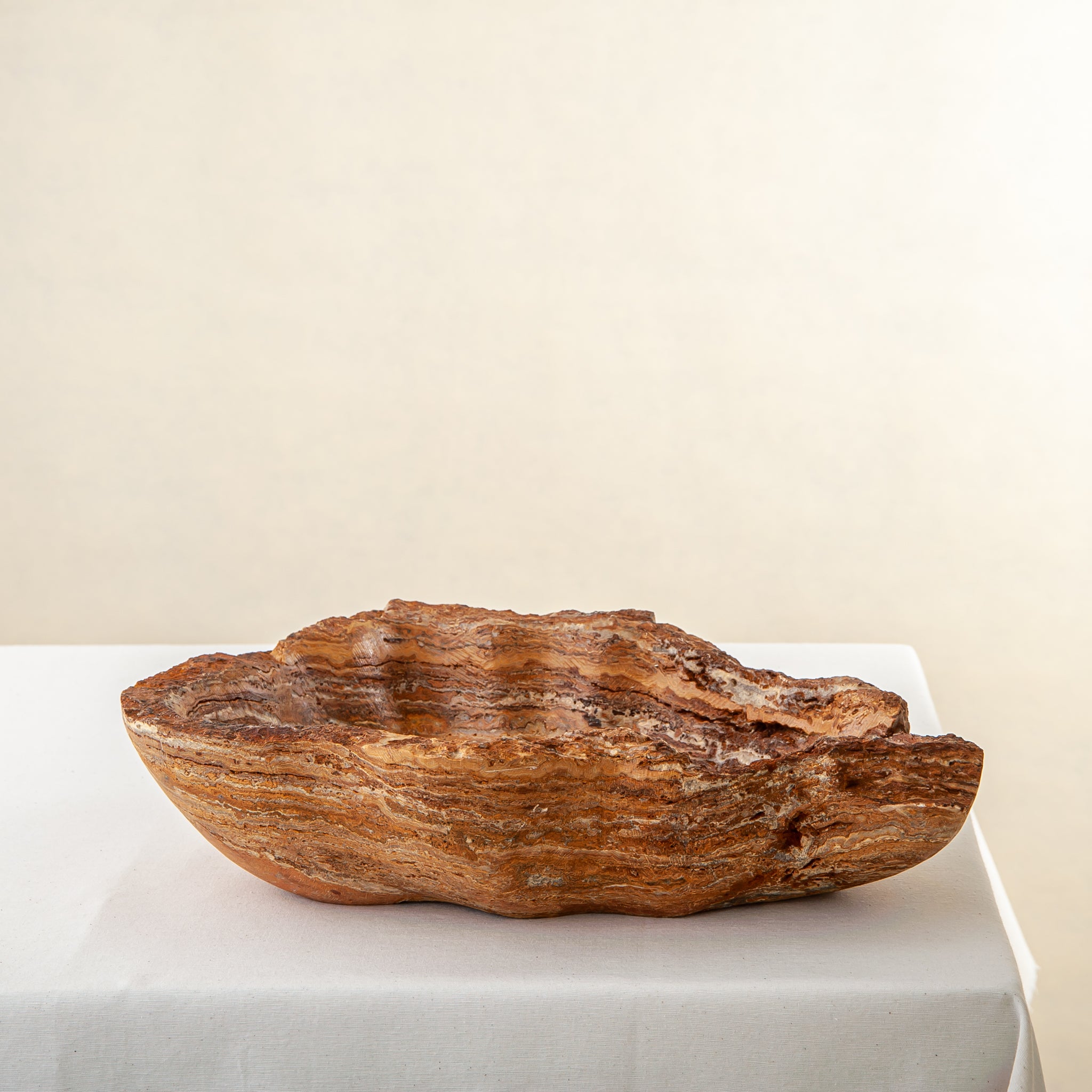 Die Schale zeichnet sich durch eine organische, wellenförmige Silhouette aus, die den natürlichen Schichten des Steins folgt und ein fließendes Inneres und eine taktile, rohe Außenseite schafft. Keine zwei Stücke sind jemals gleich – dieses Objekt existiert als Einzelstück, das nur einem einzigen Sammler auf der Welt gehört.