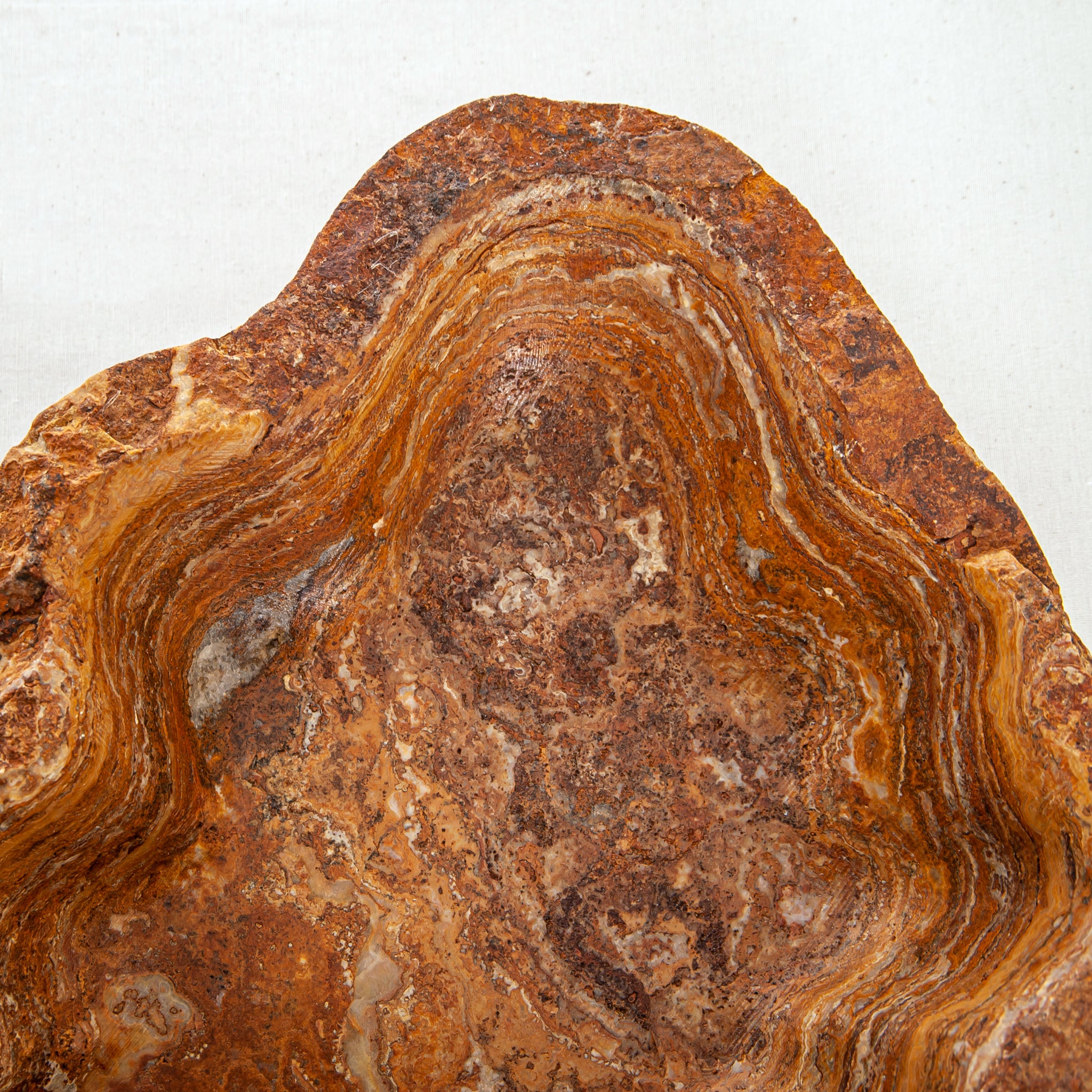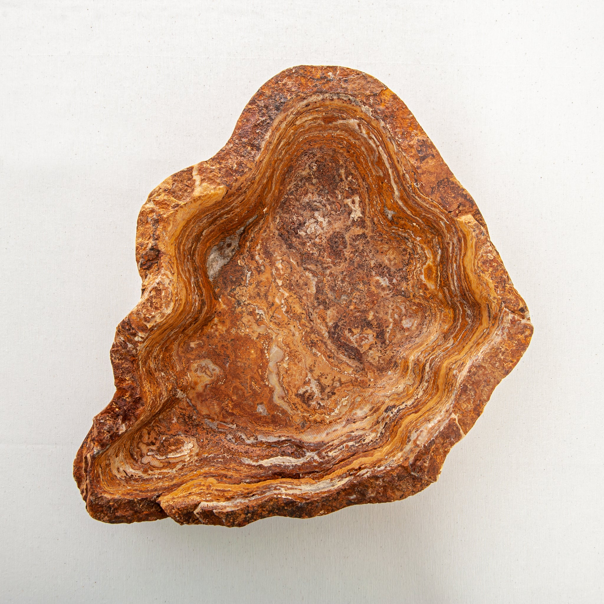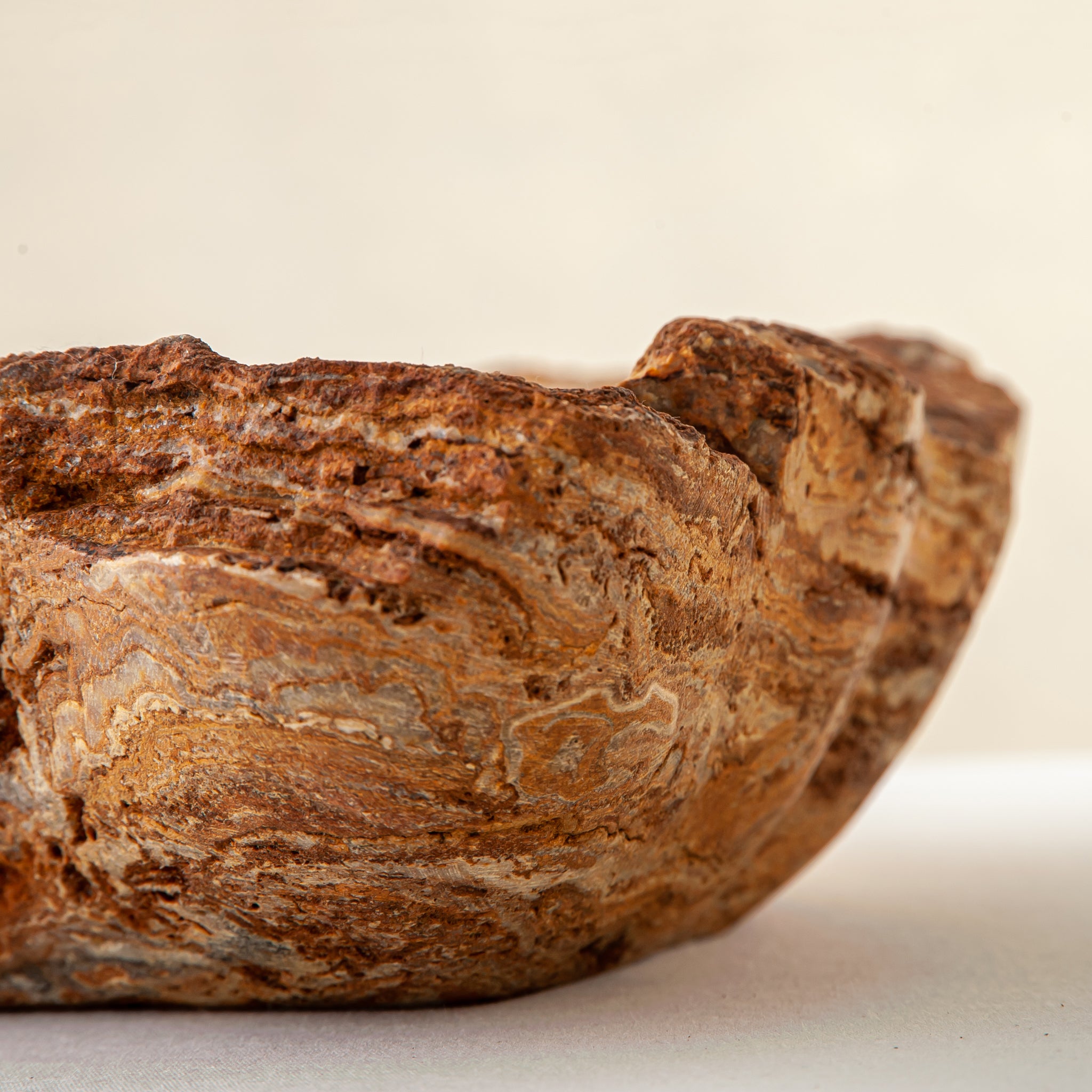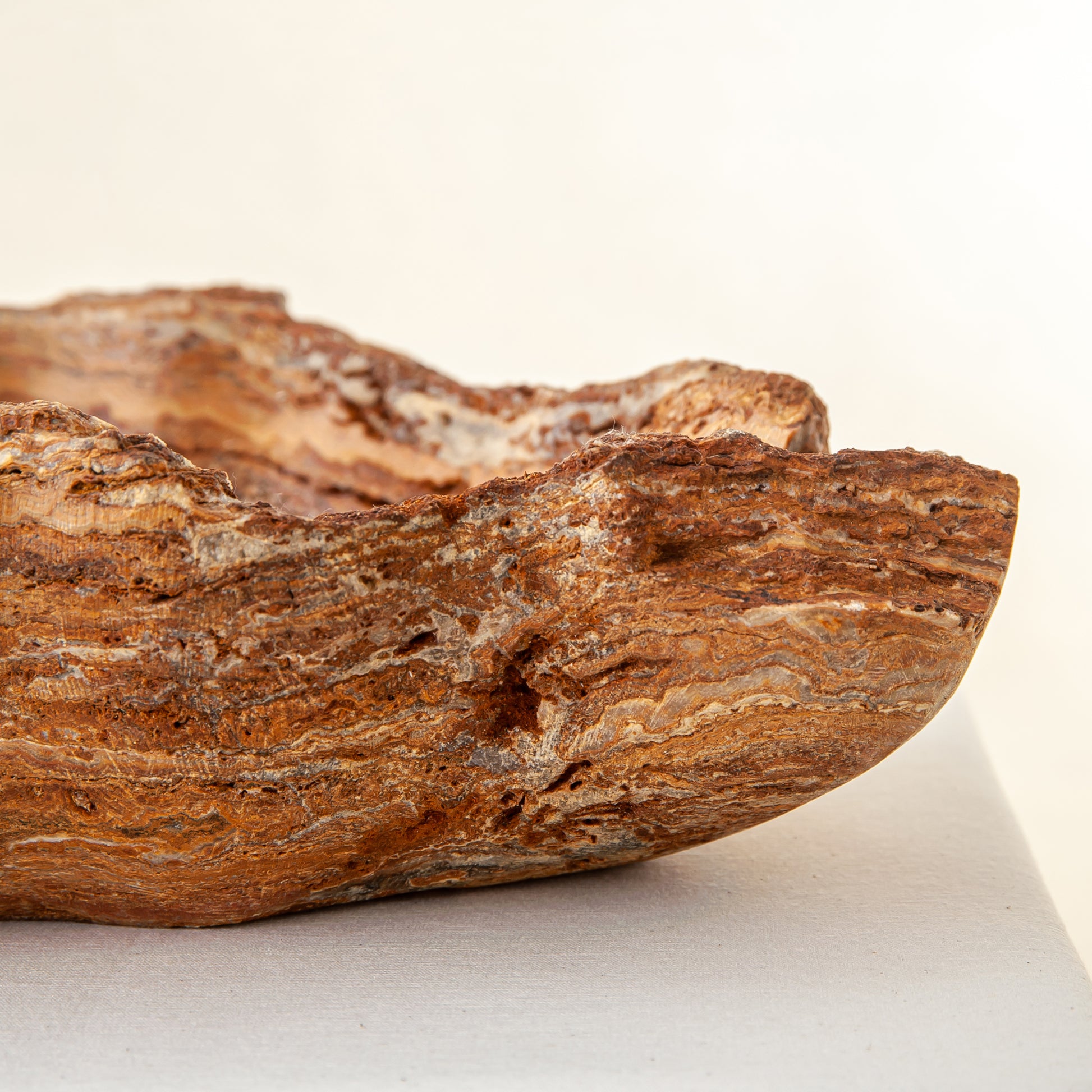 Die Schale zeichnet sich durch eine organische, wellenförmige Silhouette aus, die den natürlichen Schichten des Steins folgt und ein fließendes Inneres und eine taktile, rohe Außenseite schafft. Keine zwei Stücke sind jemals gleich – dieses Objekt existiert als Einzelstück, das nur einem einzigen Sammler auf der Welt gehört.