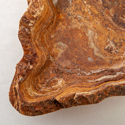 Die Orophé Schale ist ein einzigartiges Schalenobjekt, das in unserem Atelier aus einem seltenen Naturstein handgefertigt wird. Ihre warmen Bernstein-, Ocker- und Erdtöne offenbaren geschichtete Mineralformationen, die im Laufe der Zeit geformt und sorgfältig von Hand ausgehöhlt wurden.