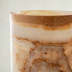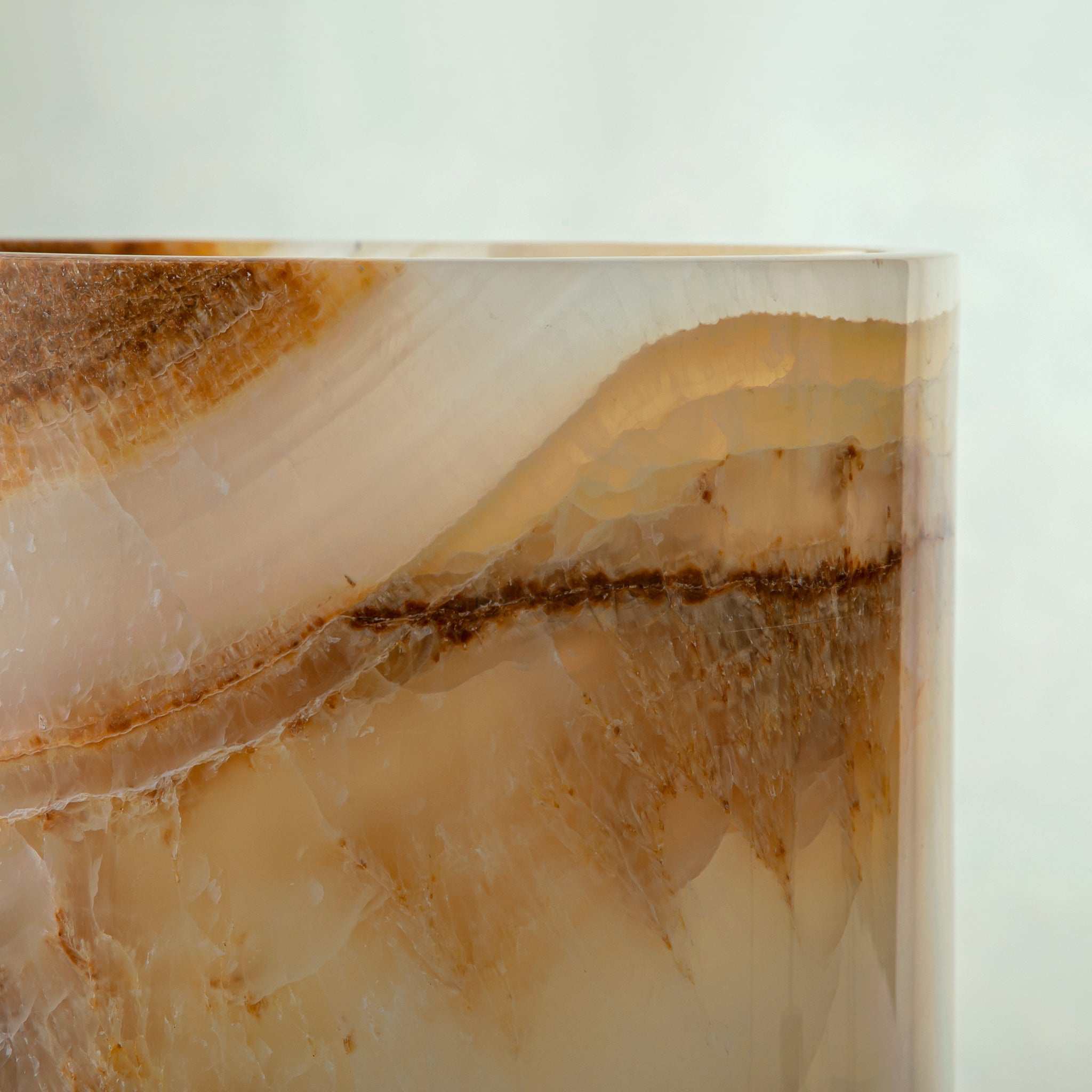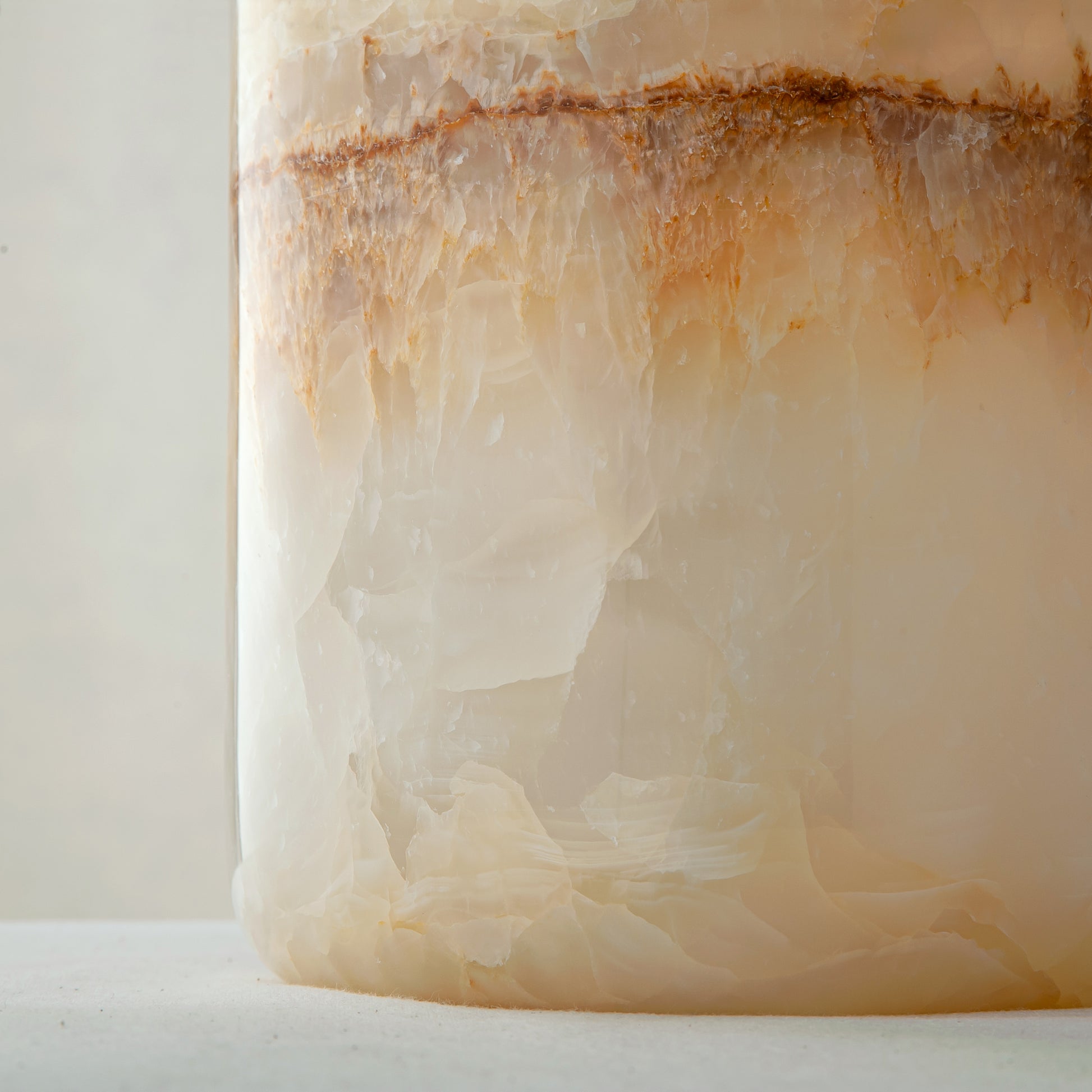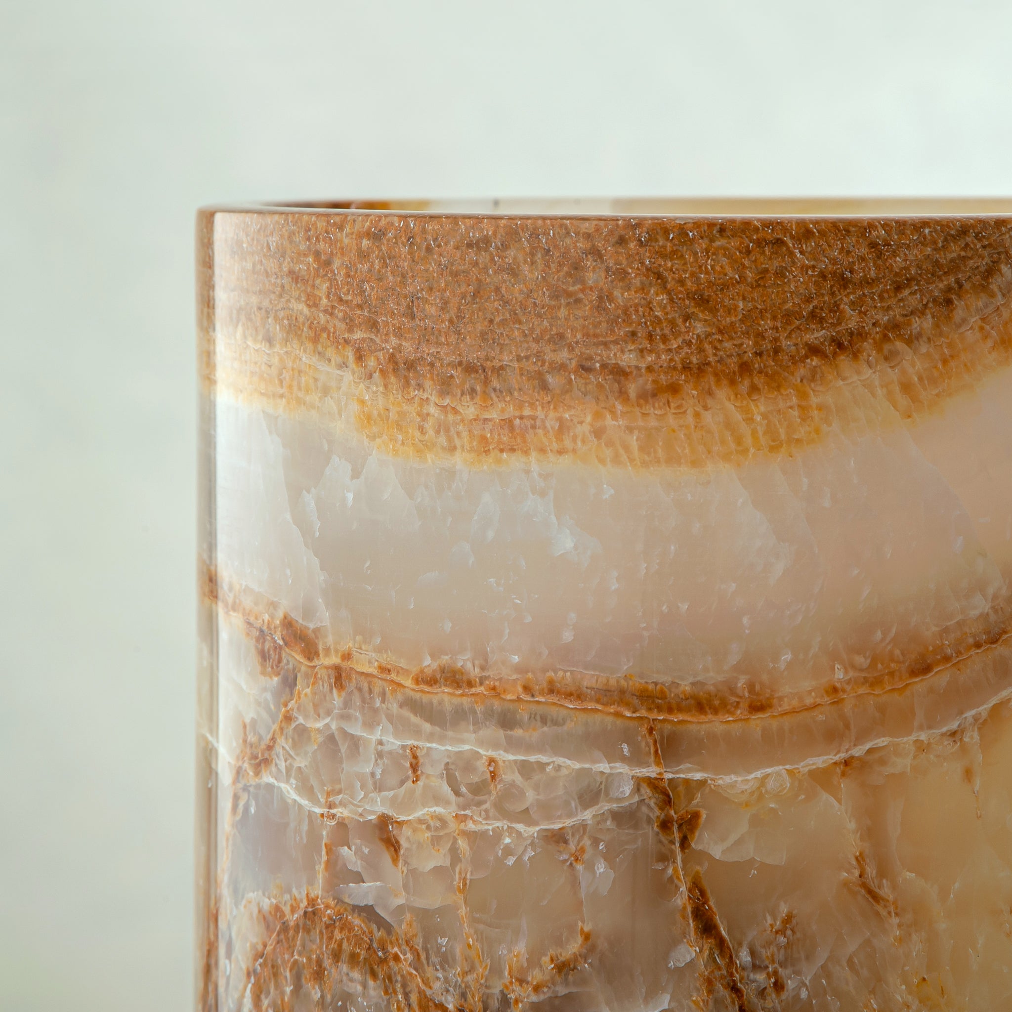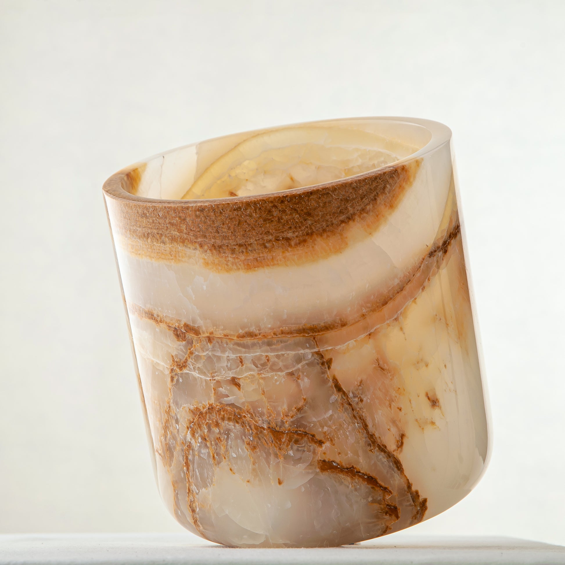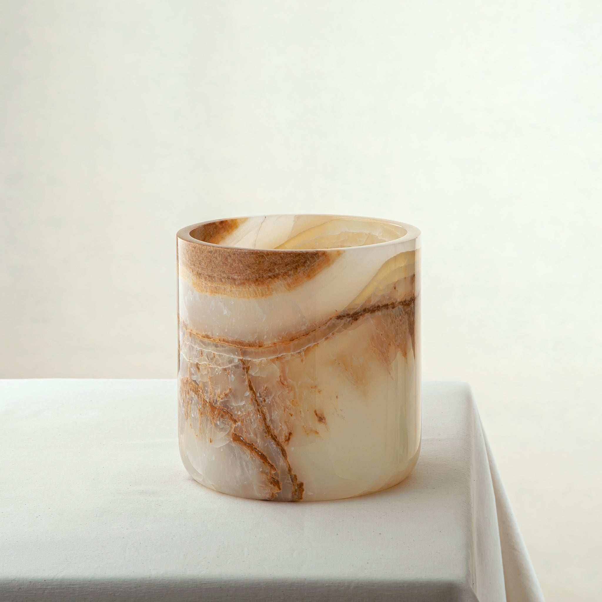 Der Orynd-Flaschenkühler verkörpert die stille Kraft von natürlichem Onyx, in dem sich Schichten aus warmem Bernstein, Elfenbein und weichem Sand zu einer organischen Harmonie verbinden. Jede Kurve des Steins offenbart einzigartige Muster, die im Laufe der Zeit entstanden sind und dem Stück eine gewisse Tiefe und ruhige Bewegung verleihen.