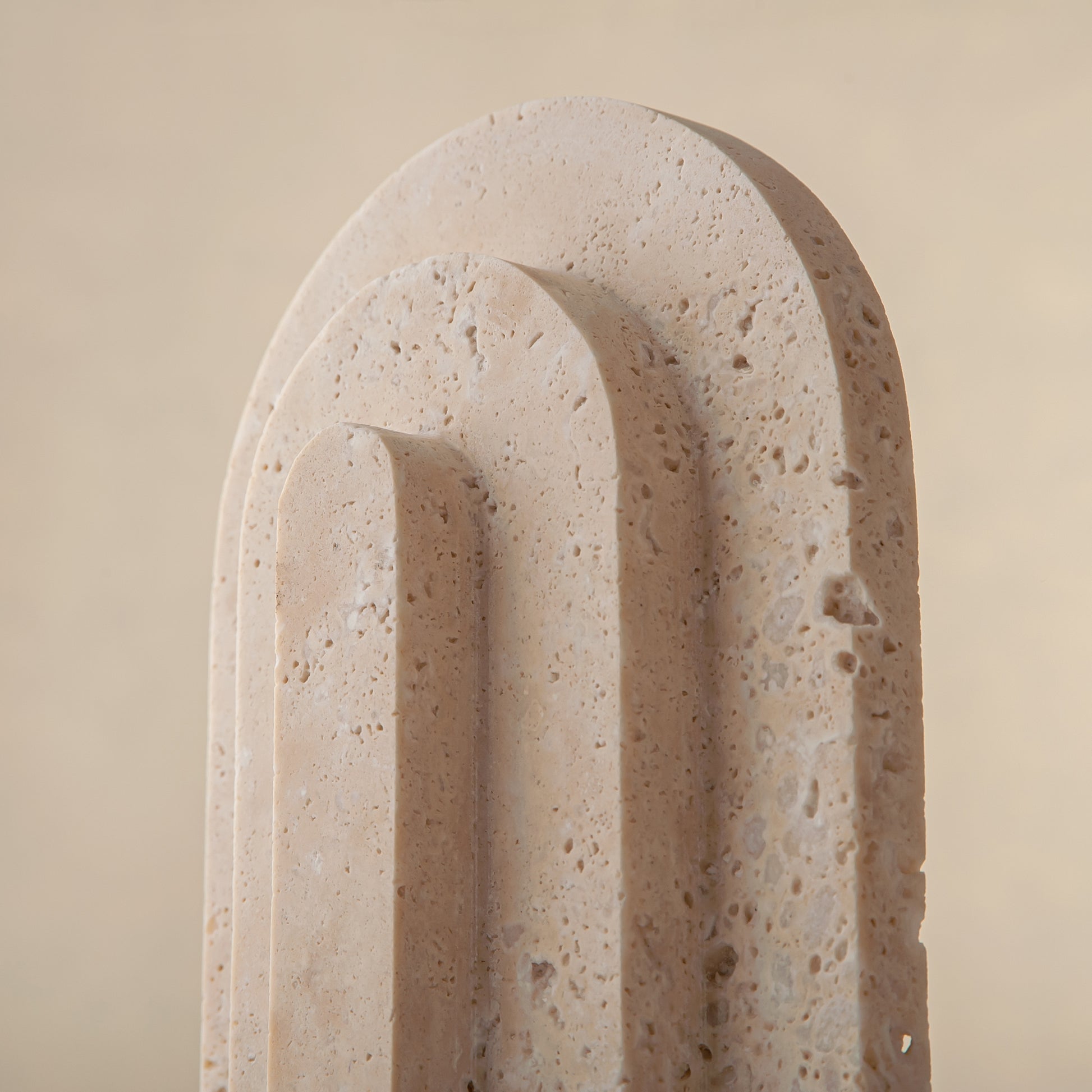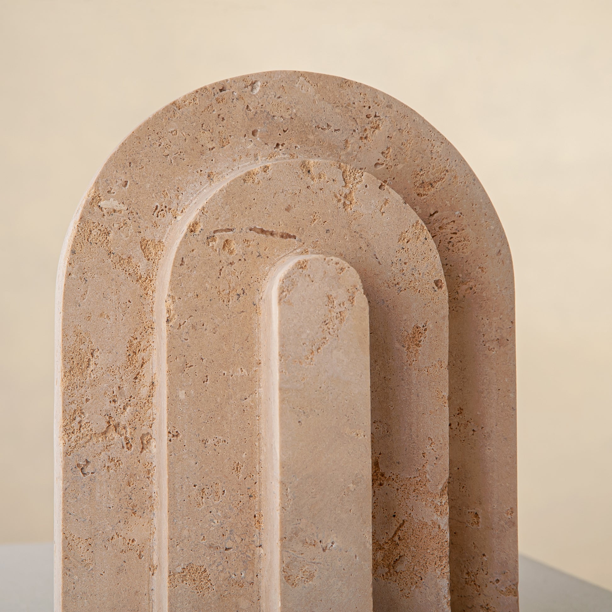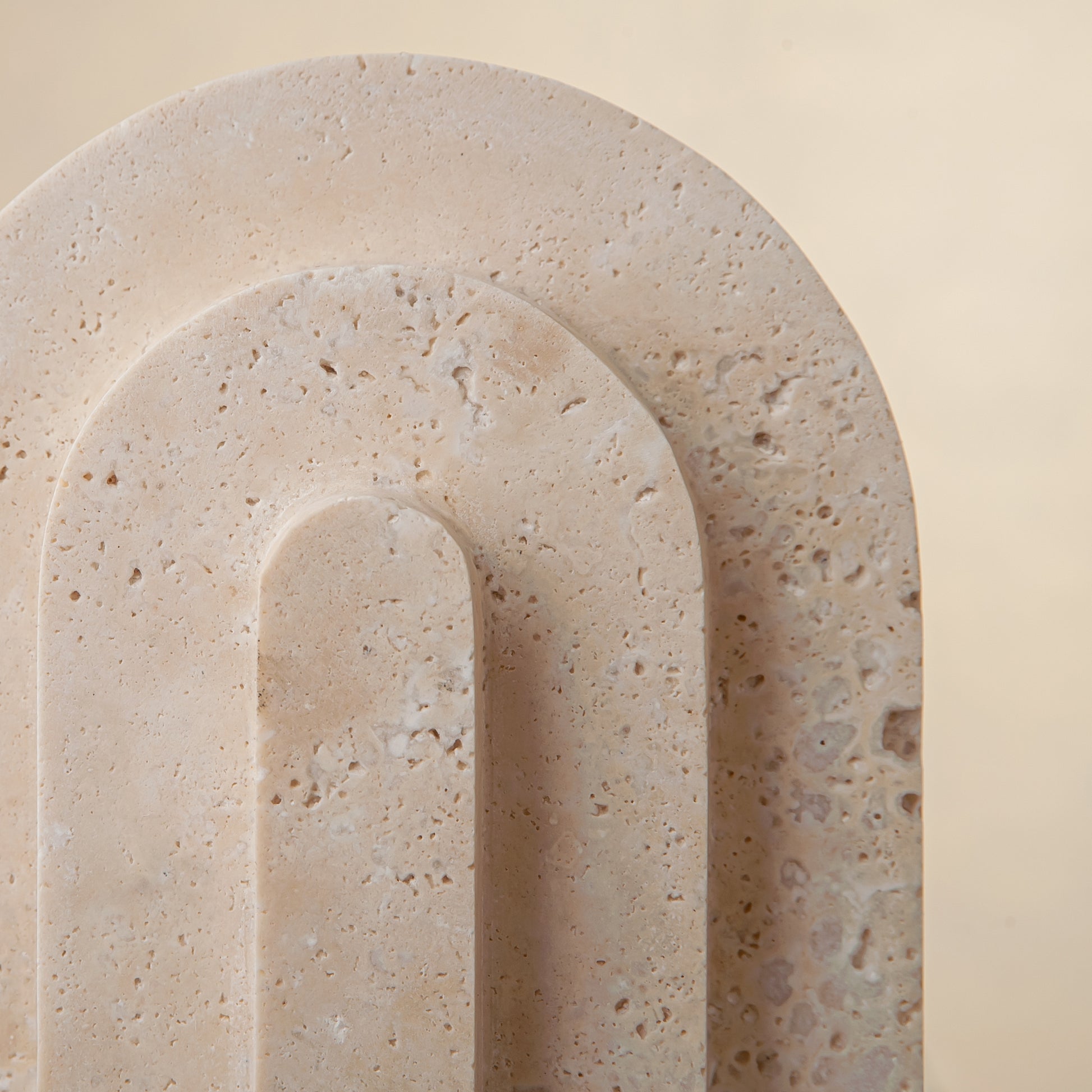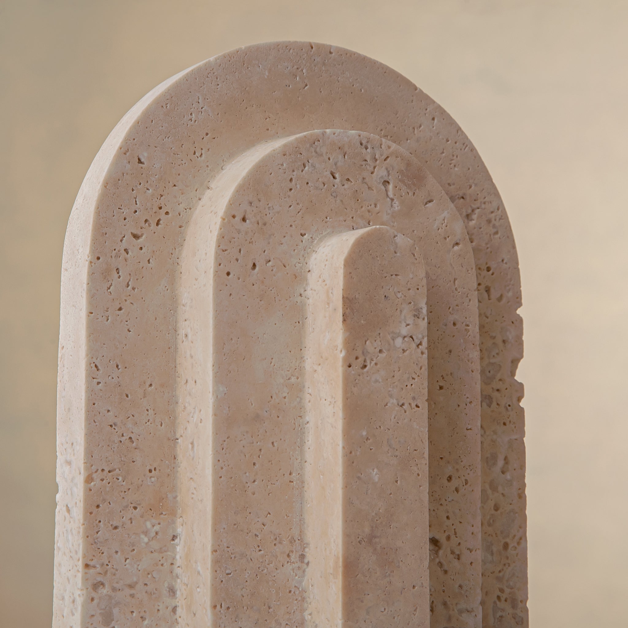 Der Porta Bookstand ist aus natürlichem beigem Travertin gefertigt und zeichnet sich durch seine gewölbte Silhouette und seine rhythmische, stufenförmige Form aus. Inspiriert von der klassischen Architektur erinnert seine Form an eine Tür oder einen Durchgang – solide, bodenständig und still monumental.