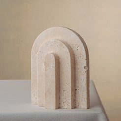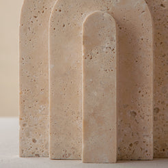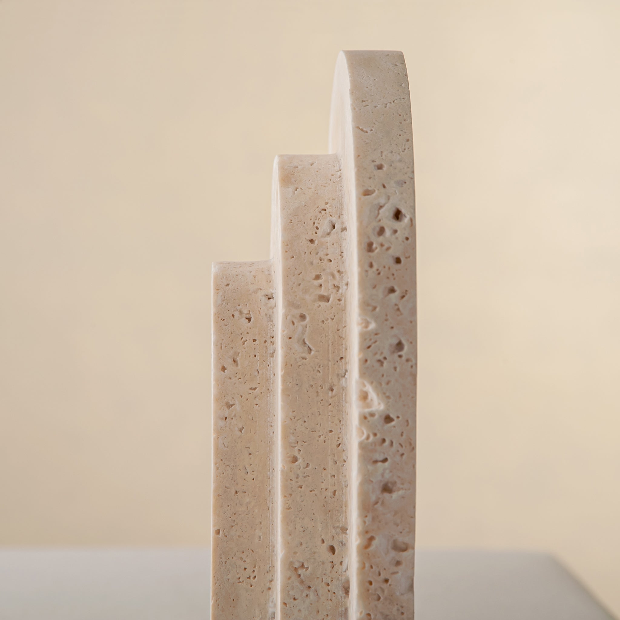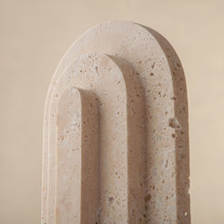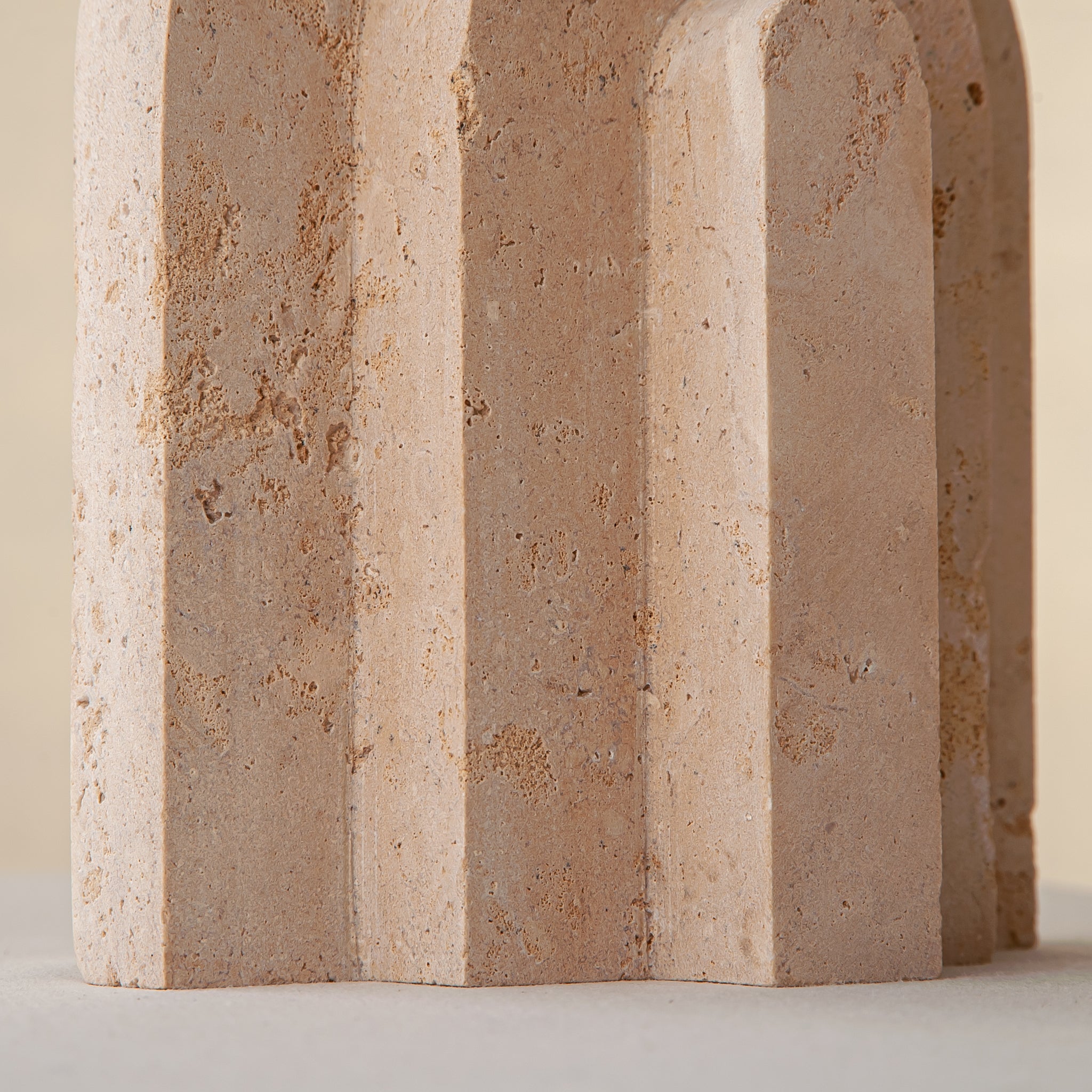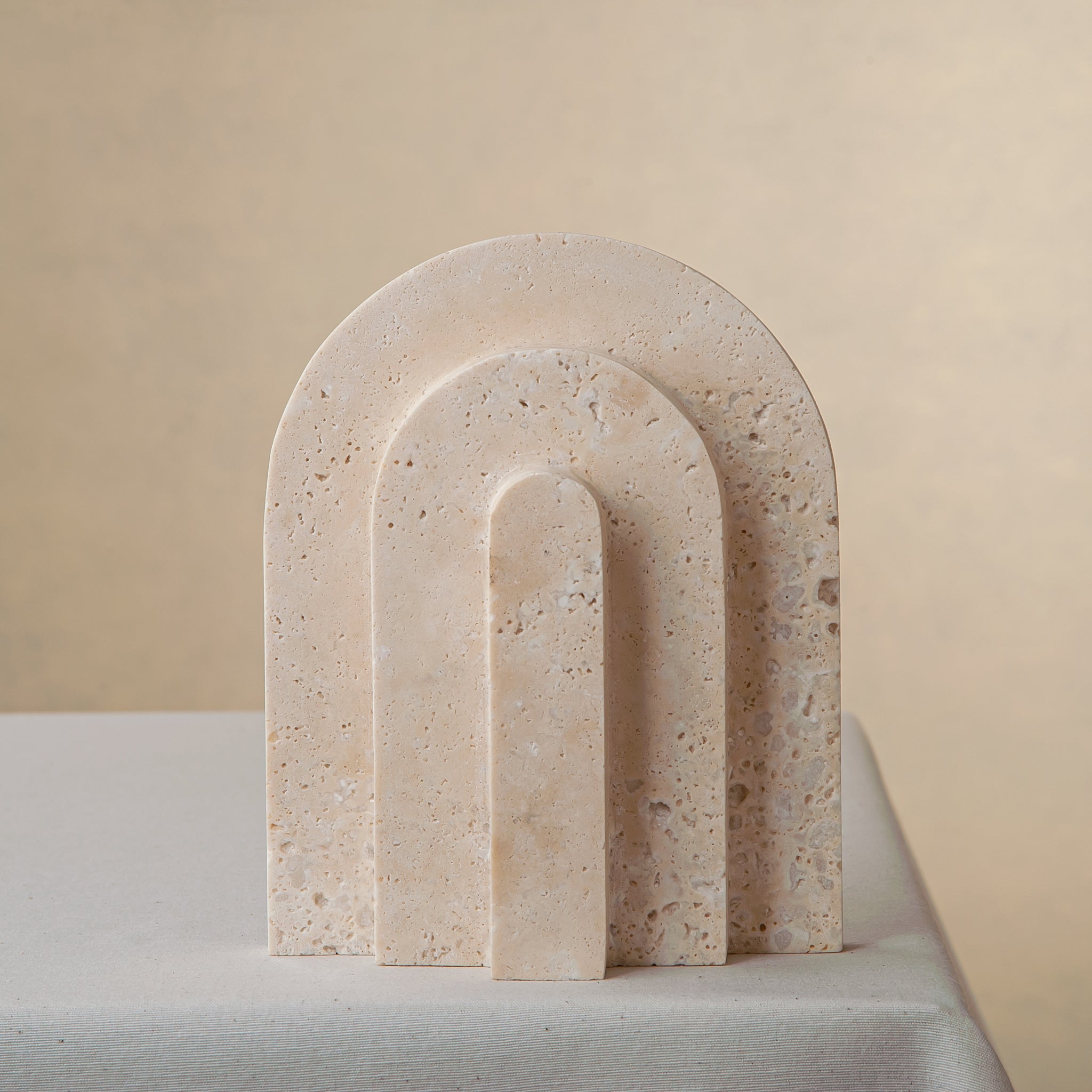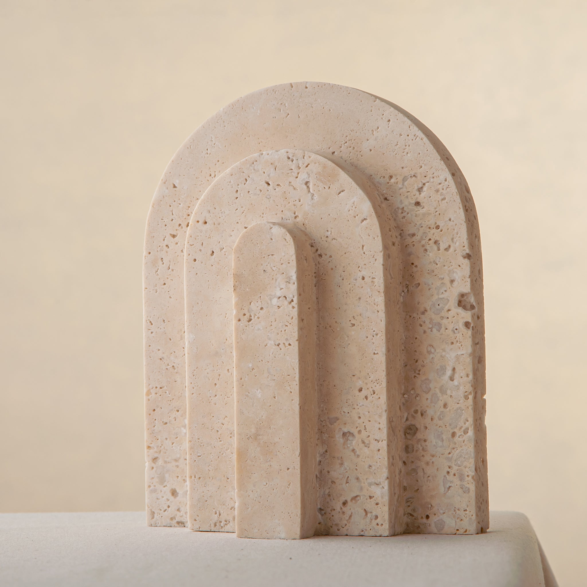 Der Porta Bookstand ist aus natürlichem beigem Travertin gefertigt und zeichnet sich durch seine gewölbte Silhouette und seine rhythmische, stufenförmige Form aus. Inspiriert von der klassischen Architektur erinnert seine Form an eine Tür oder einen Durchgang – solide, bodenständig und still monumental.
