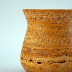 Die Ravenn-Vase offenbart die stille Kraft von natürlichem Travertin. Ihre warmen, goldenen Farbtöne und ihre geschichtete Textur spiegeln die organische Geschichte des Steins wider, während die weiche Silhouette und der ausgestellte Rand der Vase ein Gefühl von Ausgewogenheit und Raffinesse vermitteln.