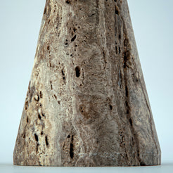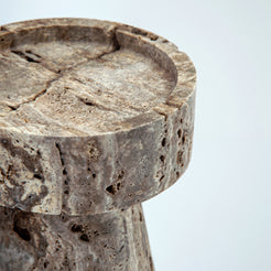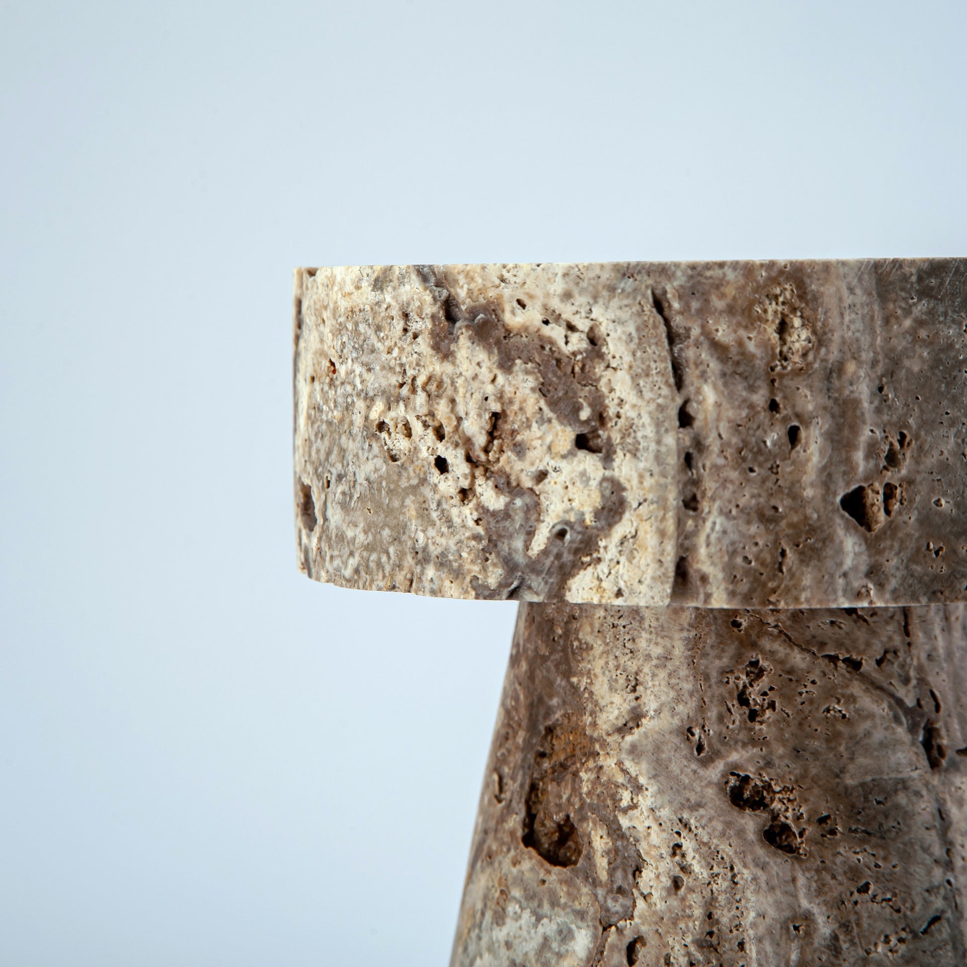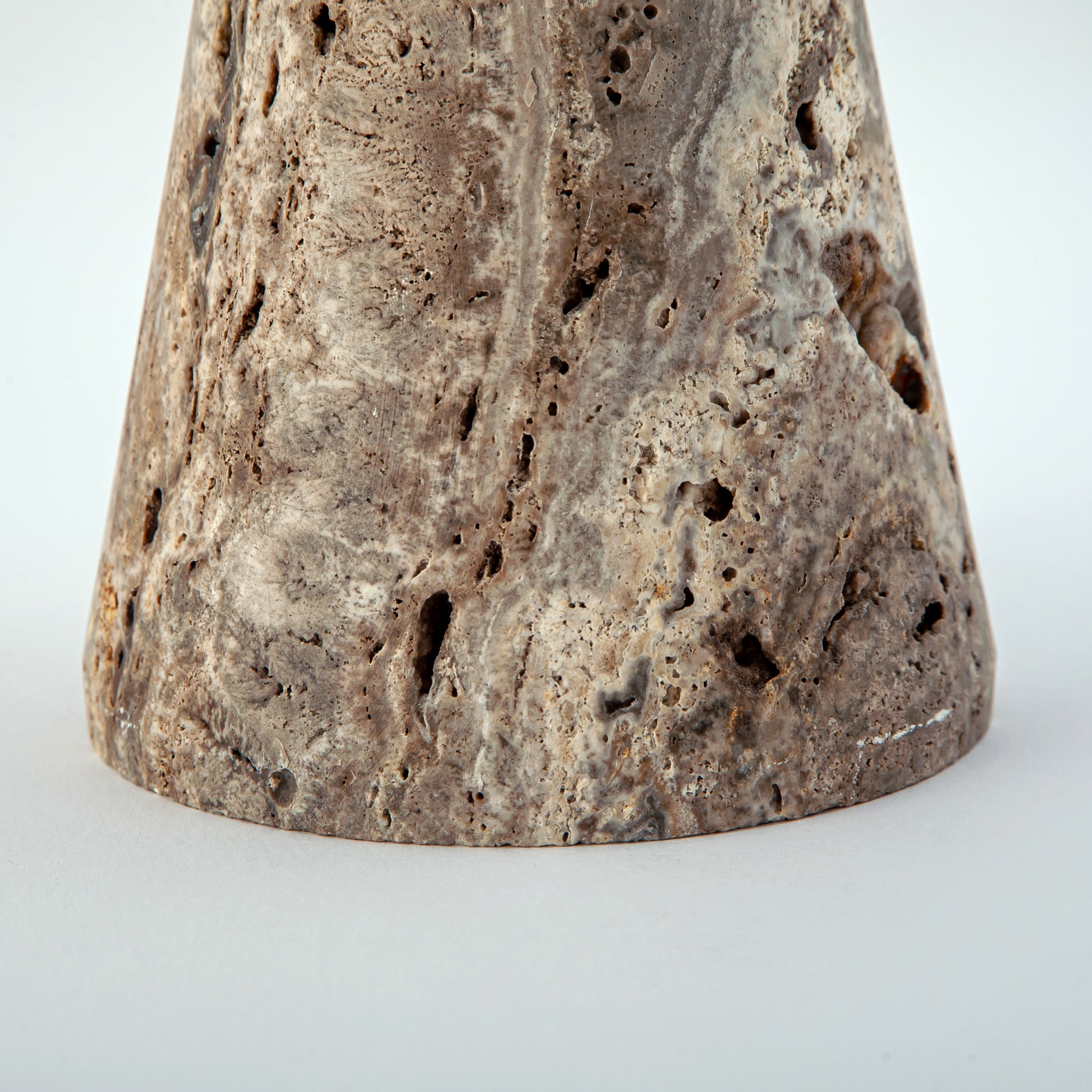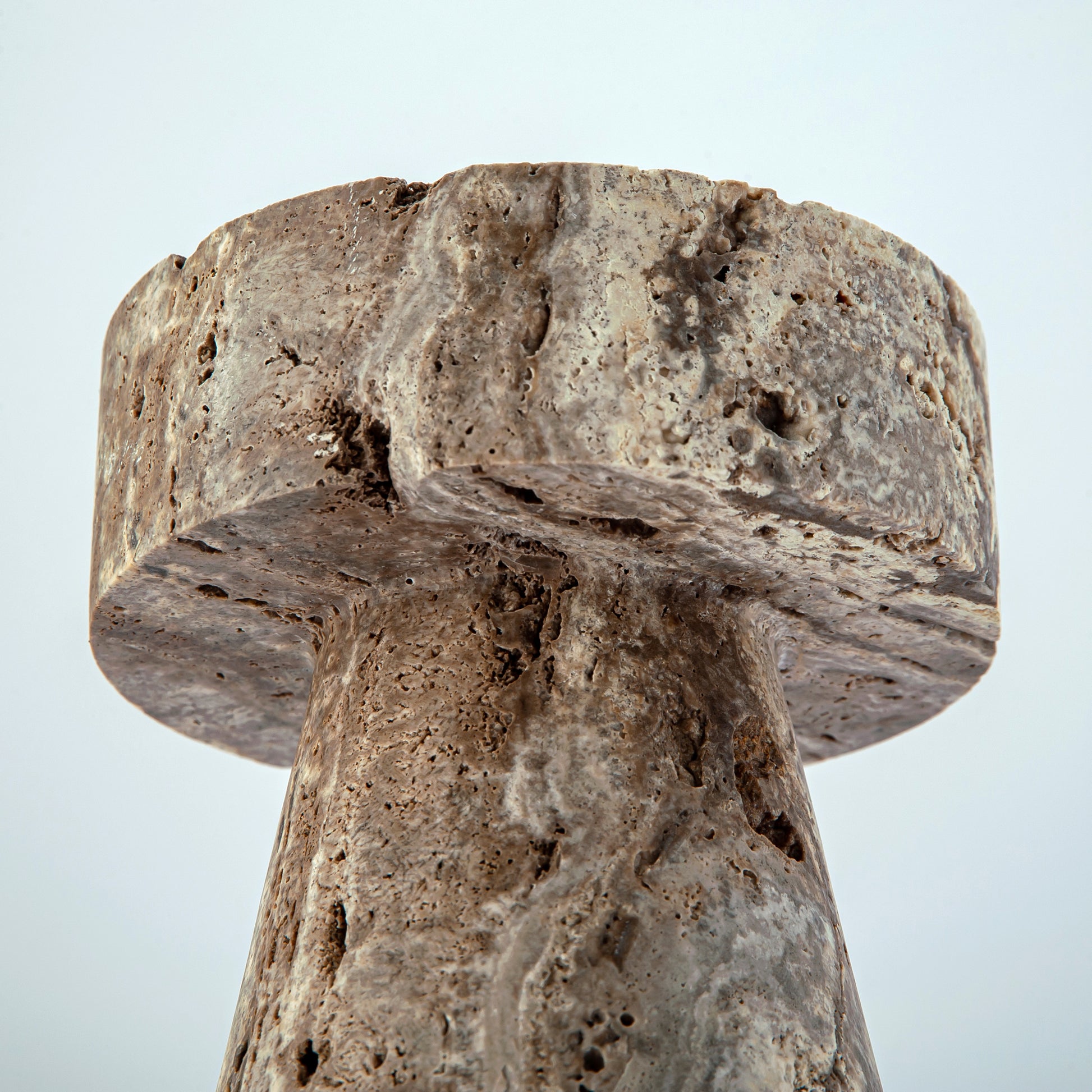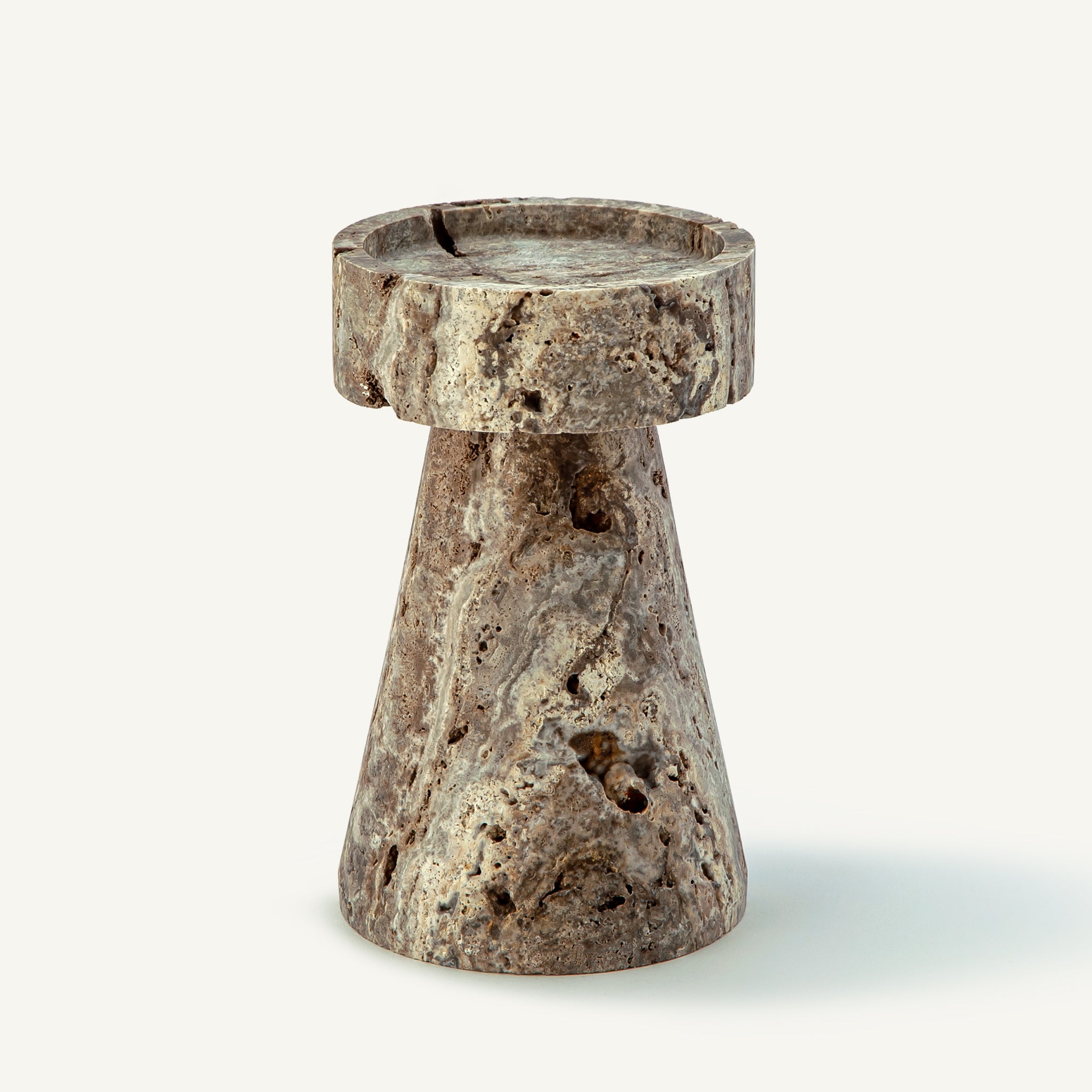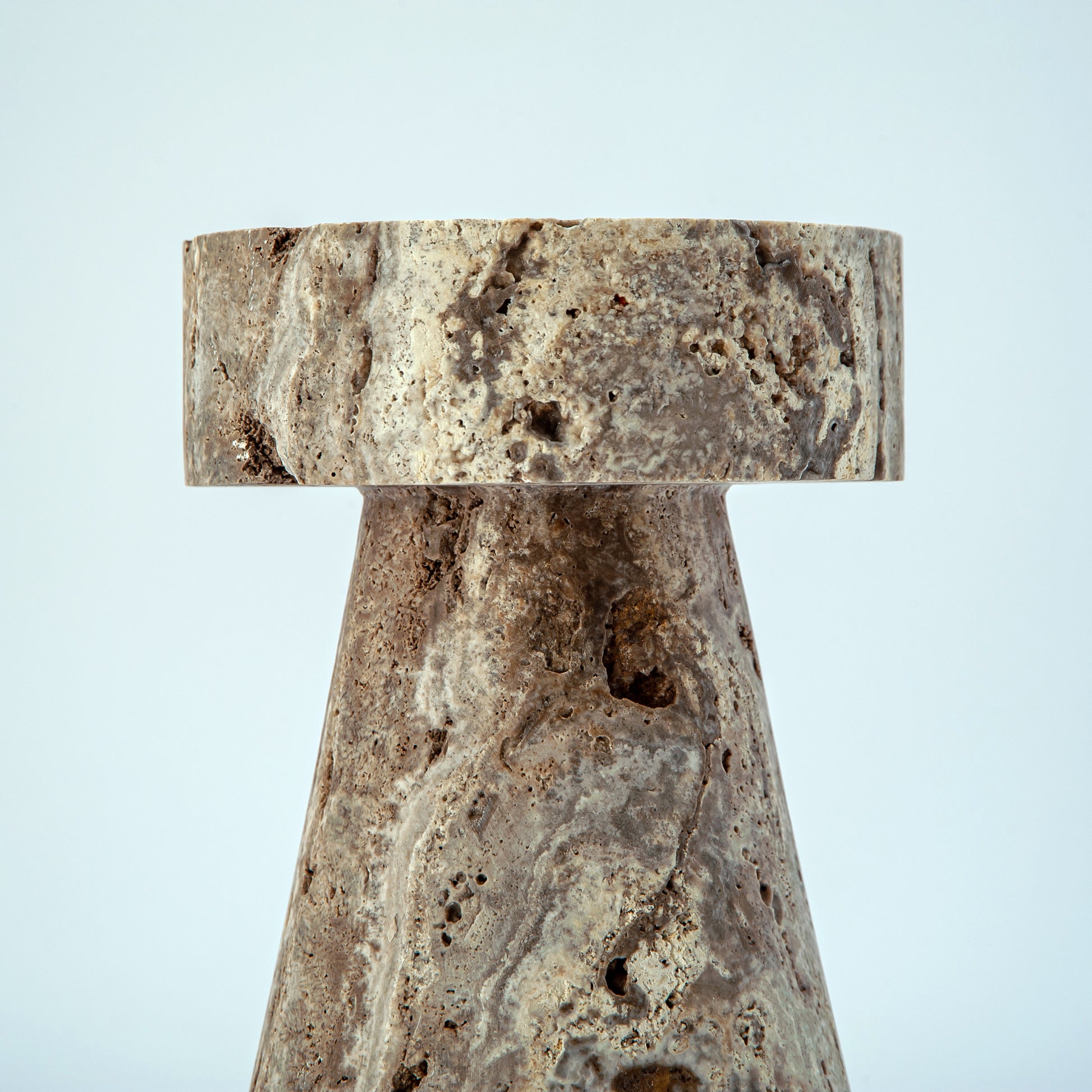 Der aus natürlichem Travertin gefertigte Rosavé Kerzenpodest verkörpert ruhige Stärke und skulpturale Schlichtheit. Seine architektonische Silhouette – getragen von einem konischen Sockel und einer markanten, abgerundeten Oberseite – schafft eine auffällige Balance zwischen Solidität und Weichheit.