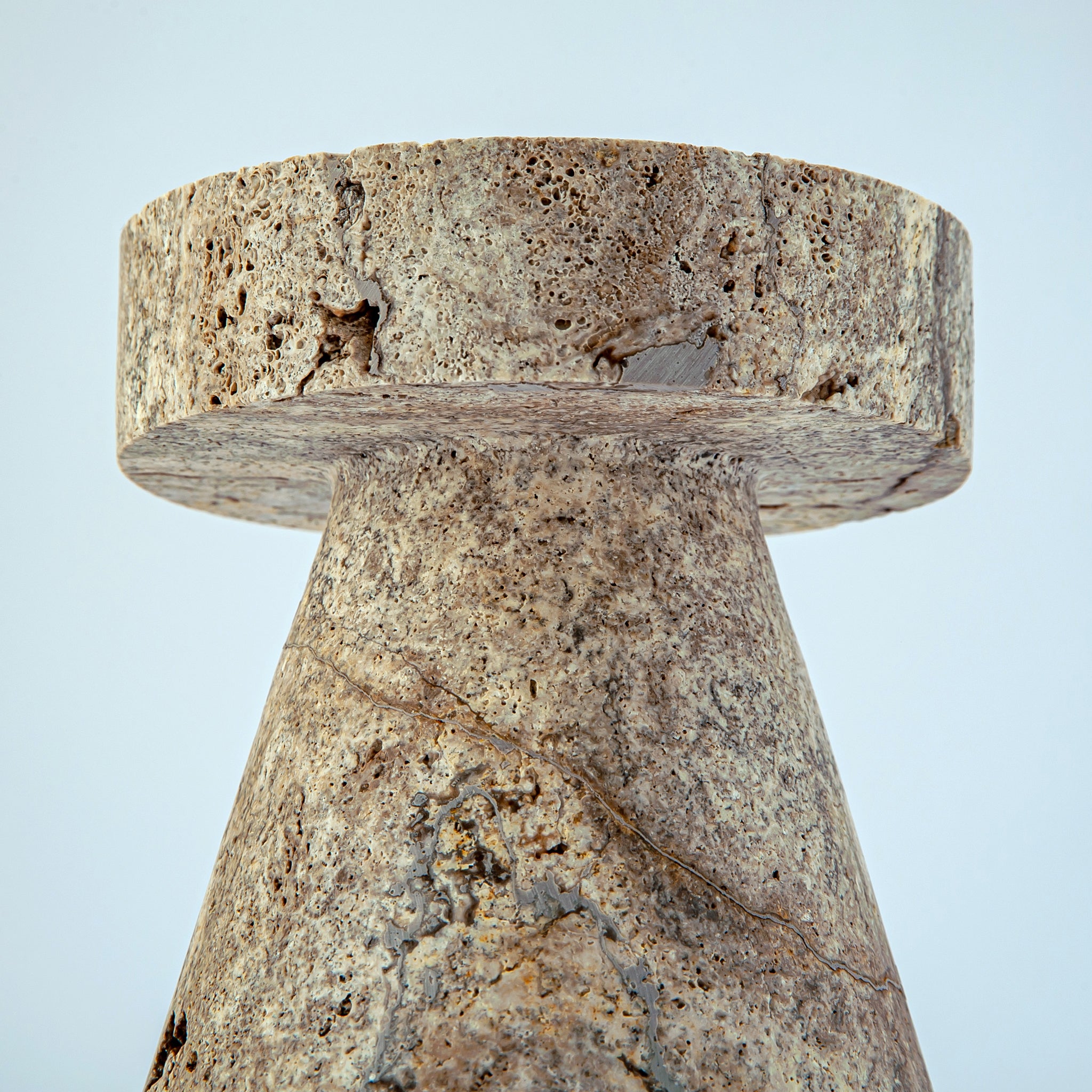 Der Rosavé Kerzenhalter verkörpert durch seine elementare Form und sein zeitloses Material stille Stärke. Aus massivem Travertin geformt, erhebt sich seine Silhouette in ausgewogener Balance, wobei sich ein breiter, bodennaher Sockel nach oben zu einer raffinierten Plattform verjüngt, die das Licht umschließt.