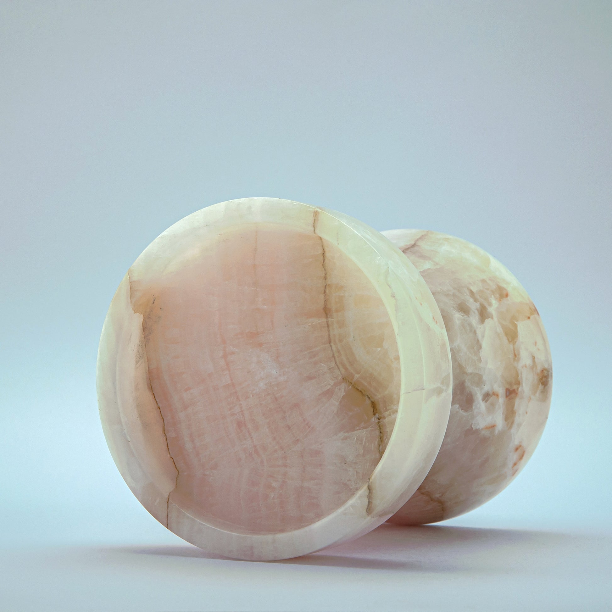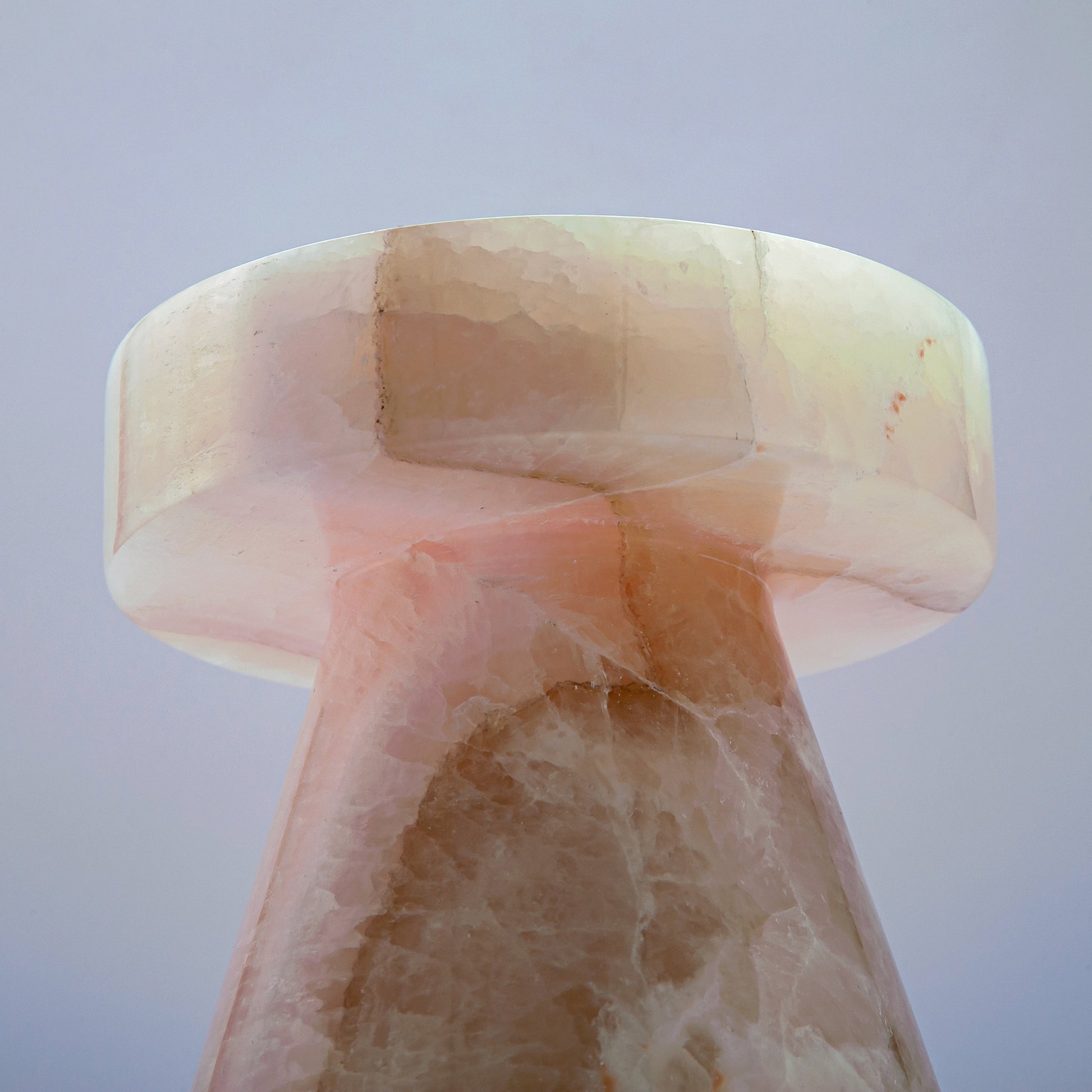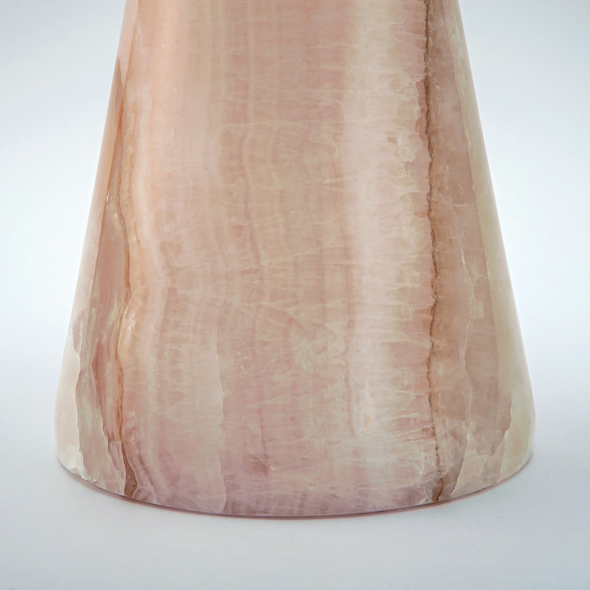 Der Rosavé zeichnet sich durch seine ausgewogenen Proportionen aus, mit einem sich verjüngenden Sockel, der eine leicht erhöhte Plattform trägt, und verbindet architektonische Stärke mit fließender Eleganz. Jedes Stück weist einzigartige Muster aus rosa, cremefarbenen und honigfarbenen Adern auf, ein natürliches Kunstwerk, das über Jahrtausende hinweg geformt wurde.