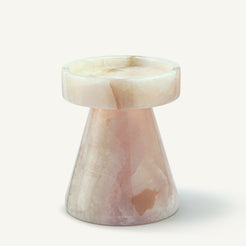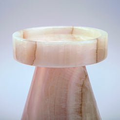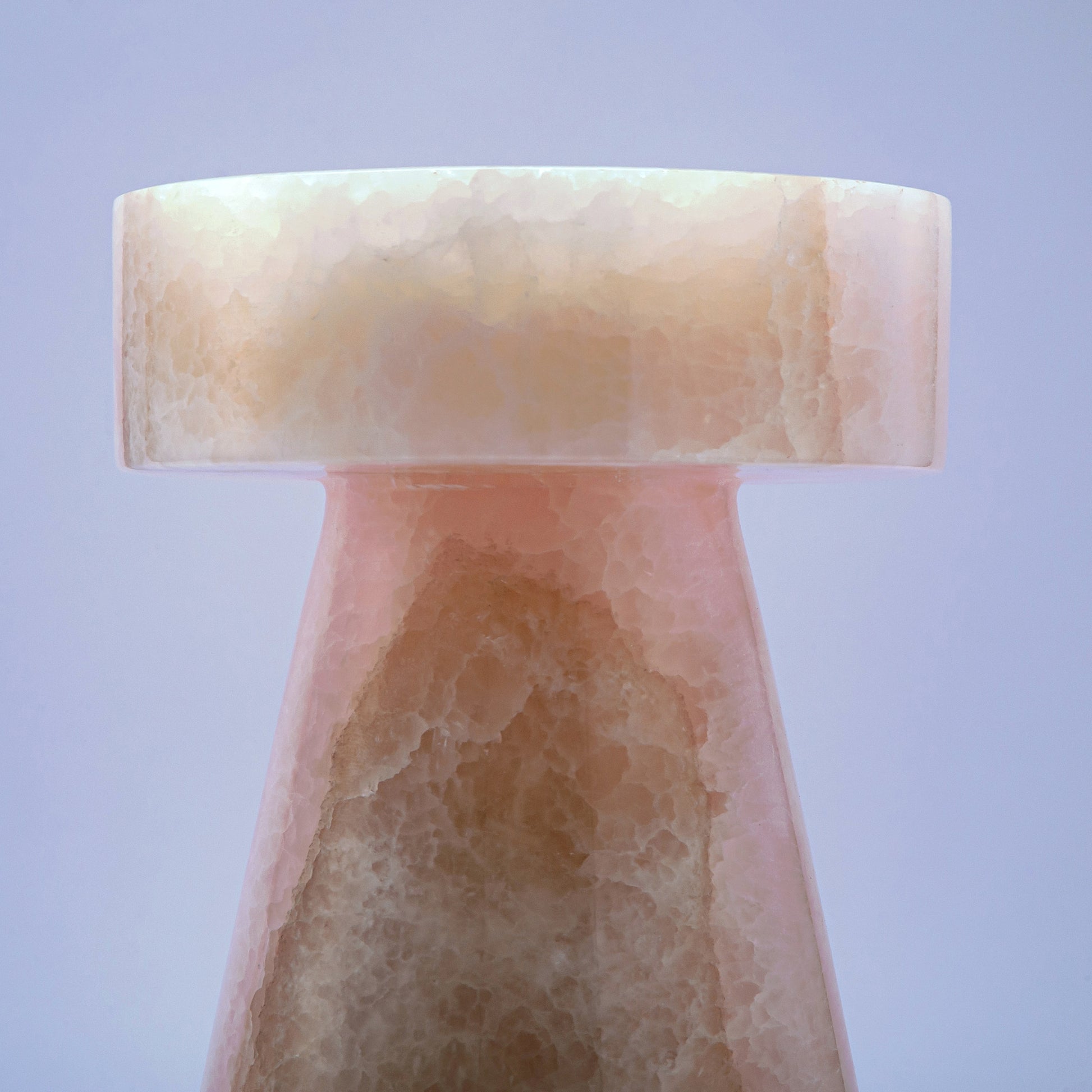 Der Rosavé Kerzenständer vermittelt durch seine skulpturale Form und den natürlichen Glanz des rosafarbenen Onyx ein Gefühl von ruhiger Raffinesse. Er ist aus einem einzigen Steinblock handgeschnitzt und fängt mit seiner sanften Transluzenz das Licht ein und streut es, wodurch ein warmer, stimmungsvoller Schein entsteht, der jedes Interieur aufwertet.