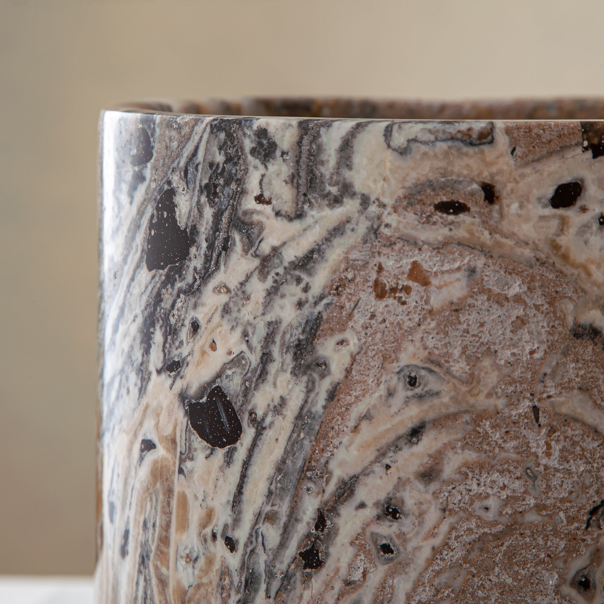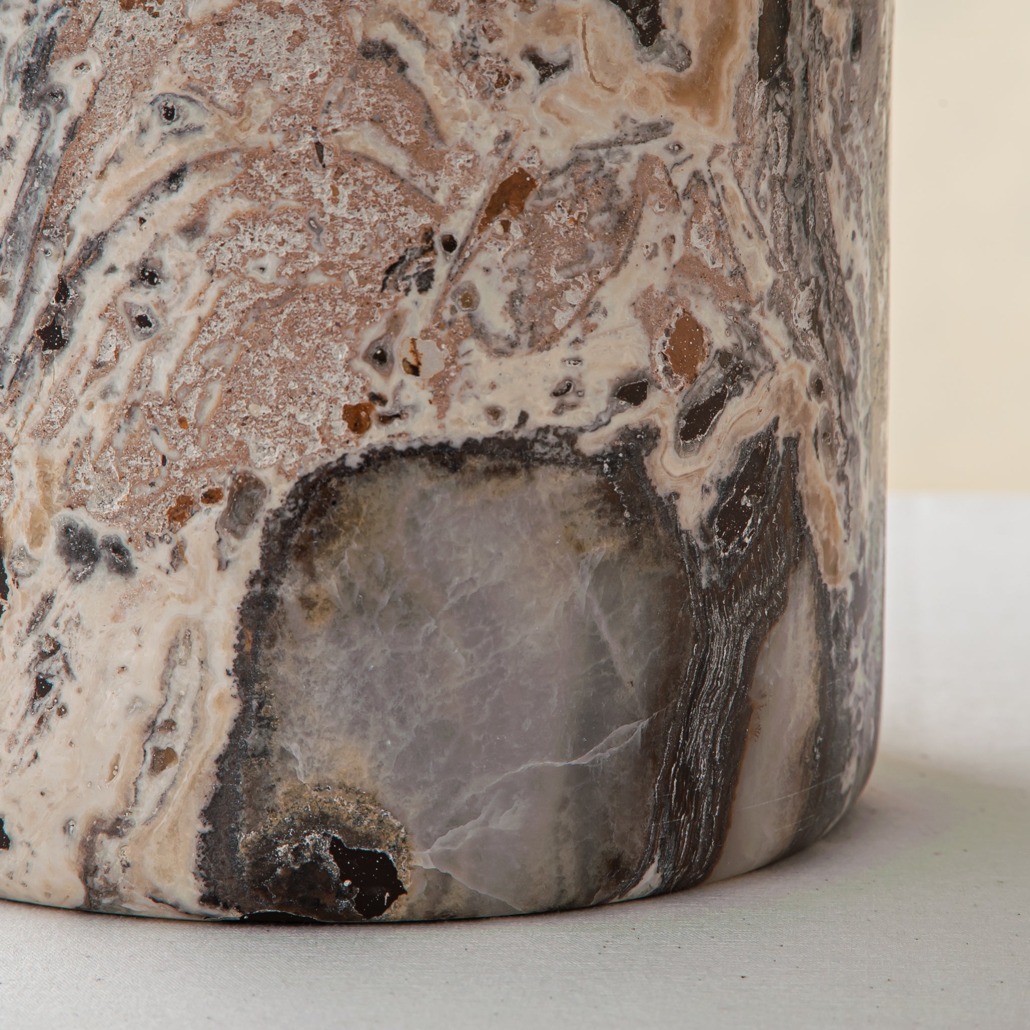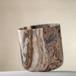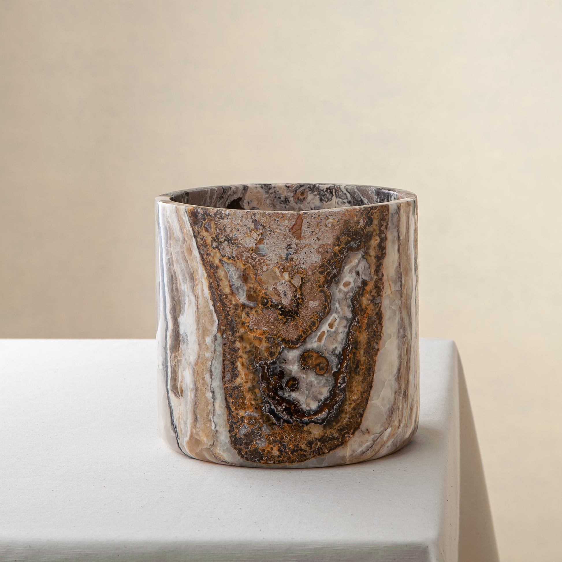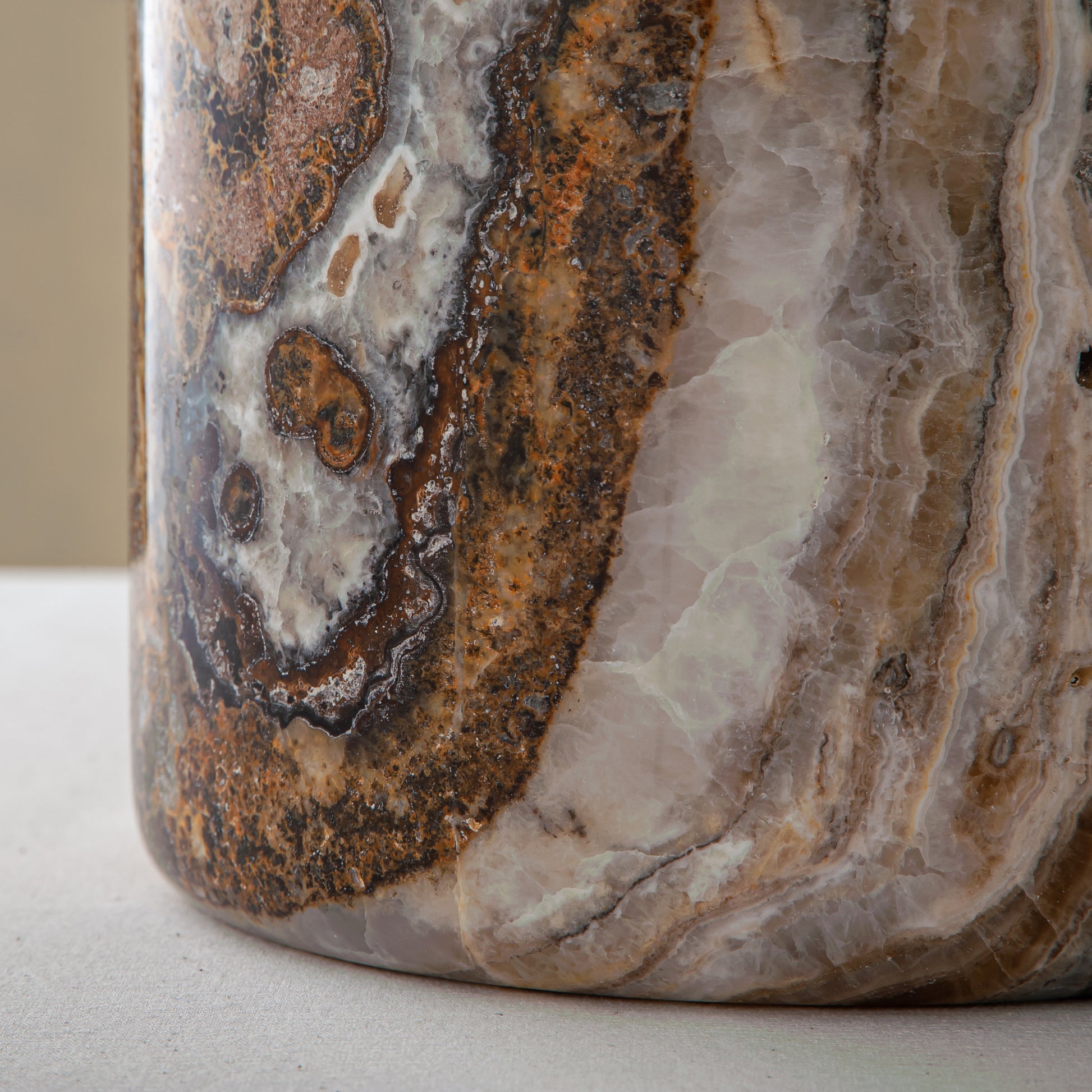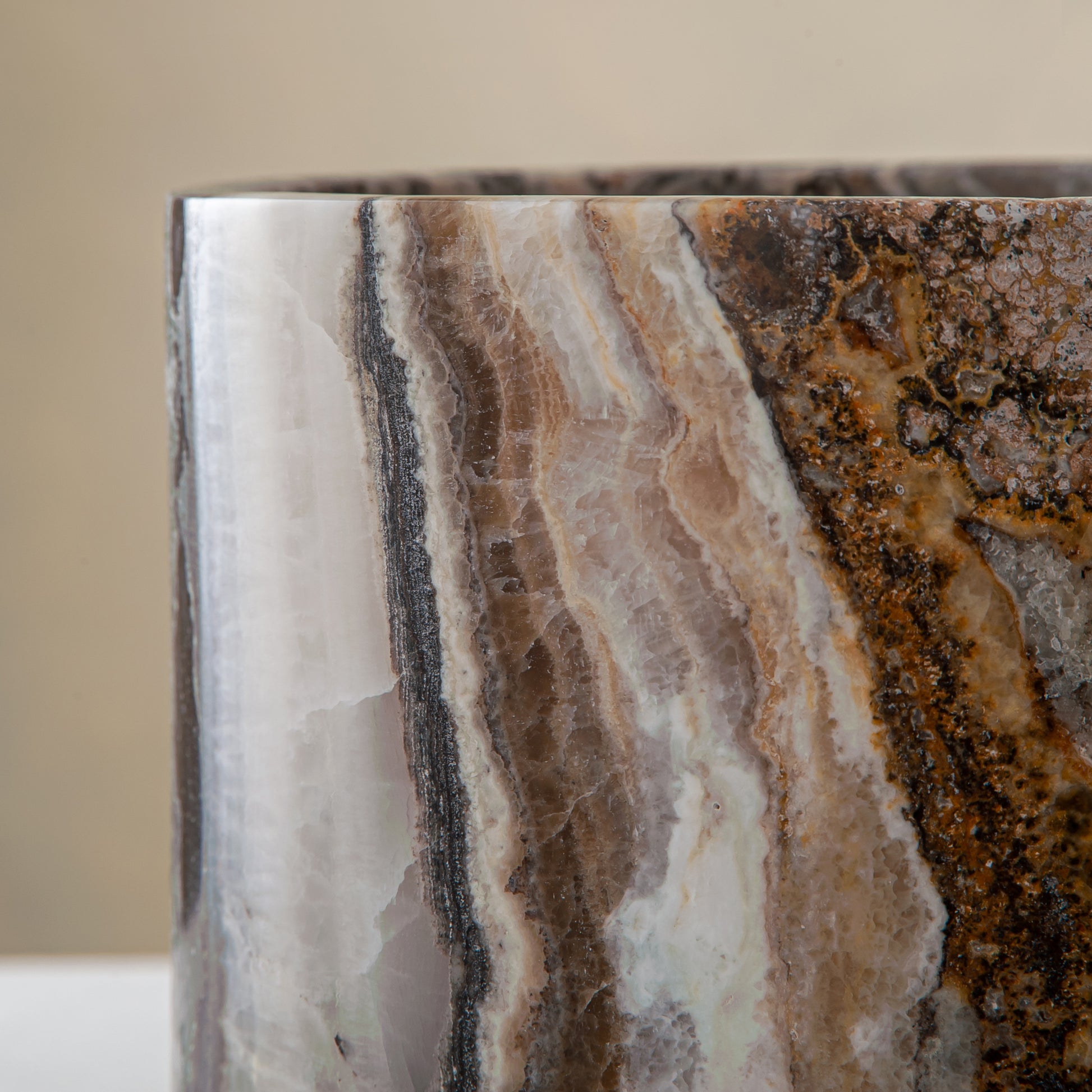 Der Varros-Flaschenkühler fängt die stille Kraft von natürlichem Onyx ein, einer Komposition aus tiefen Umbra-, sanften Grau- und Elfenbeintönen, die in einem organischen Rhythmus ineinanderfließen. Jedes Stück ist aus einem einzigen Steinblock gefertigt und offenbart komplexe Maserungen und Texturen, die von der Zeit geformt wurden.