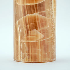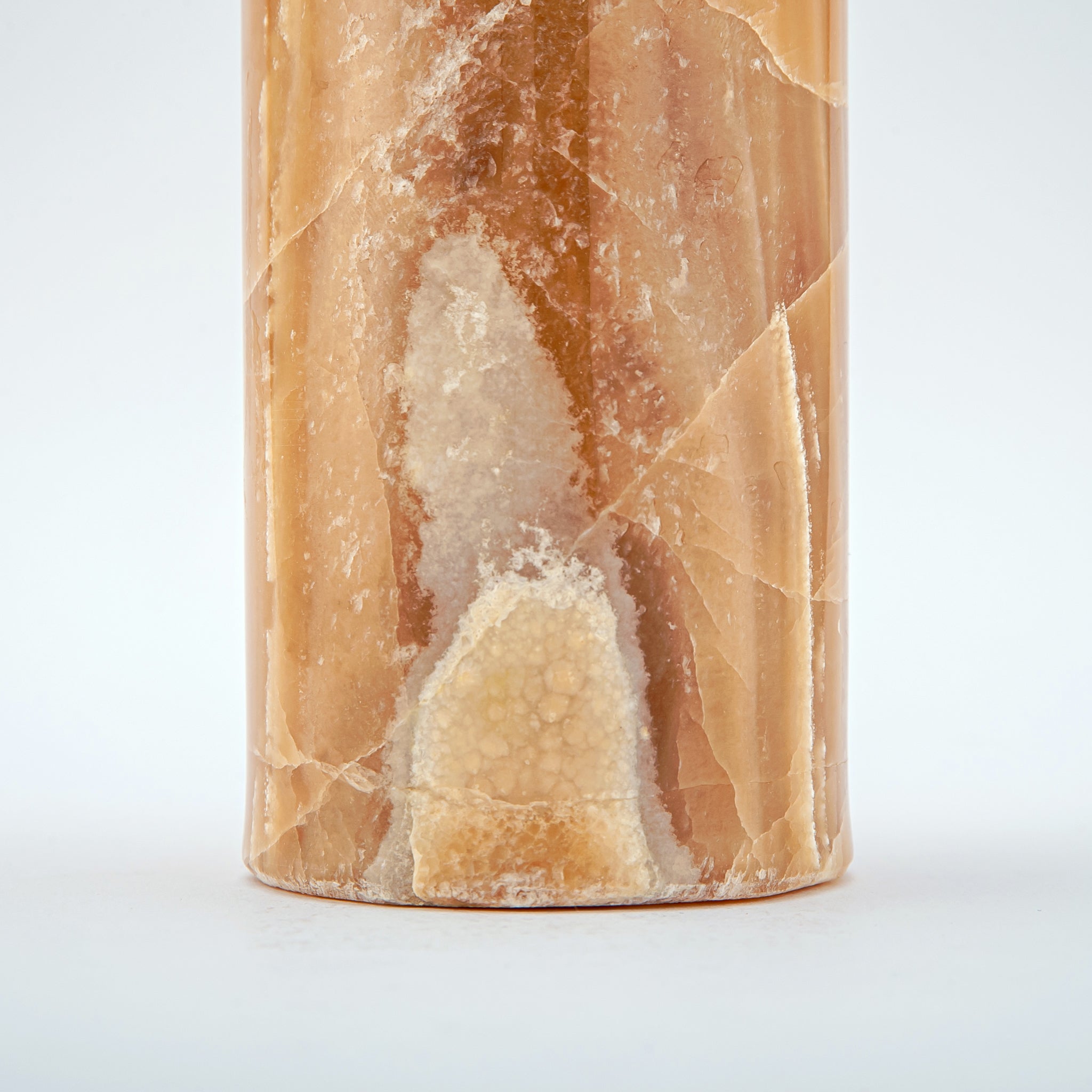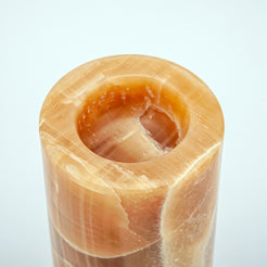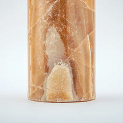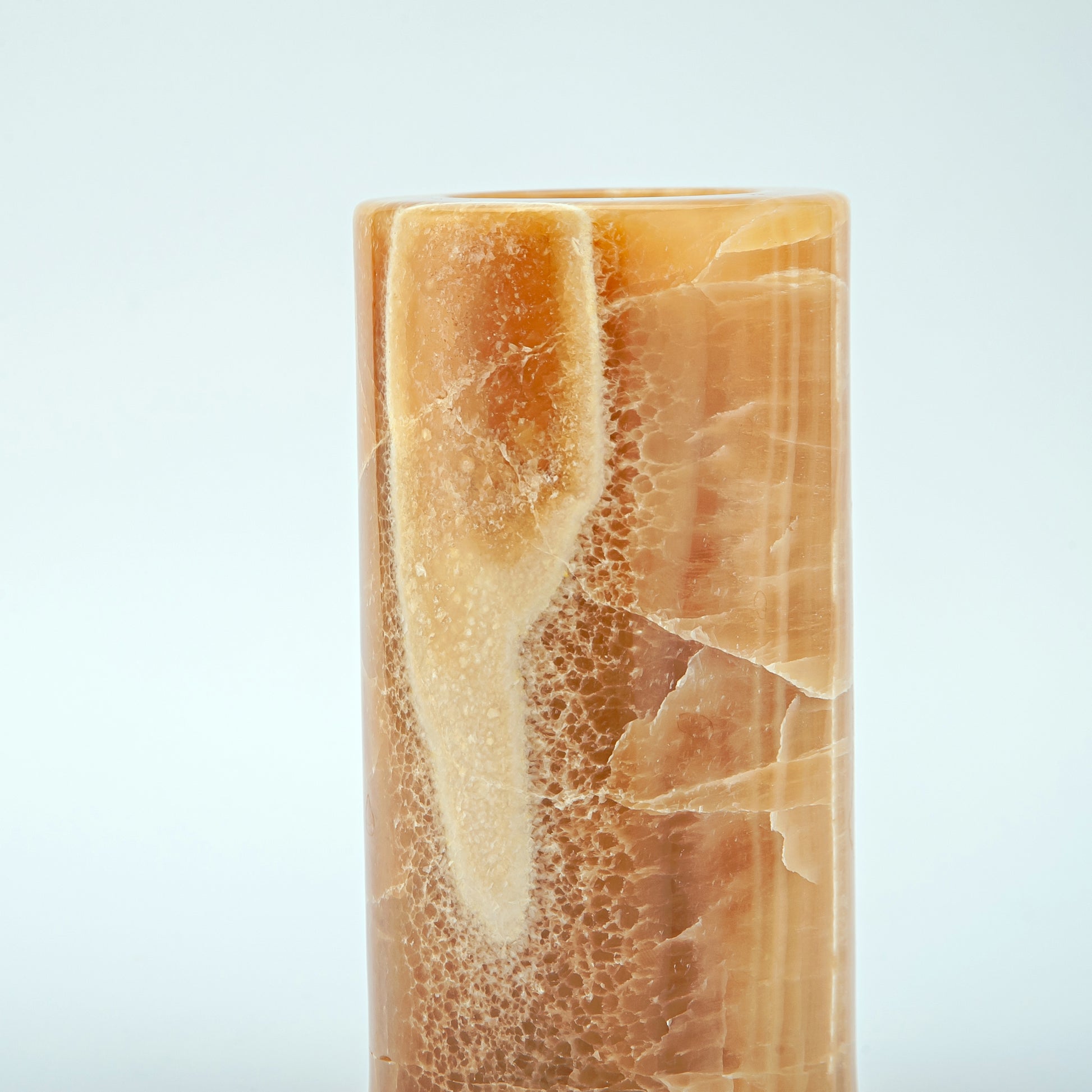 Der Kerzenhalter Vionis strahlt eine ruhige, goldene Wärme aus und ist ein skulpturales Gefäß, das aus natürlichem Onyx geschnitzt wurde. Seine zylindrische Form offenbart sanfte Bänder in Bernstein- und Cremetönen, wobei jede Schicht eine Spur der Zeit ist, die im Stein eingefangen wurde. Wenn er beleuchtet wird, leuchtet die Oberfläche von innen heraus und verwandelt feste Materie in lebendiges Licht.