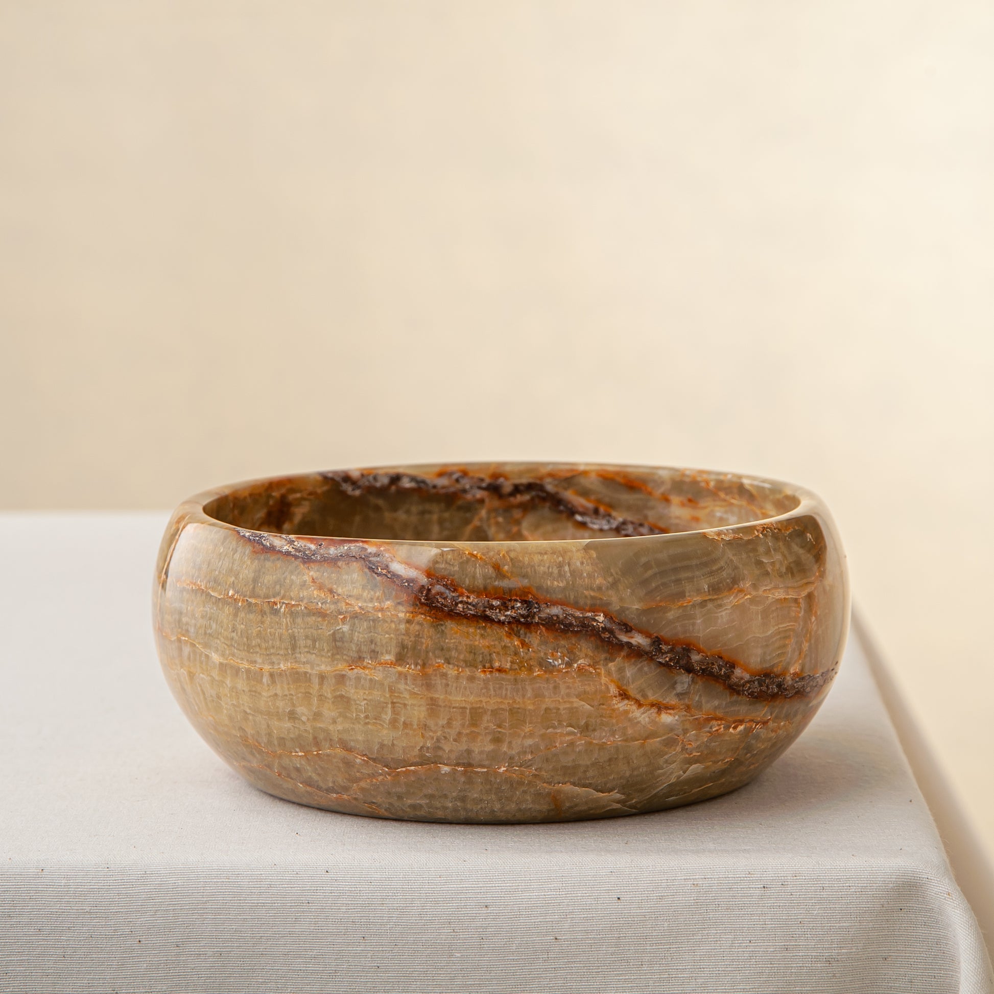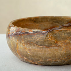 Its surface reveals layered beige, honey, and deep Green tones with natural veining that makes each piece unmistakably unique. Carefully shaped into a smooth, rounded form, the bowl highlights the stone’s organic character and timeless elegance.
