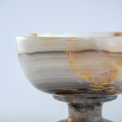 Aitheria Bowl is a one-of-a-kind piece carved from translucent onyx, blending soft milky whites with gentle gray layers and warm amber accents.