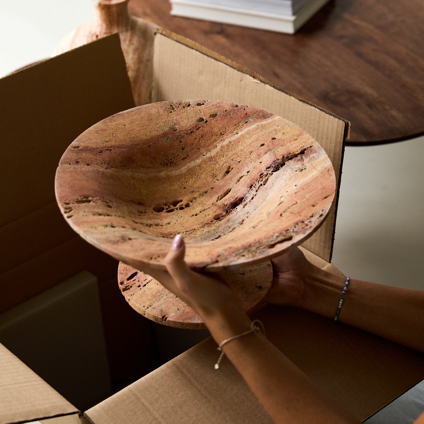 The Amara Travertine Bowl is a testament to the beauty of natural craftsmanship, sculpted from richly textured travertine. Its warm, earthy tones and intricate veining evoke the raw elegance of ancient Middle Eastern landscapes, while its graceful pedestal design adds a touch of refinement. The naturally porous surface, unique to travertine, enhances its organic charm, making each piece truly one of a kind.