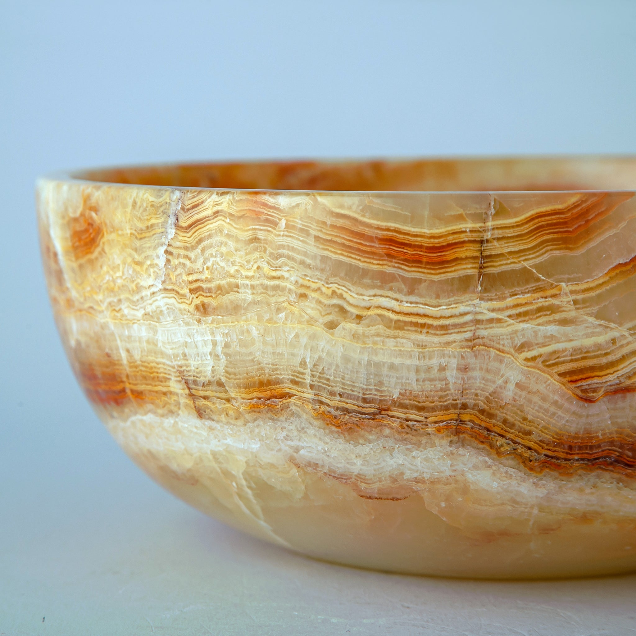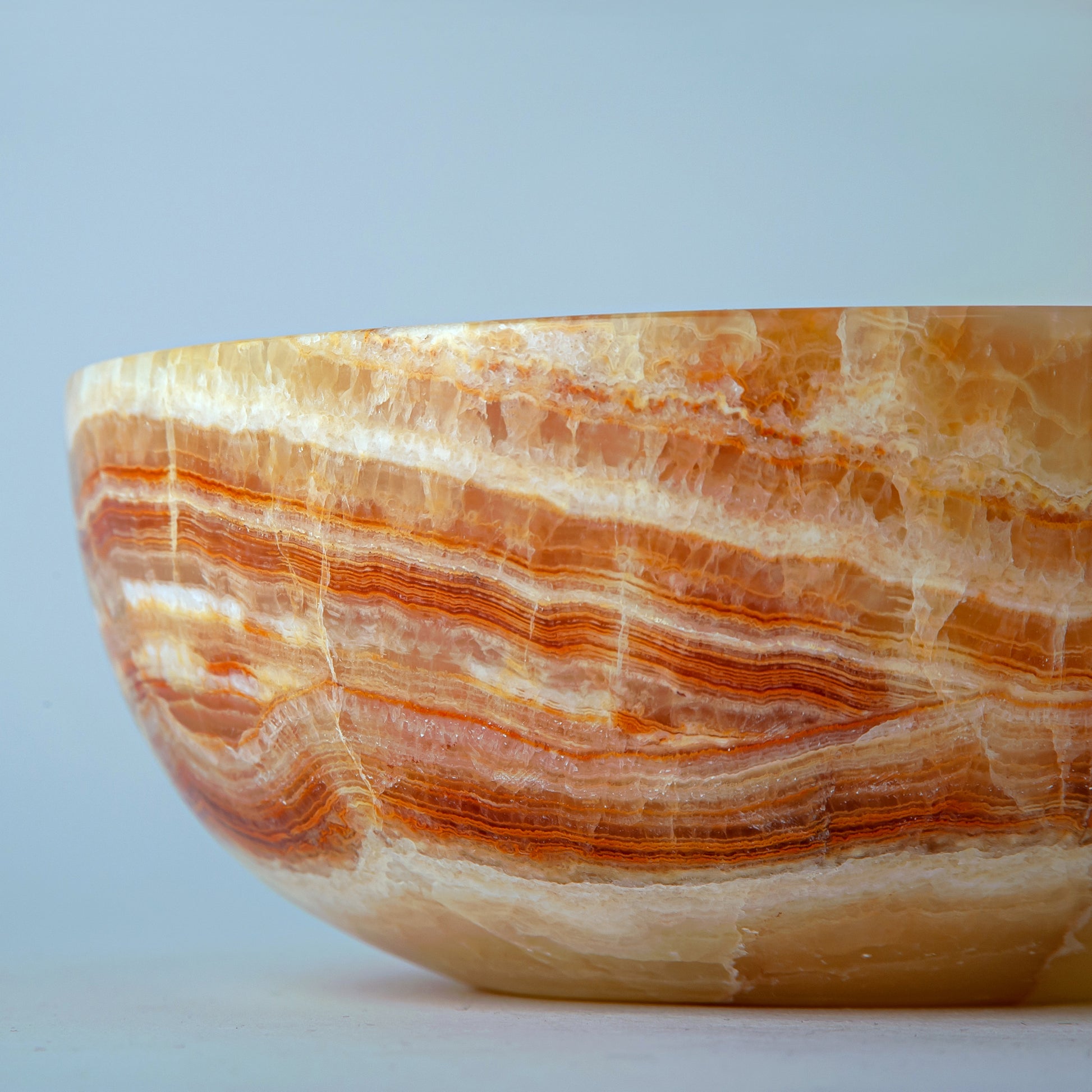 The Ambora bowl captures the quiet radiance of amber light preserved in stone. Carved from natural onyx, its layered tones of honey, gold, and soft alabaster create a sense of warmth and depth, where each vein tells a story of time and transformation.