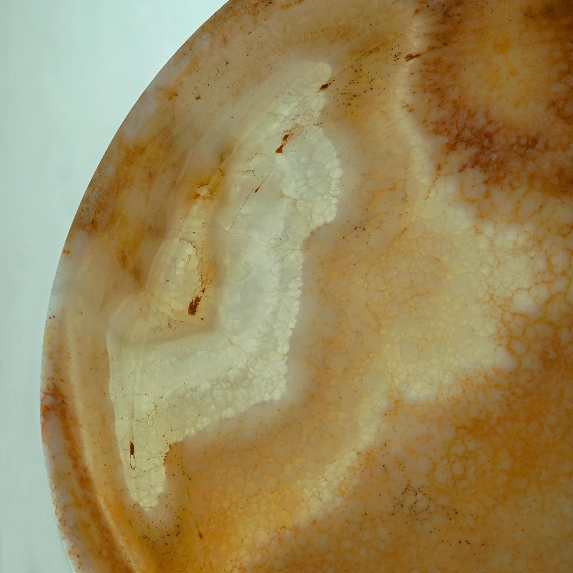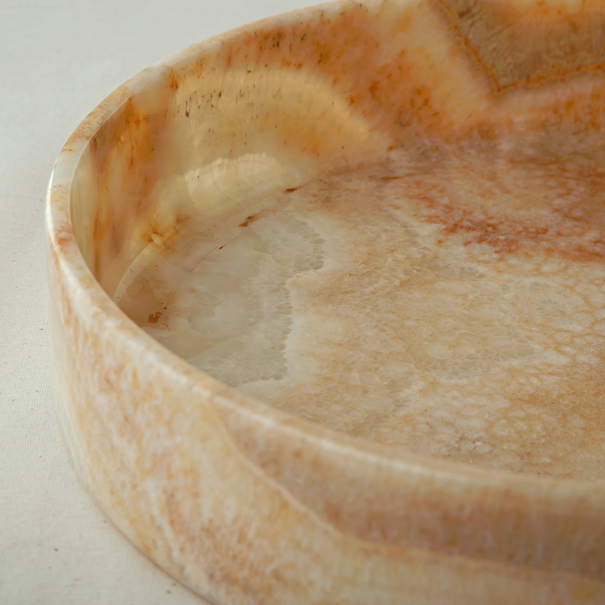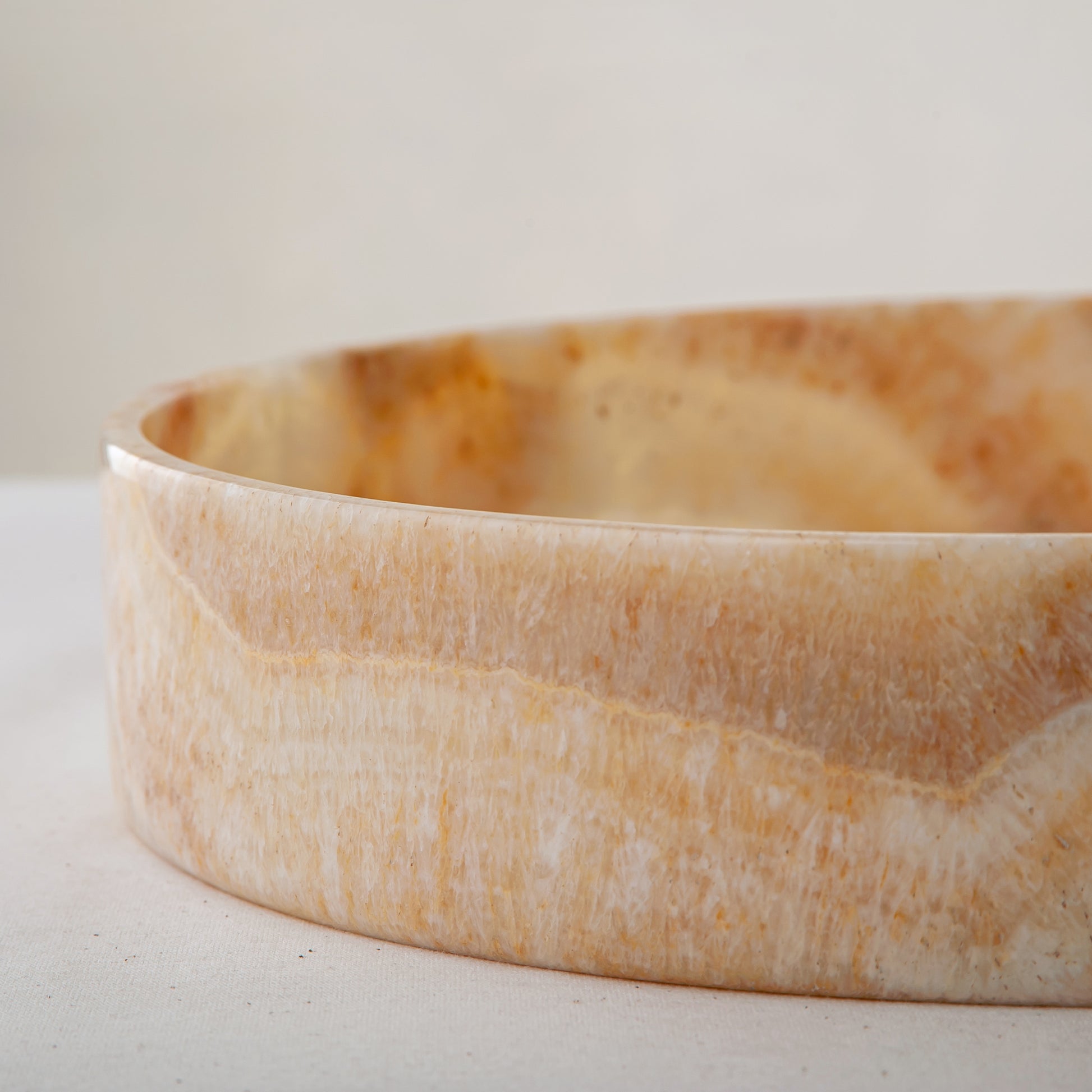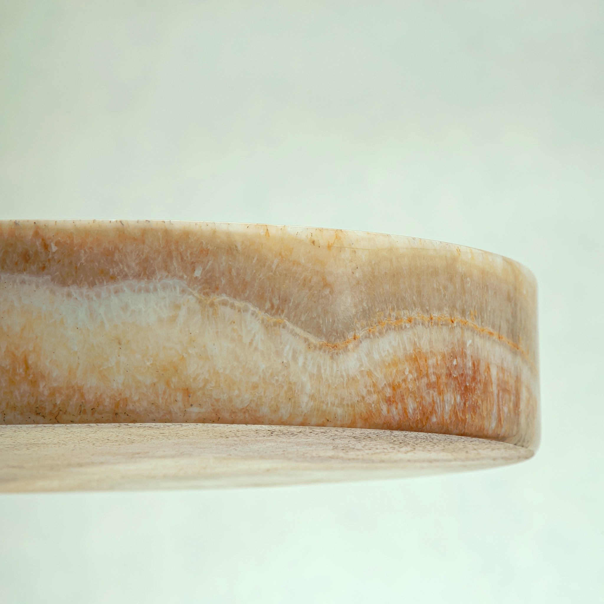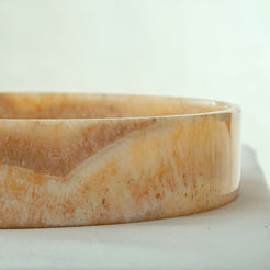The Ambriel Tray is carved from warm onyx, where soft amber hues and gentle mineral banding unfold across its surface like layered light. Low and circular in form, the tray balances clarity and presence, allowing the natural character of the stone to remain the focal point.