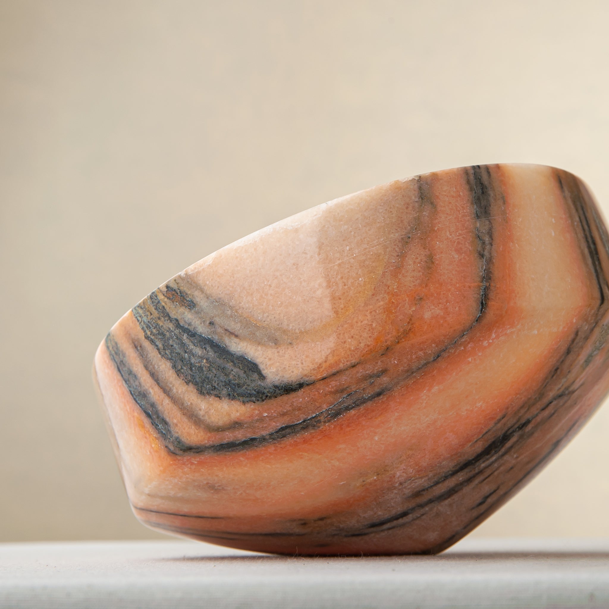 The Ambrin Bowl is a quiet study in warmth and balance, carved from natural onyx with softly flowing bands of amber, blush, and deep mineral grey. Its gently tilted form feels organic and effortless, as if shaped by motion rather than force, inviting light to glide across its surface.