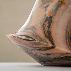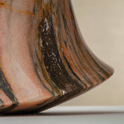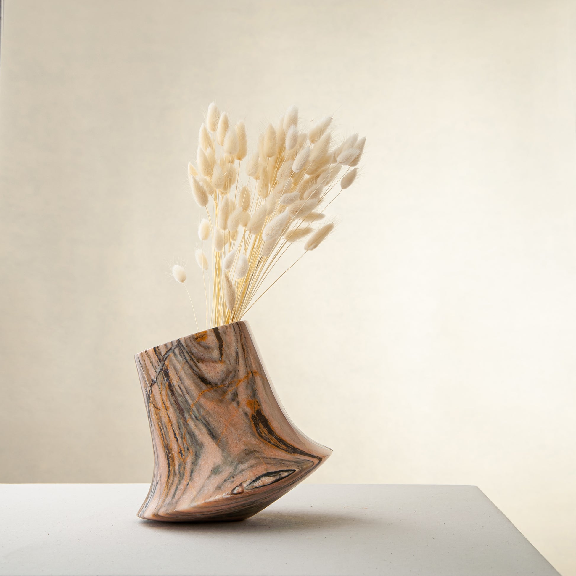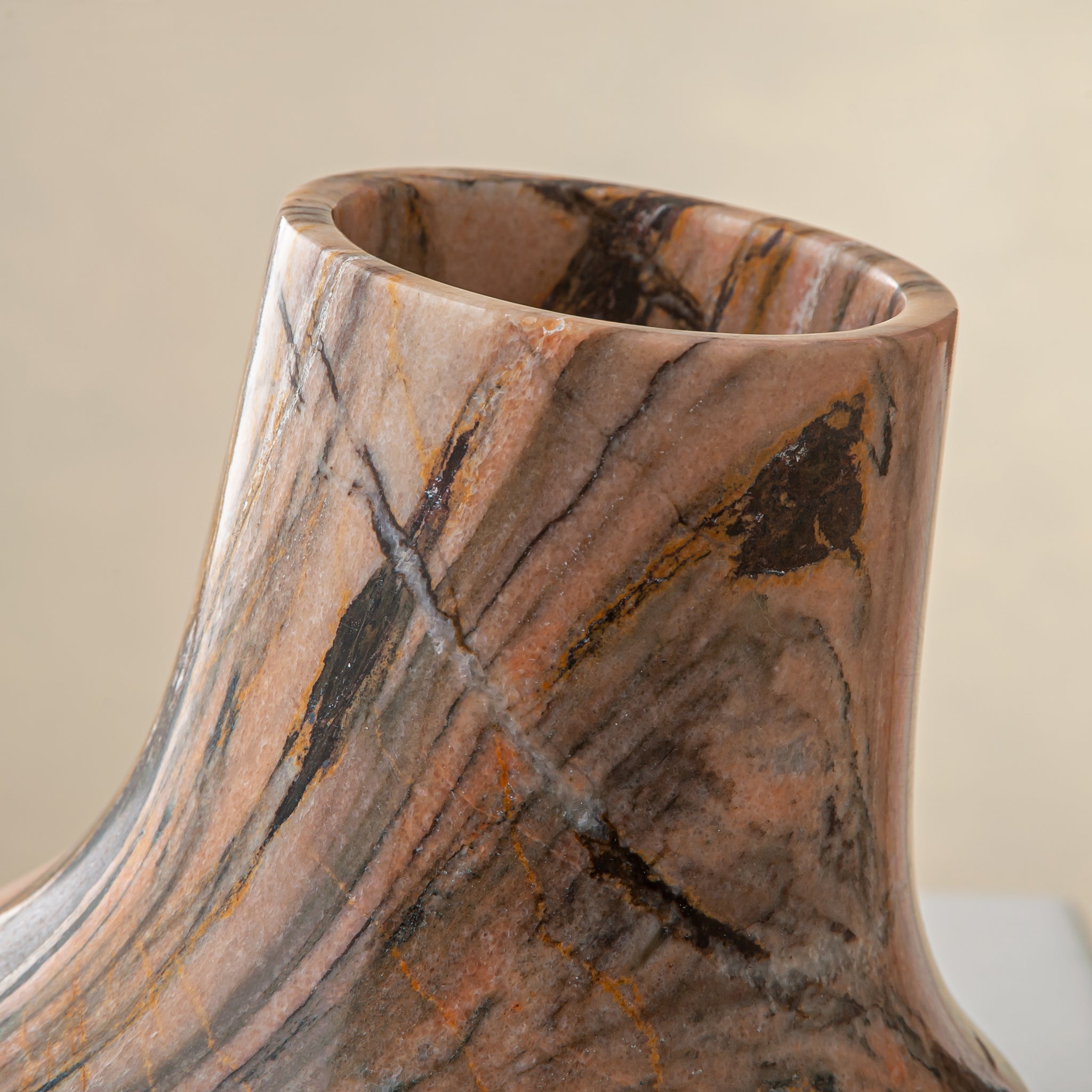The Ambrin Vase is a quiet study in warmth and balance, carved from natural marble with softly flowing bands of amber, blush, and deep mineral grey. Its gently tilted form feels organic and effortless, as if shaped by motion rather than force, allowing light to move fluidly across its surface.