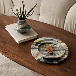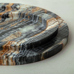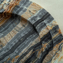 The Arctelle Tray is a captivating study in natural geometry, carved from richly banded onyx whose contrasting layers of charcoal, amber, and ivory reveal the slow artistry of the earth. Its stepped, circular form creates a sculptural landscape, both architectural and organic, where shadows and highlights move rhythmically across the stone’s surface.