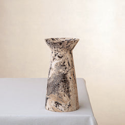 The Argentis Vase is carved from silver travertine, a stone known for its cool grey tones and expressive mineral texture. Natural markings and subtle contrasts run through the surface, giving the vase a calm yet distinctive presence that feels both architectural and organic.