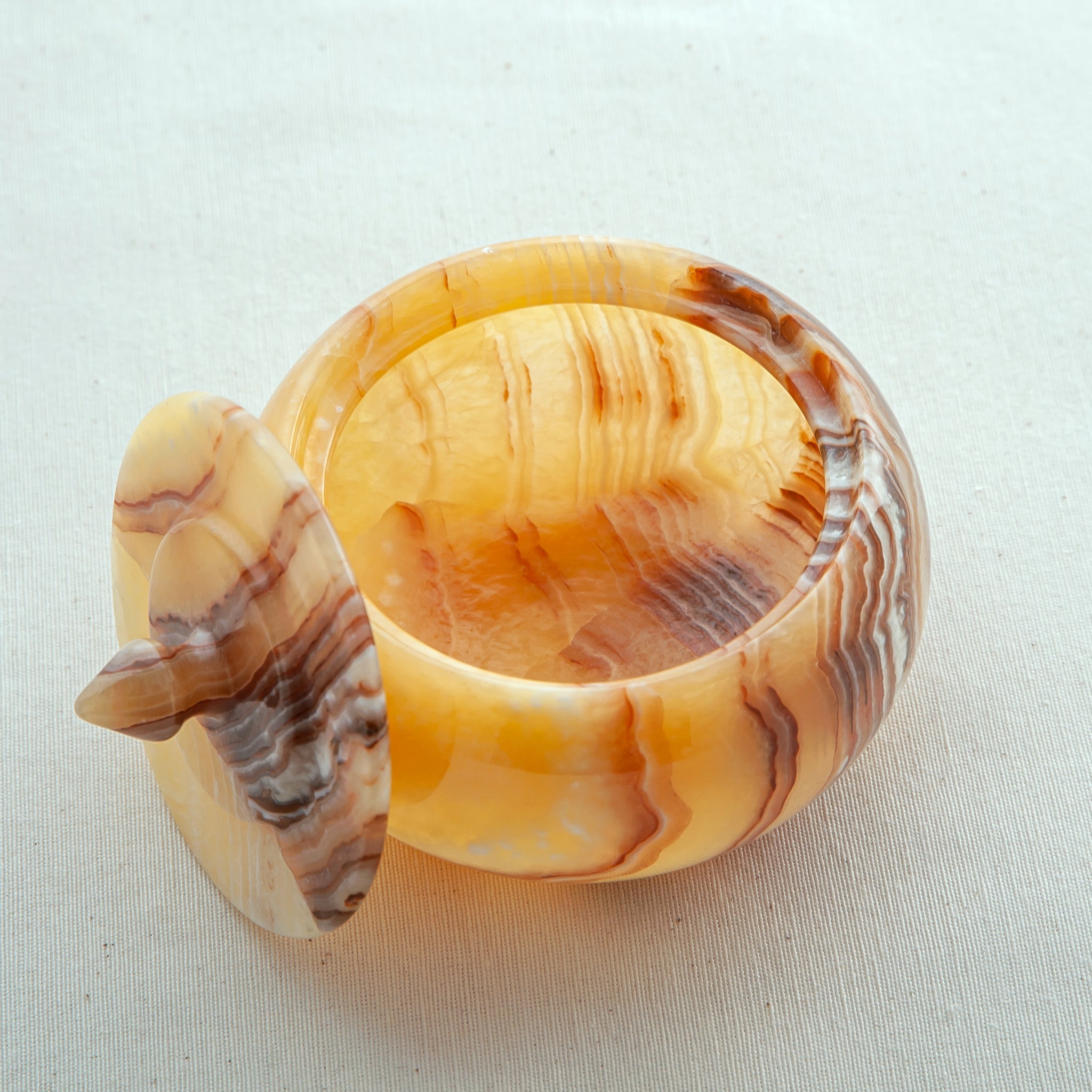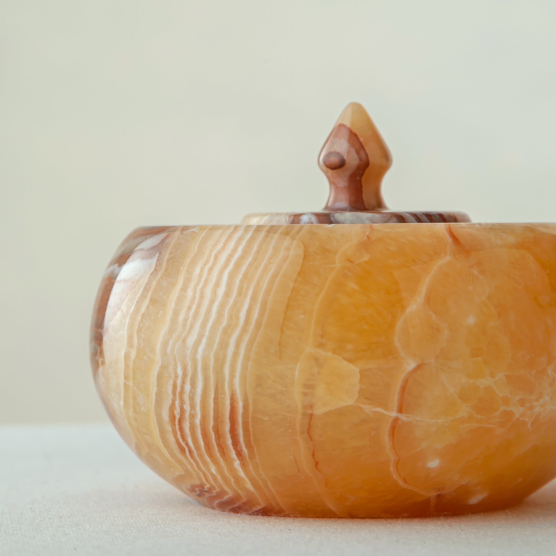 Shaped from a single block of exceptionally rare orange onyx, the Arvelon Jar radiates warmth, depth, and natural artistry. Its rounded silhouette highlights the stone’s remarkable banding — rhythmic waves of amber, terracotta, and ivory that tell the geological story of millions of years.