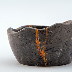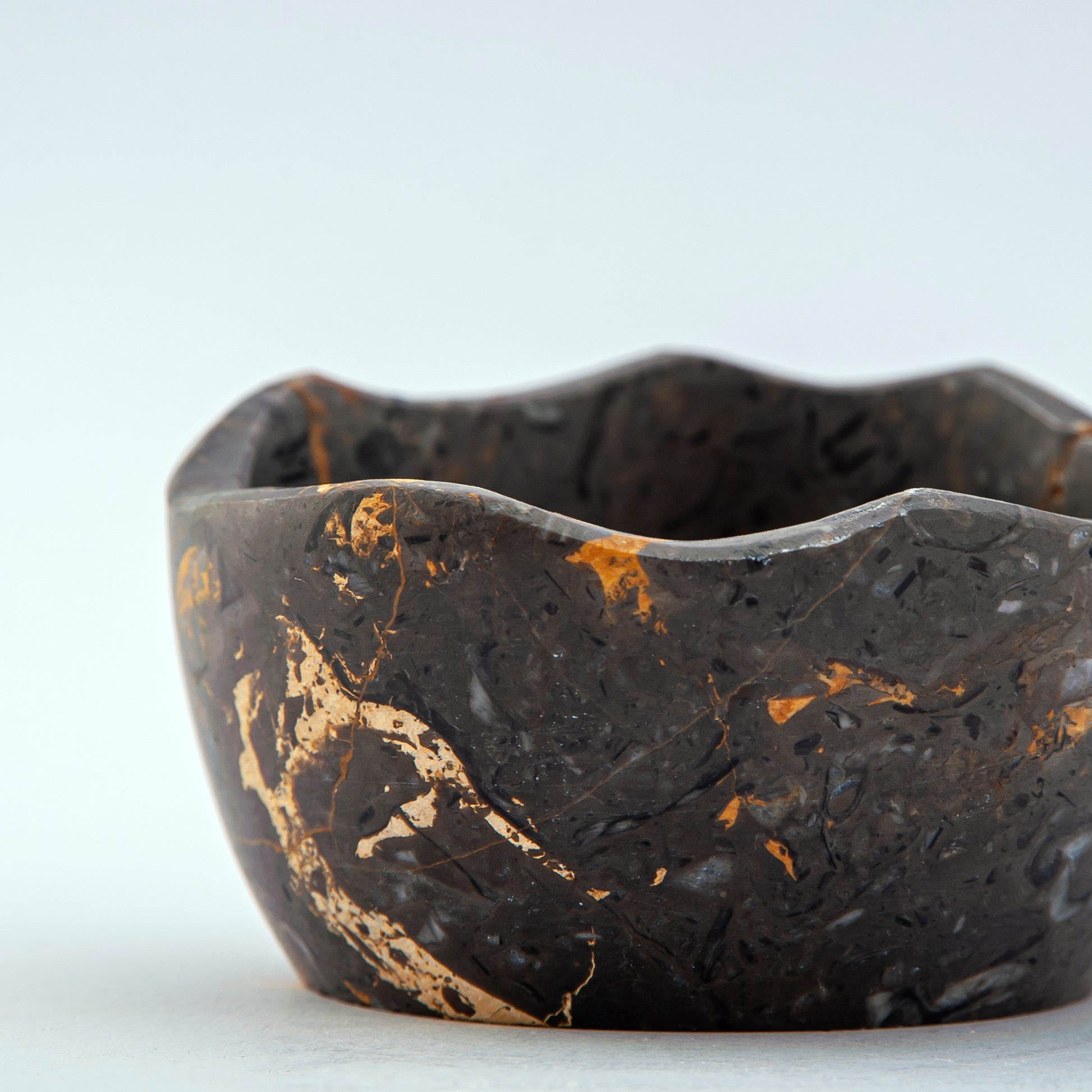 Astrapé Bowl is a one-of-a-kind piece carved from deep black marble, cut through with striking golden and amber veining that flashes like lightning across the surface.