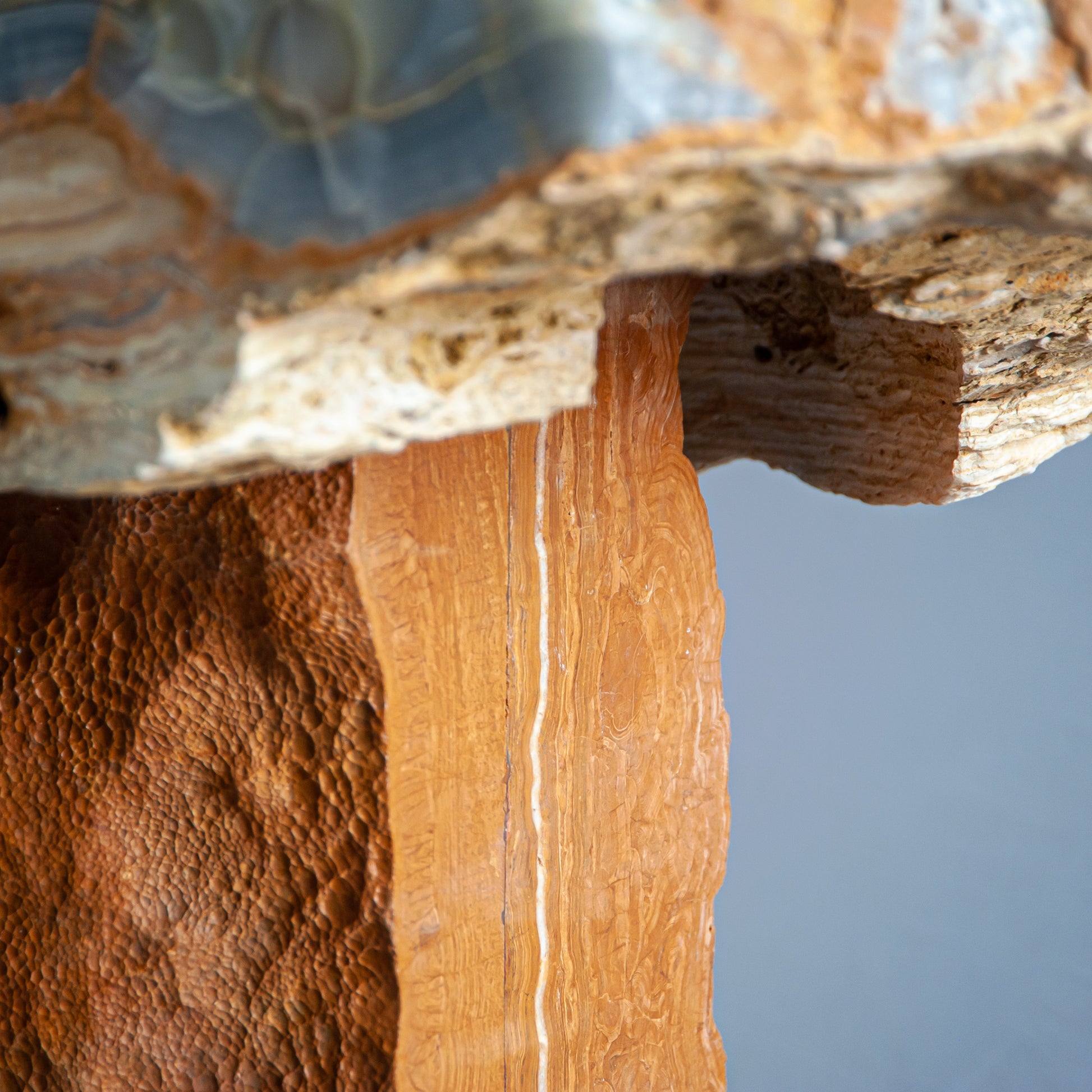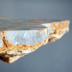The table’s monolithic top rests on a hand-shaped onyx base, where the naturally textured surface meets subtle artisan refinement. This contrast between wild geology and sculptural intention transforms Aurecrust into a functional artwork. Its irregular silhouette, shimmering translucency, and naturally carved edges make it a commanding centrepiece in any space.
