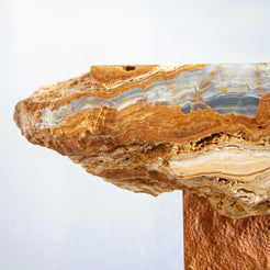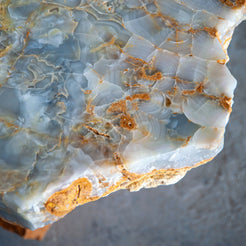 The Aurecrust Side Table is a true geological masterpiece — a one-of-one creation that cannot be replicated, even by nature itself. Sculpted from exceptionally rare rough onyx, its form preserves the raw, untouched surface of the stone, revealing dramatic layers of amber, honey, clouded blue, and crystalline white. Every ridge, fracture, and mineral transition tells the story of millions of years beneath the earth’s crust.