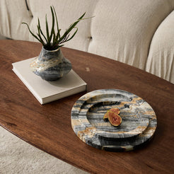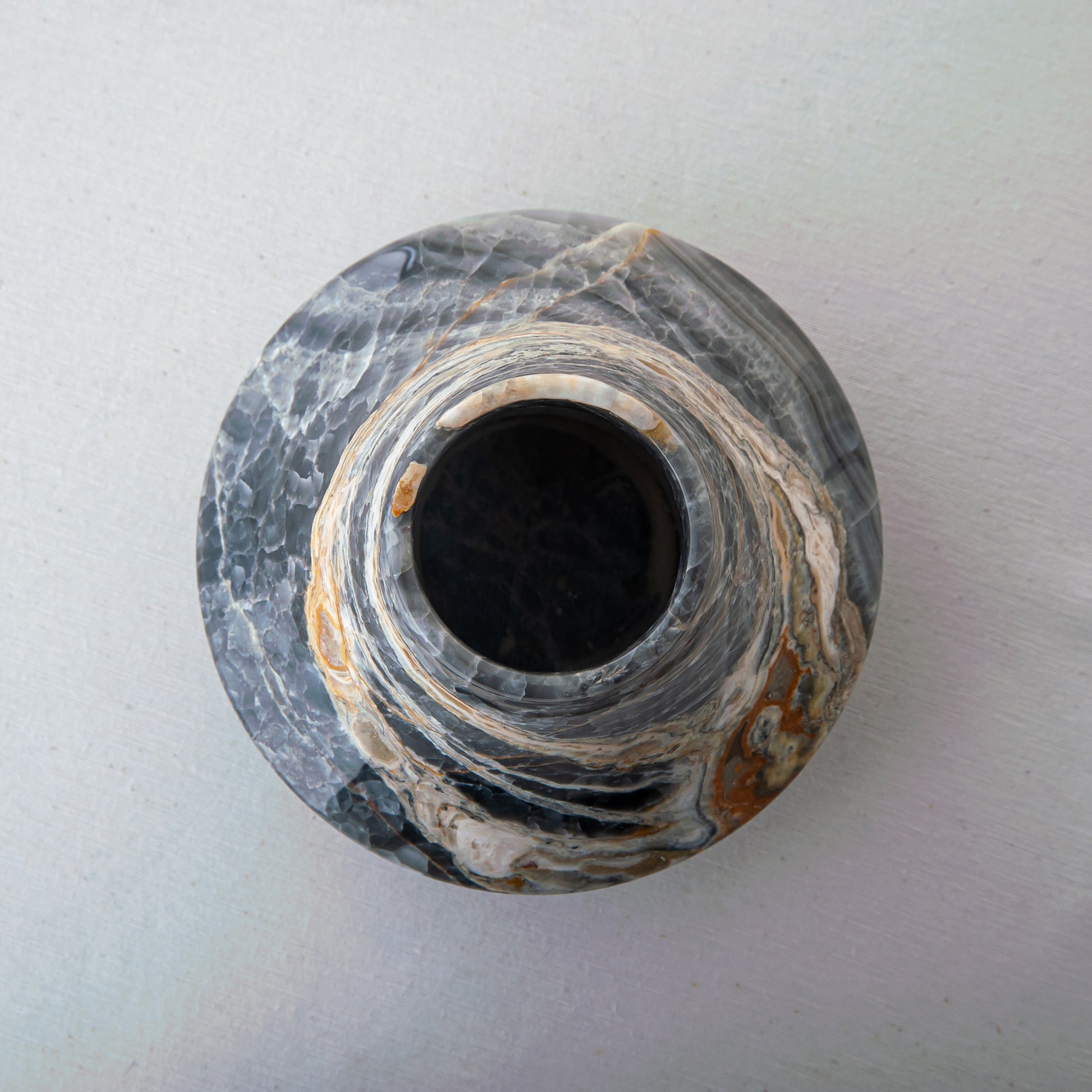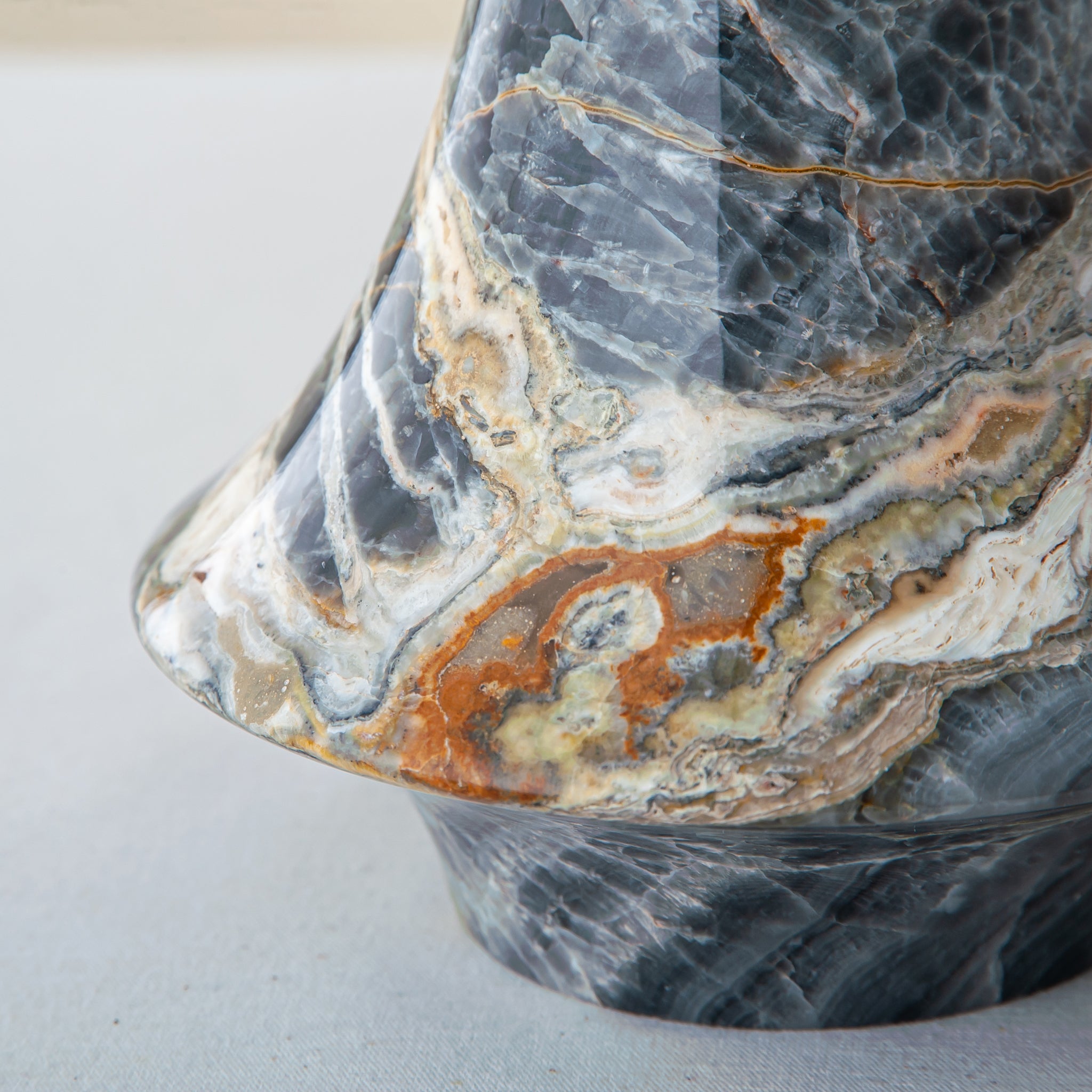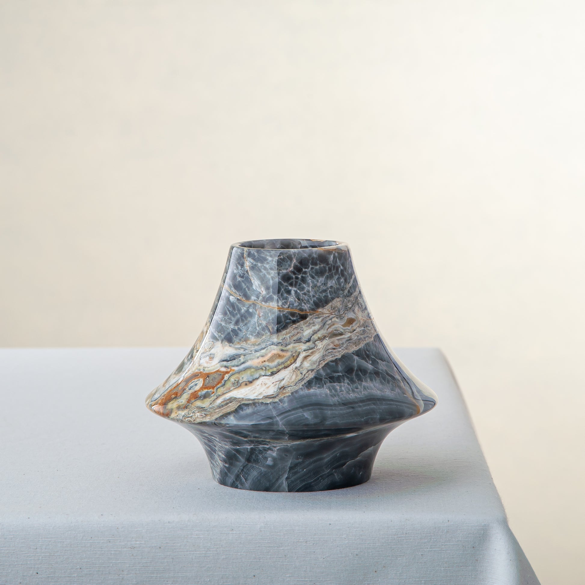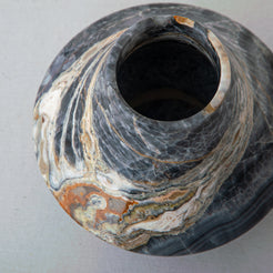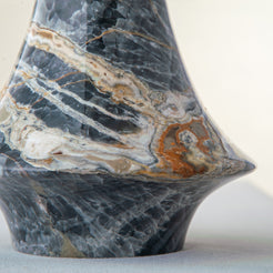 The Avenza Vase is a sculptural onyx piece defined by movement and balance. Its fluid, flared silhouette appears gently carved by time, with soft transitions between base and rim that give the form a sense of quiet dynamism. Natural veining flows across the surface in layered tones of charcoal, ash, and warm mineral accents, making each vase entirely unique.