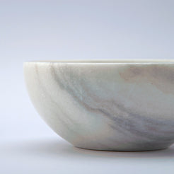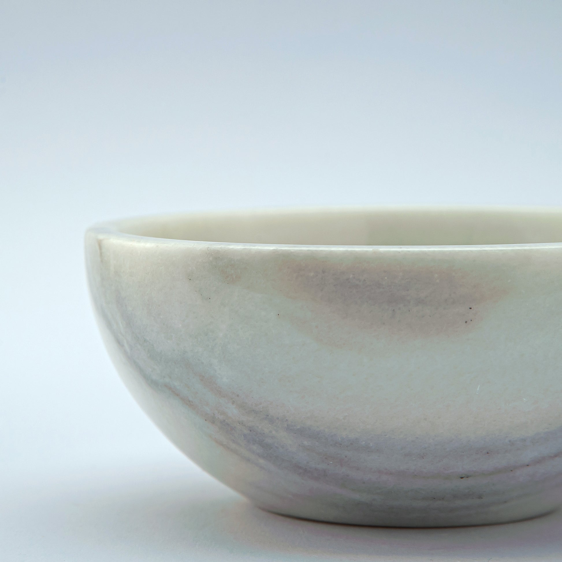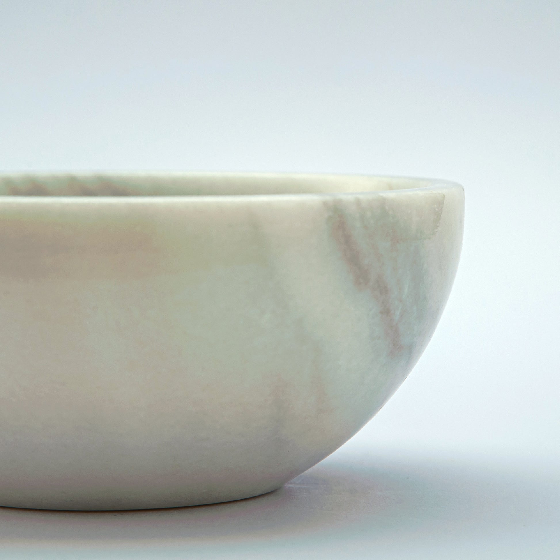 Bianca Bowl is a one-of-a-kind piece carved from pale marble in soft white and light gray tones, marked by delicate natural veining.