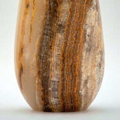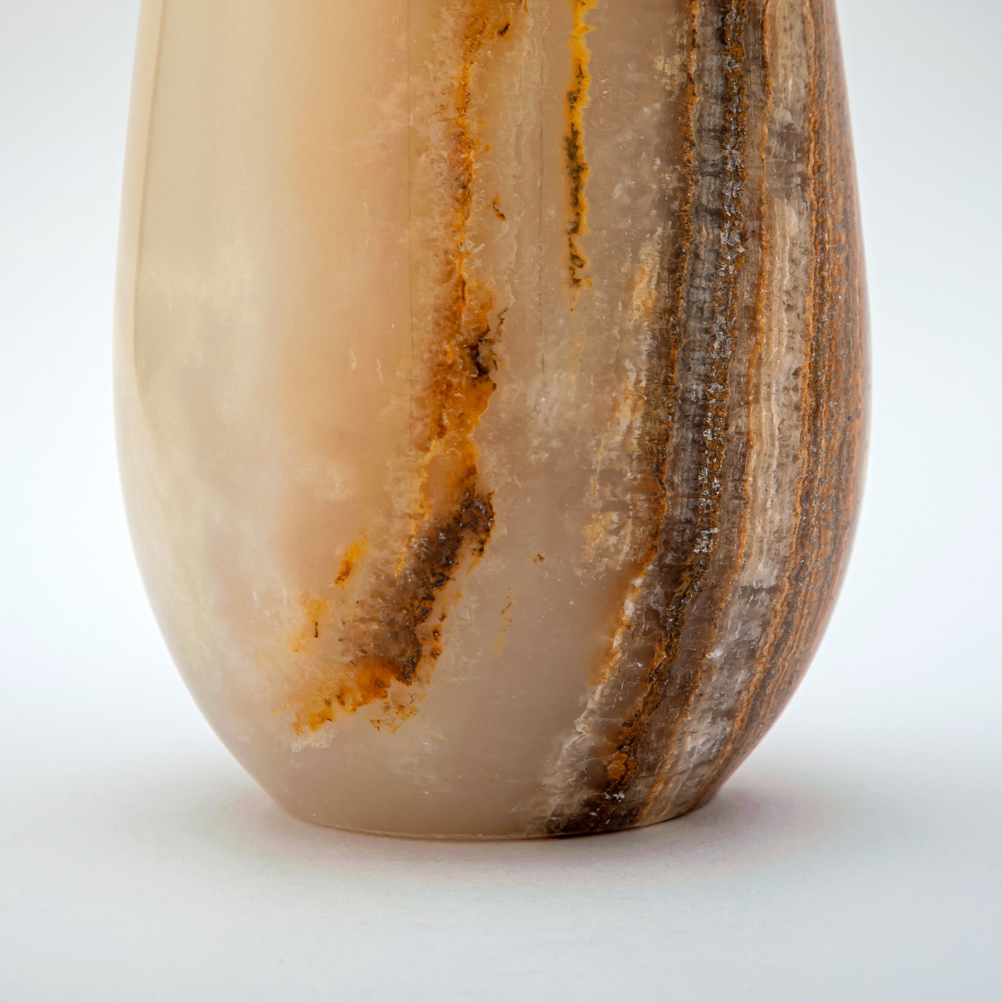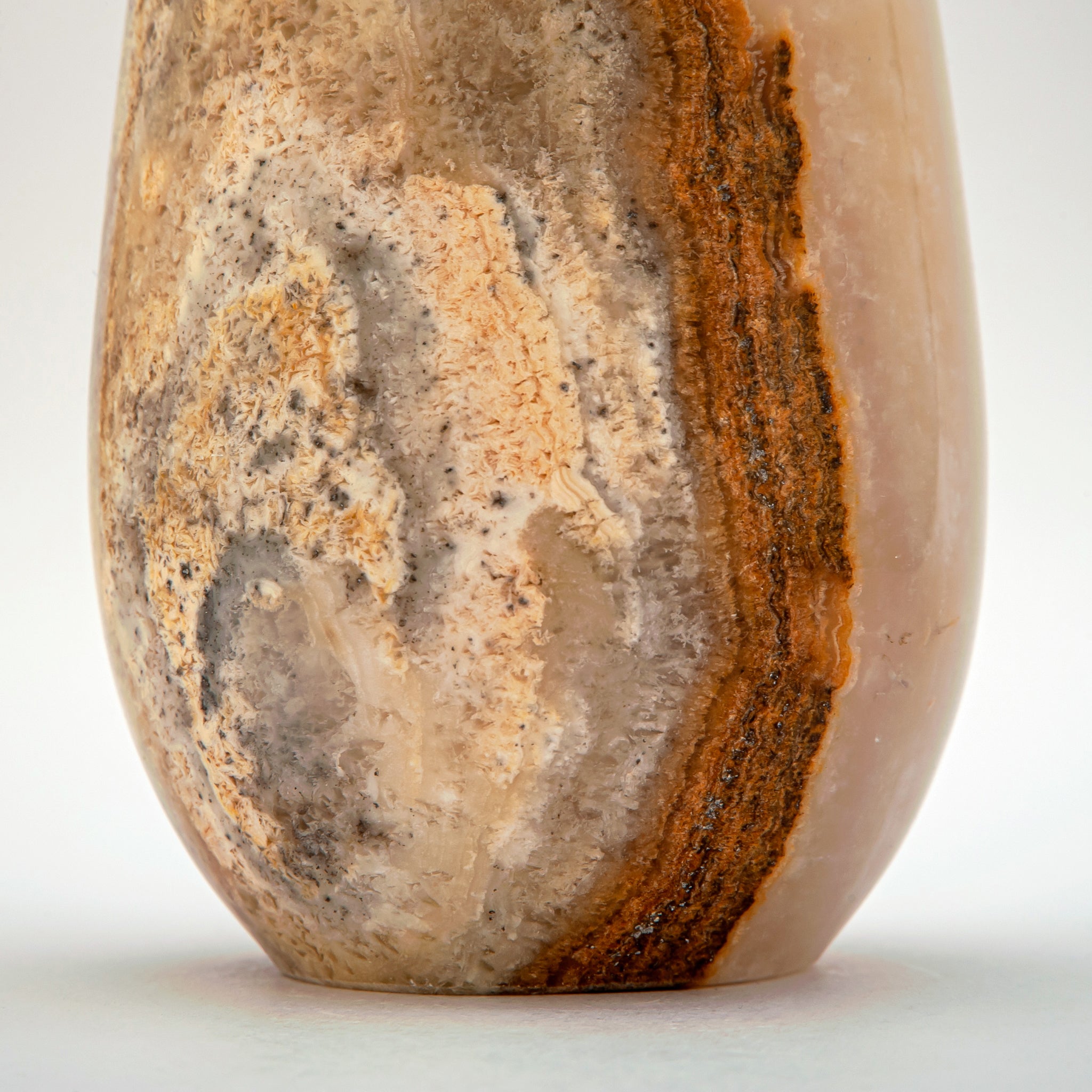The Brionne Vase is a testament to the quiet elegance of nature’s artistry. Hand-carved from richly veined onyx stone, its tall, slender form highlights warm beige, honey, and earthy brown tones that flow together in organic layers. The smooth polish enhances its natural luster, while the grounding hues give it a timeless and versatile presence.