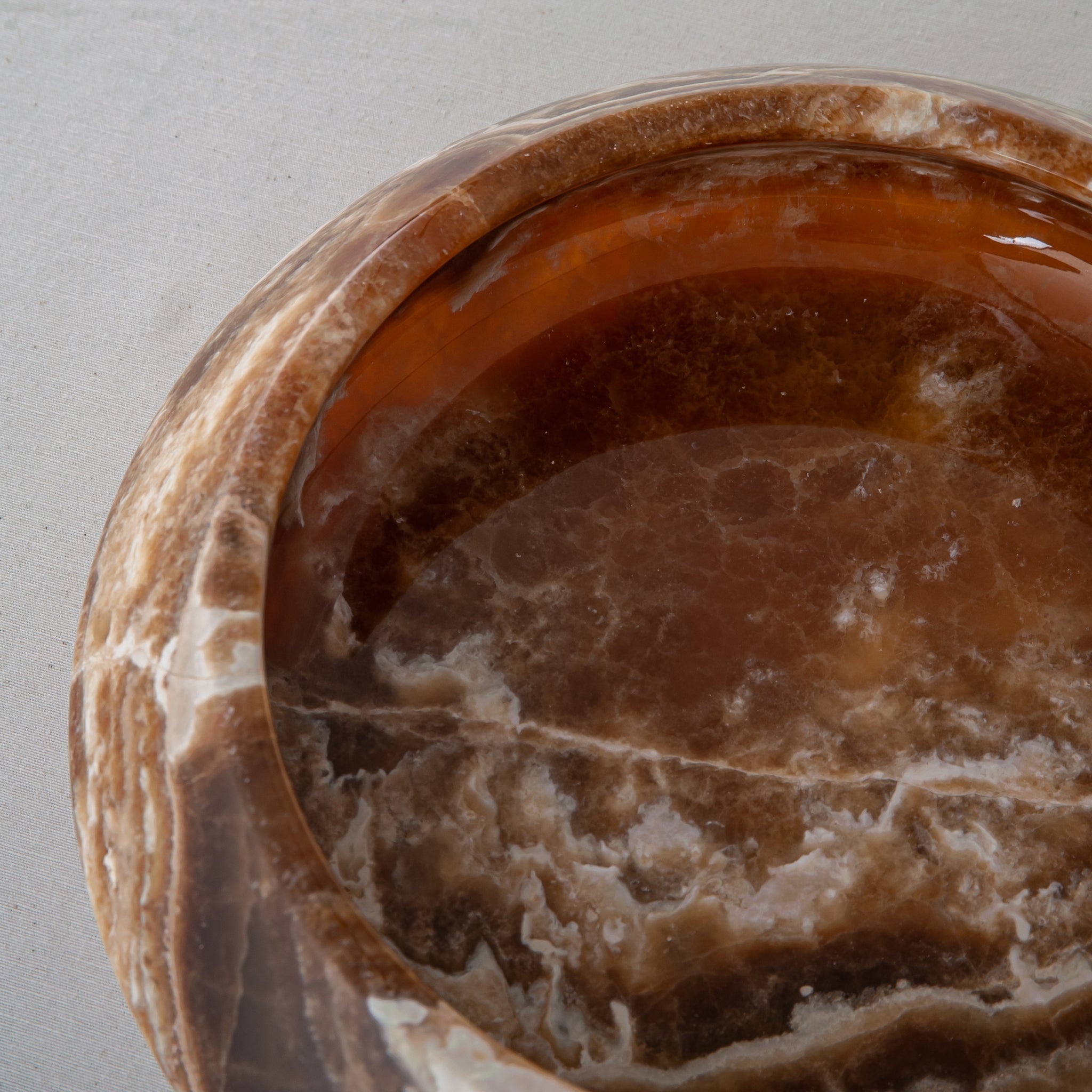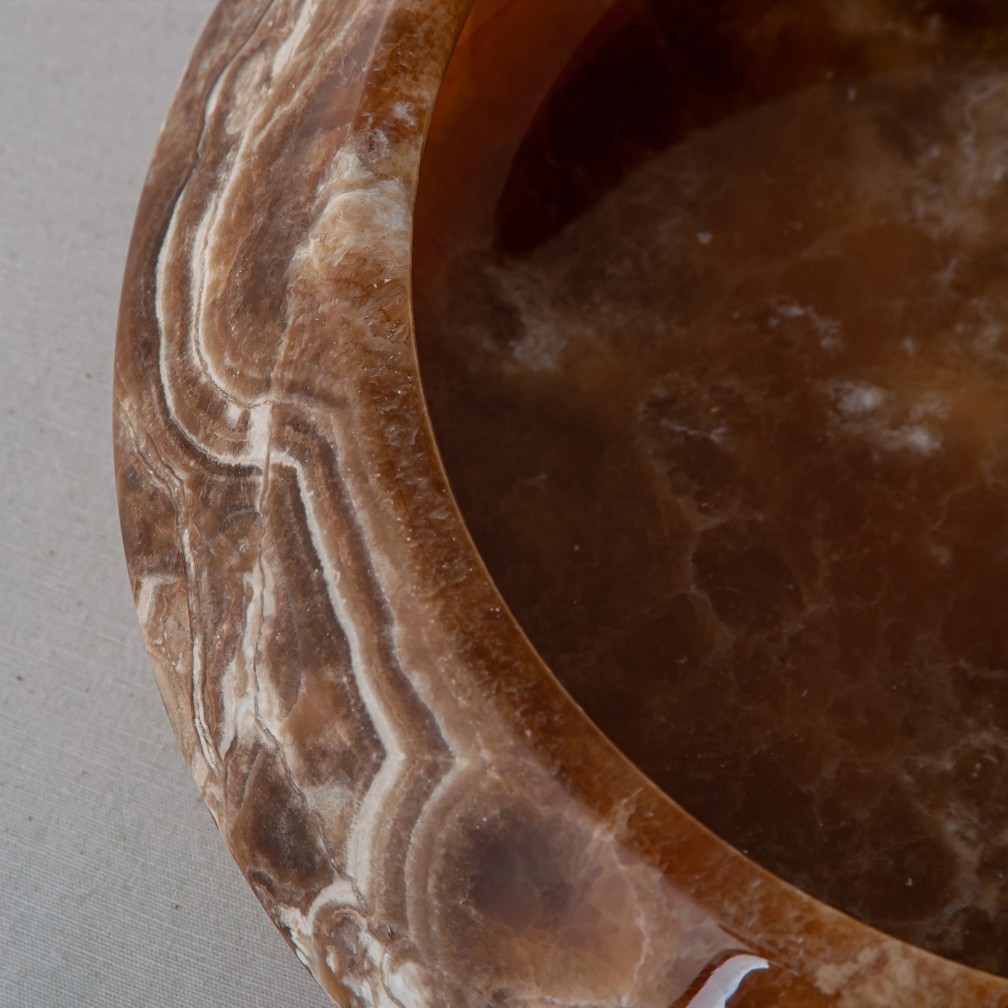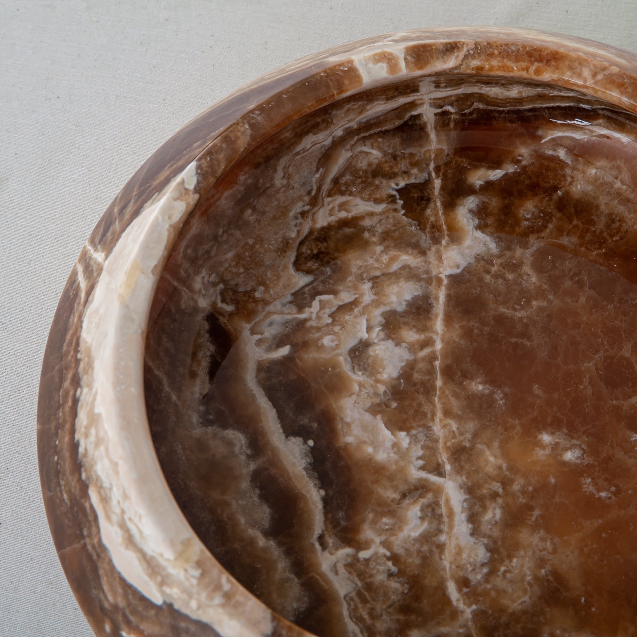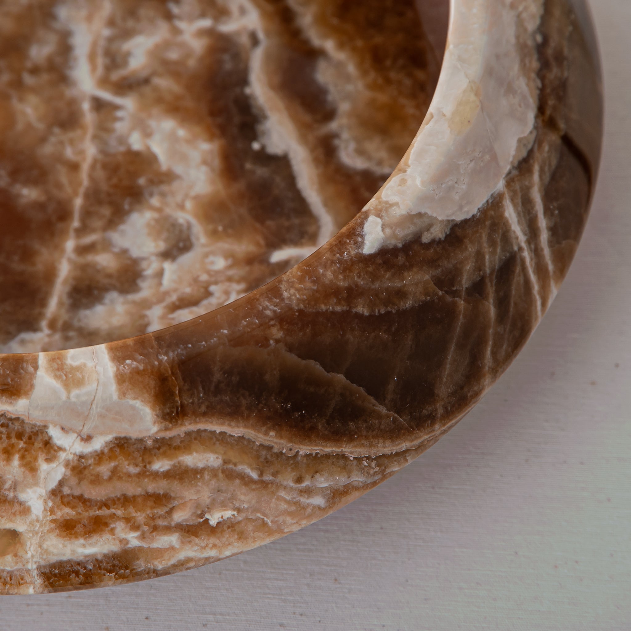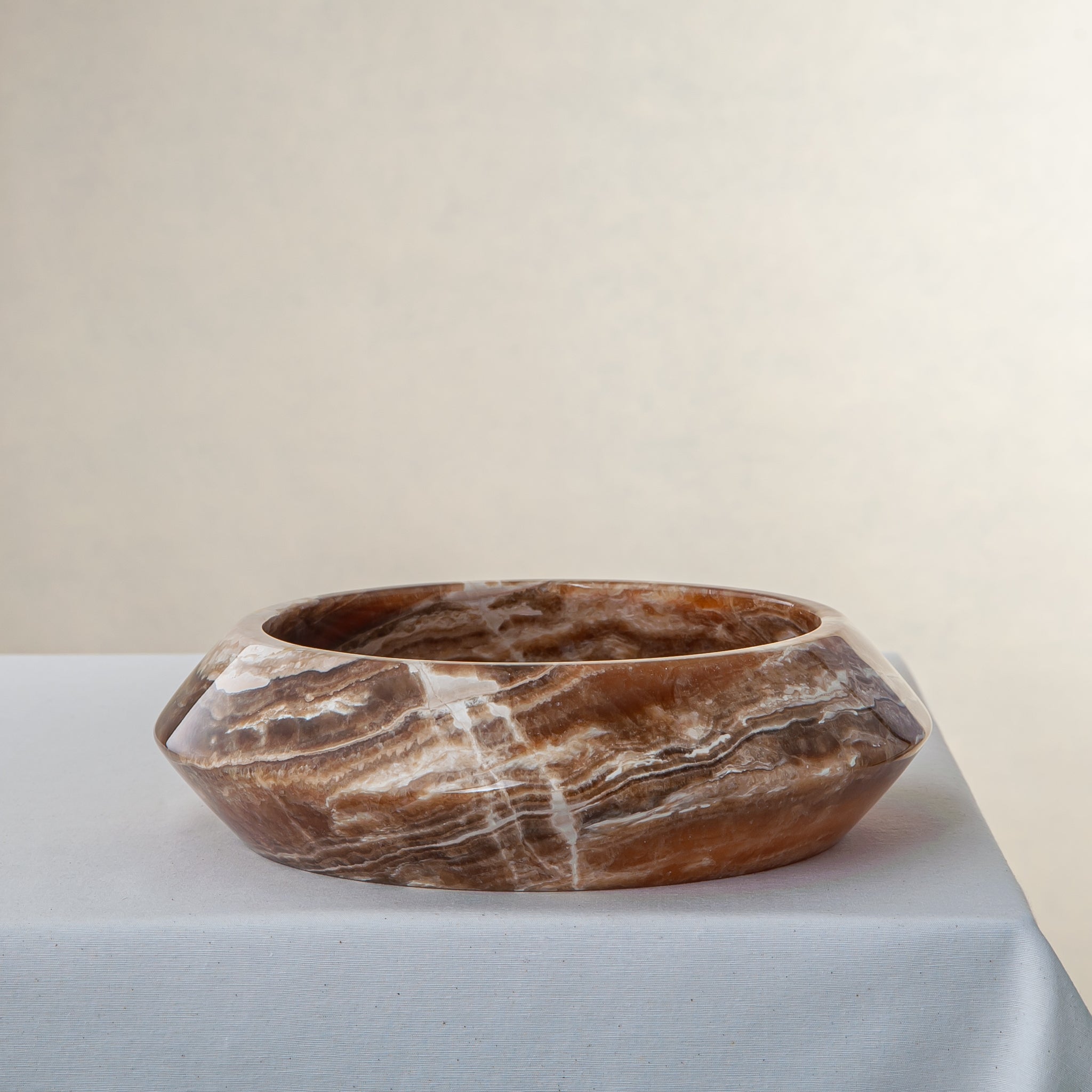 The Carvion Bowl is carved from the same exceptionally rare brown onyx as the Carvion Vase, creating a material dialogue between the two pieces. Warm amber, caramel, and honey-toned layers flow naturally through the stone, forming rich patterns that reflect its geological depth and origin.
