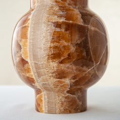 The Carvion Vase is sculpted from exceptionally rare brown onyx, distinguished by its warm amber, caramel, and honey-toned veining. The stone’s natural vertical movement creates depth and rhythm across the surface, giving the vase a strong yet refined architectural presence.